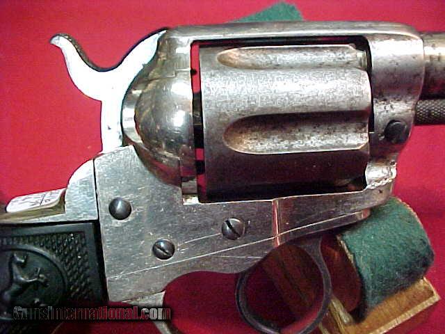 Description: #4995 Colt 1877-D/A “Thunderer”, 3-1/2”x41COLT, 3XXX( 1877, first year of production!!) and being the so called “Storekeeper or Sheriffs Model”, made without ejector. VG action, functioning both on S/A and D/A, and fine bore. Exterior retains about 60-70% original nickel blending in to smooth grey metal with minimal light pitting. VG+ one-piece checkered hard rubber grips that fit well enough, but not perfect, so it is possible that these could be off another gun. However, these are scarce very early style grips and proper for this serial range. Brilliant fire blue still remaing on the back of the hammer and trigger. This is a first year production gun, and overall a VERY decent Thunderer that should make a fine addition to a Colt D/A collection (….especially since the 1877 was the first model of the Colt D/As!!) VG+/Fine as described. $1595 SOLD Curio/Relic: Yes Antique: Yes |