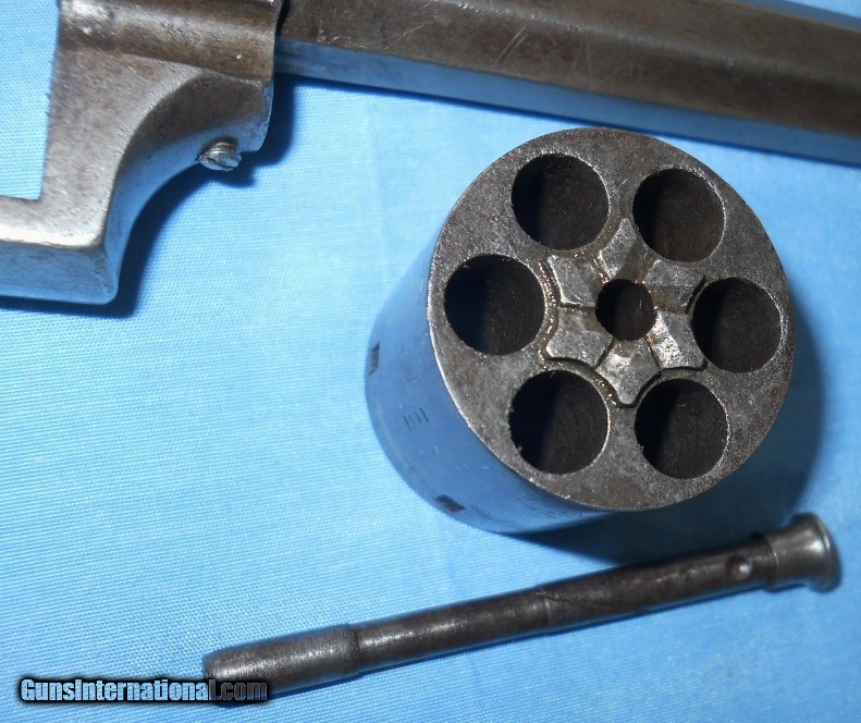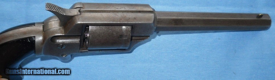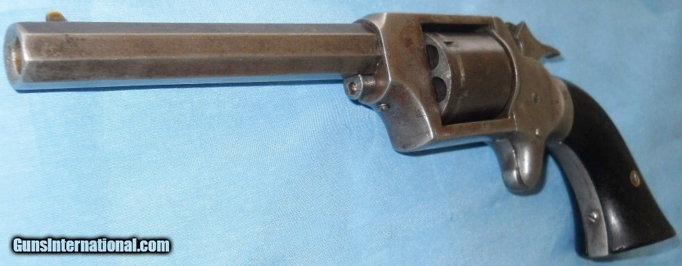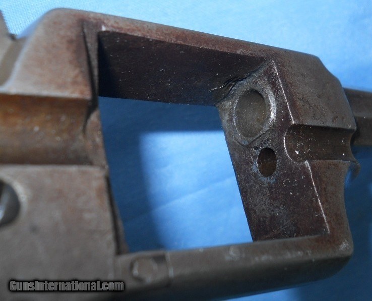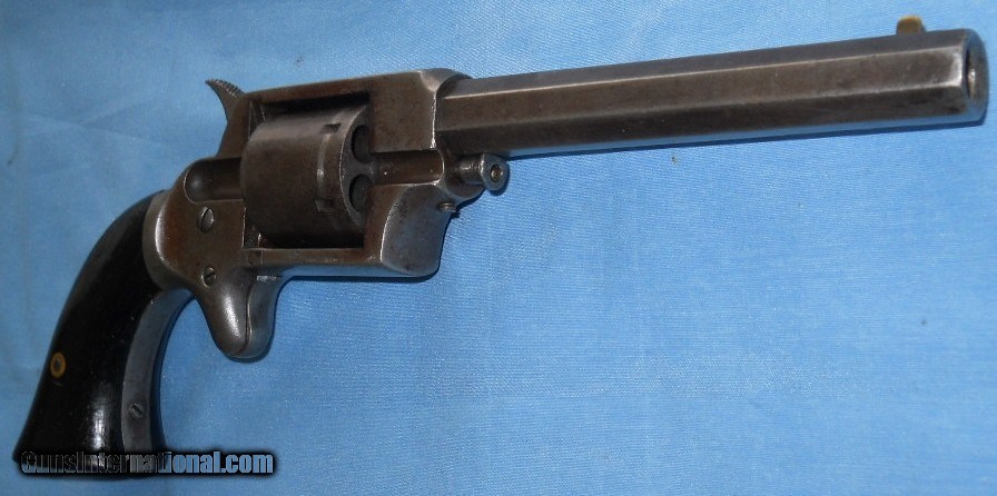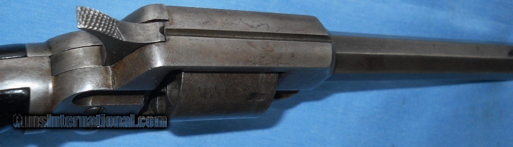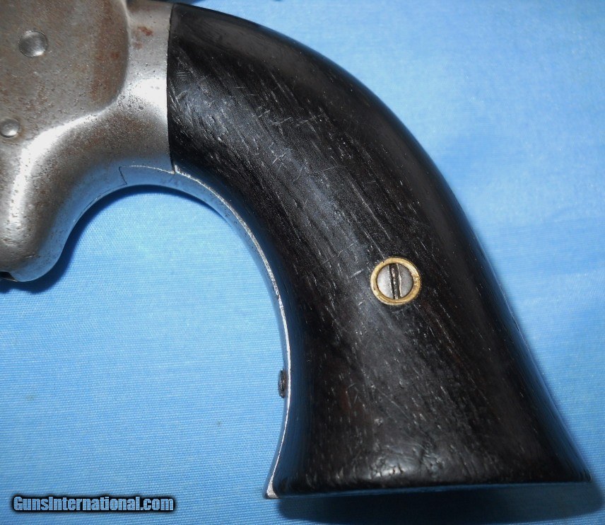 Description: ANTIQUE EARLY 1860s CIVIL WAR ERA SINGLE ACTION .32 RF CALIBER REVOLVER. 5" BARREL, STRONG BORE. METAL SURFACES HAVE MOSTLY TONED TO AN EVEN PEWTER PATINA. WALNUT GRIPS RATE VERY GOOD WITH RIGHT PANEL SMOOTHED CONTOUR FOR A RIGHT HANDED SHOOTER. ACTION IS CRISP & ROBUST, SOLID TIMEING & CYLINDER LOCKUP WITH TWO CLICK HAMMER. LOTS OF INFO ABOUT WM. URLINGER AND HIS AVOIDING SMITH & WESSONS PATENT INFRINGEMENT. VERY GOOD EXAMPLE OVERALL IN USEABLE CONDITION, AS PICTURED. $ 20.00 S&H DIRECT TO BUYER ANYWHERE THAT'S OK. SEE ALL "ESTATE ANTIQUES" LISTINGS FOR MORE SCARCE ITEMS AT SENSIBLE PRICES FROM OLD TIME COLLECTIONS. SOLD Antique: Yes Manufacturer: DD CONE WM. UHLINGER Serial Number: 1436 MATCHING Barrel Length: 5 Caliber Info: .32 RF Bore: LIGHT PITTING Chambers: CLEAR Condition: VERY GOOD AS PICTURED Metal Condition: ORIGINAL Wood Condition: AS PICTURED Bore Condition: STRONG RIFLING Barrel Type: OCTAGON Action: CRISP & TIGHT Triggers: SPUR Finish: ORIGINAL AGED Sights: FACTORY ORIGINAL Manufacture Date: EARLY 1860s |