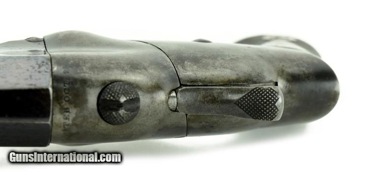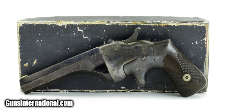 Description: Hammond Bulldog Single Shot .44 Henry Rimfire caliber. With correct original box. Note: Hammond boxes are unlabeled and totally unmarked. We have sold boxed Hammonds in the past and they were in unmarked boxes like this one. Bore has very good rifling and some scattered pits. Bore is mostly bright. Barrel has approximately 93-95% blue. The frame has about 60-70% case colors. Hammonds are unusual loading action which, with the push of the top release button swings the breech block to the left allowing the .44 Henry cartridge to load. Grips are excellent. Scarce boxed rig. SOLD Antique: Yes |