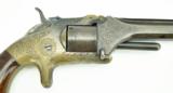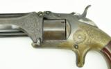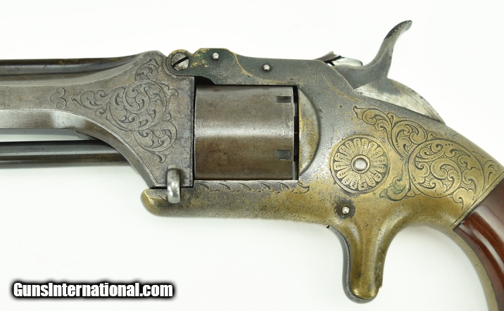 Incredibly Rare 1st Model Plant. Factory engraved this, is a super rare gun! It’s a factory engraved Plant 1st model that has no markings. Gun is factory engraved. Only trace amounts of the original blue are on the barrel where is mostly a smooth brown patina. The frame has 20% or so of the silver plated finish. Grips are excellent. Barrel is 5” long where the standard is 6”. This gun is also much closer in size to a Smith & Wesson #2 Army than a regular size plant. Flayderman’s describes these as “resembling an oversized S&W #2 Army”. Since these 1st models are so scarce, we do not have another to compare it to. Due to this gun not having any markings or serial number, we are unsure if this is a prototype or maybe one of the inventor’s guns, or both. Very interesting gun. We also welcome any input if you have information on this piece.