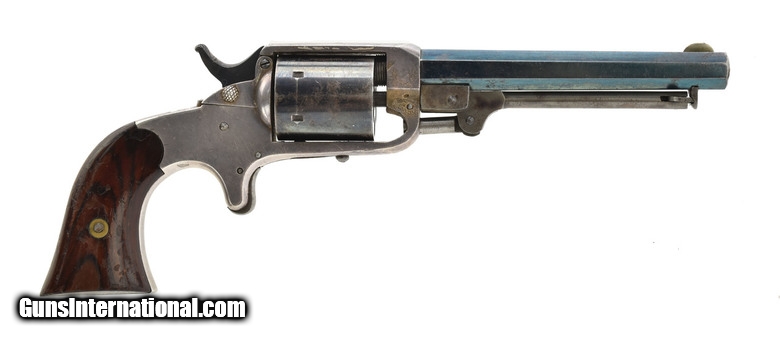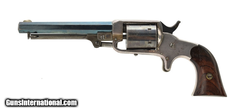 James Reid Model 4 Pocket .32 caliber revolver. .32 Caliber with a 5” barrel. Very fine gun with 95% of the original finish. Barrel and cylinder have almost all of the high polish finish. The silver plating on the frame is near 100%. Case colors remain on the lever. Grips are very good. They show no wear, but the varnish finish has flaked away to where it rates at 50%. Very fine gun!