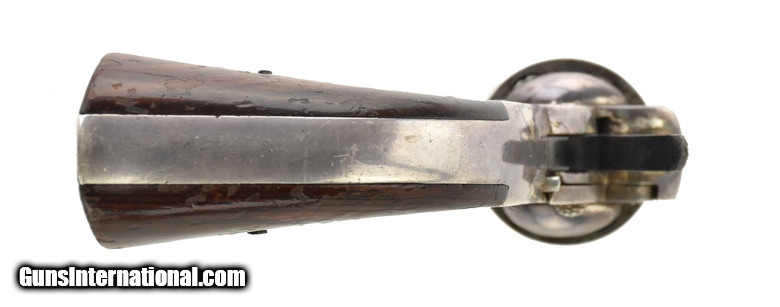 Description: James Reid Model 4 Pocket .32 caliber revolver. .32 Caliber with a 5” barrel. Very fine gun with 95% of the original finish. Barrel and cylinder have almost all of the high polish finish. The silver plating on the frame is near 100%. Case colors remain on the lever. Grips are very good. They show no wear, but the varnish finish has flaked away to where it rates at 50%. Very fine gun! SOLD Curio/Relic: Yes |