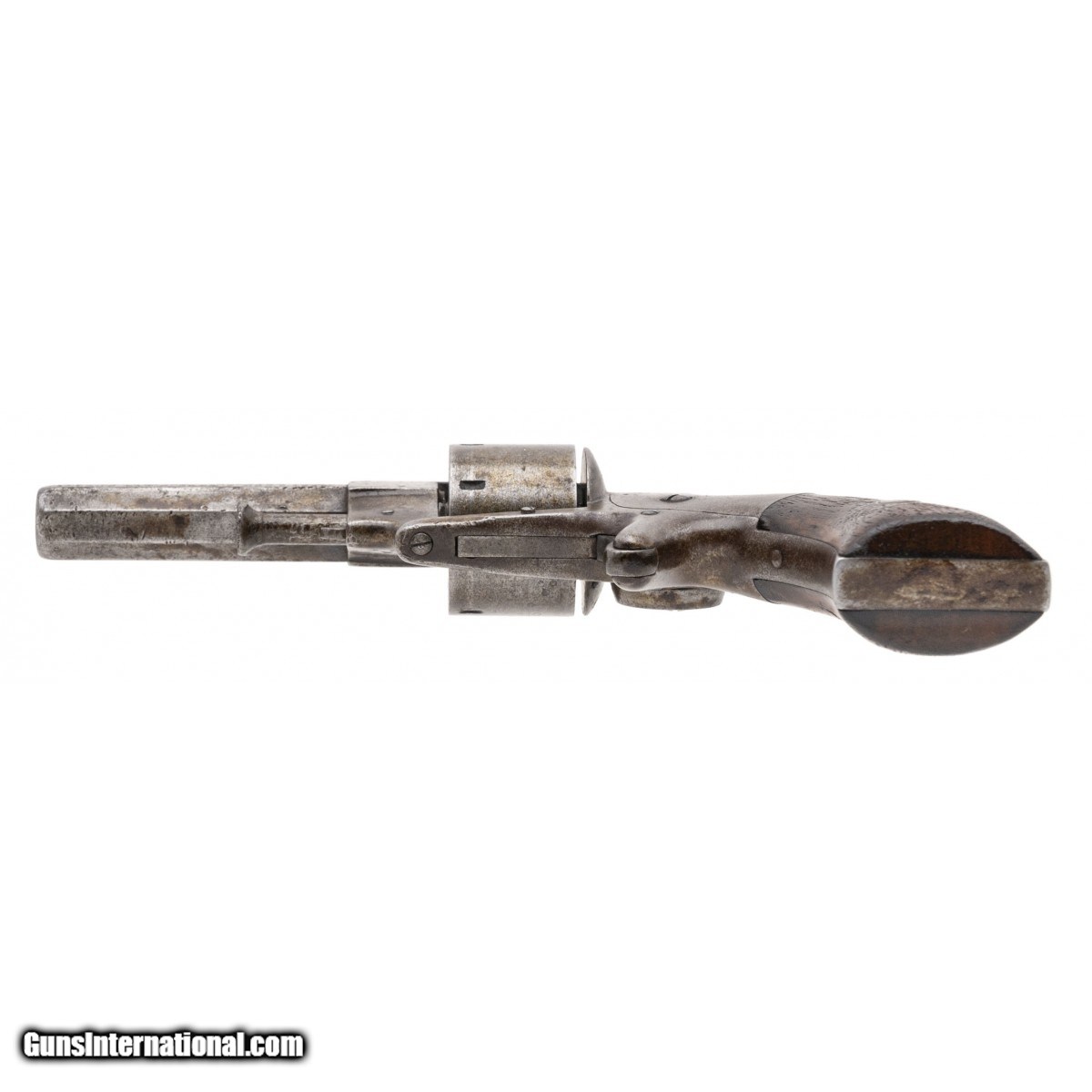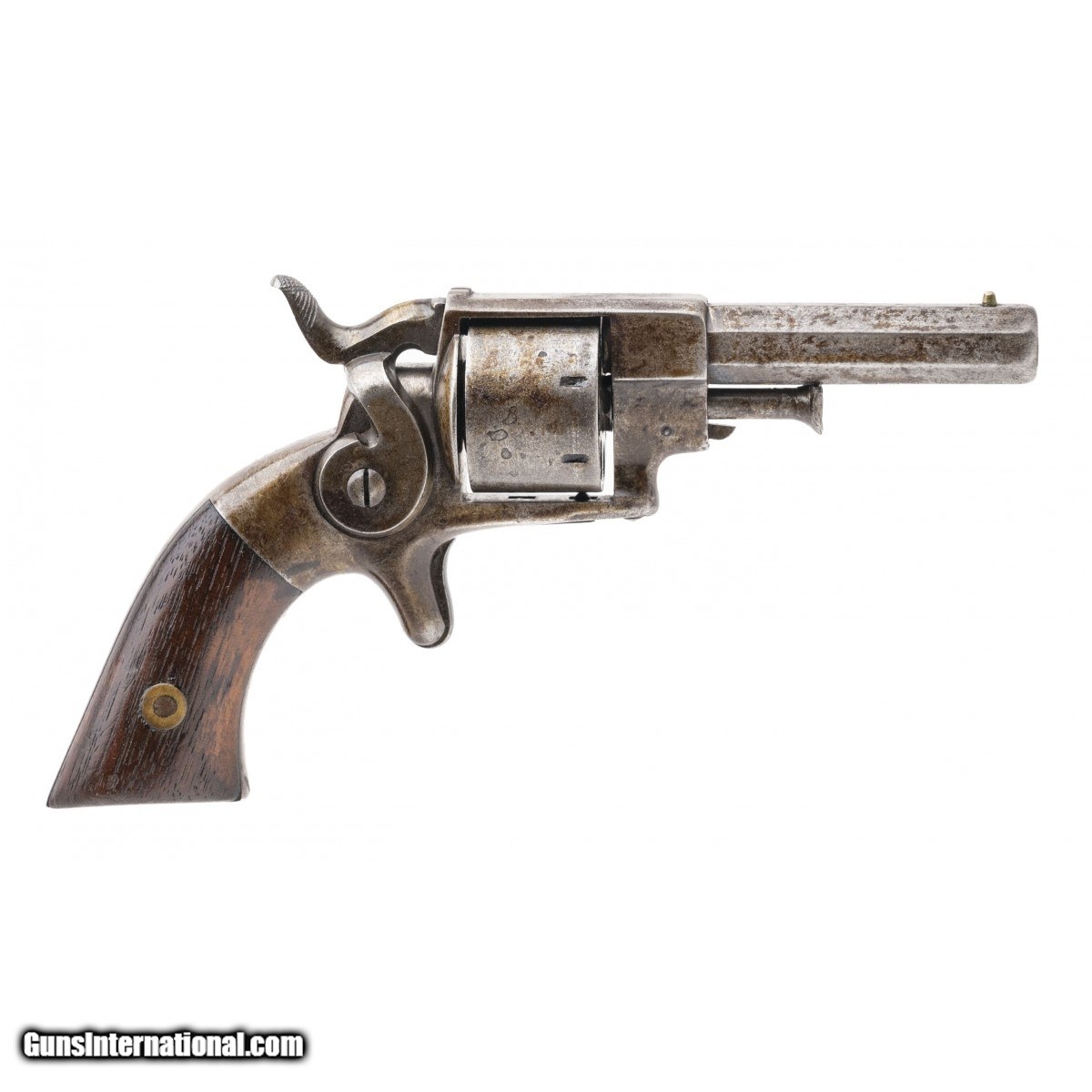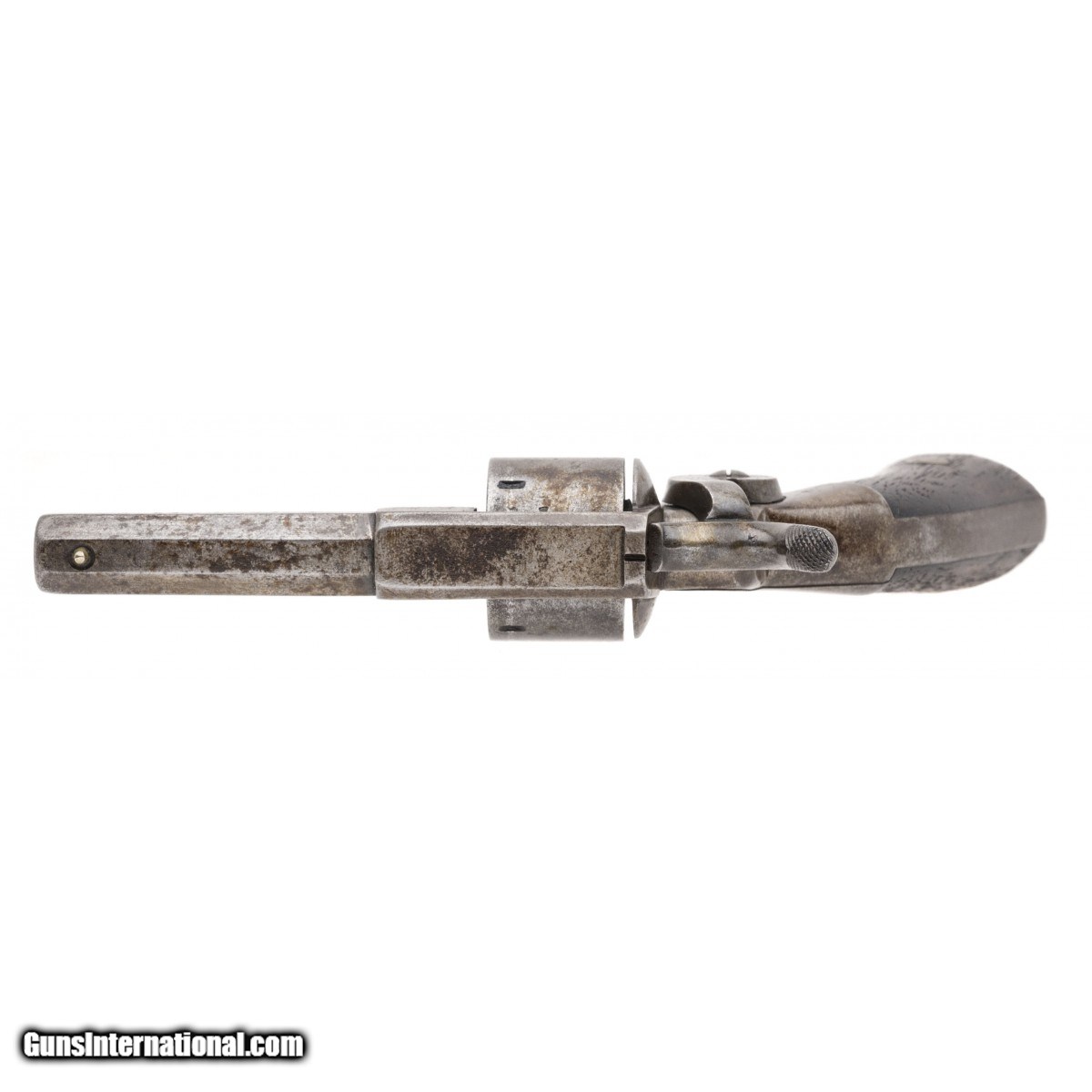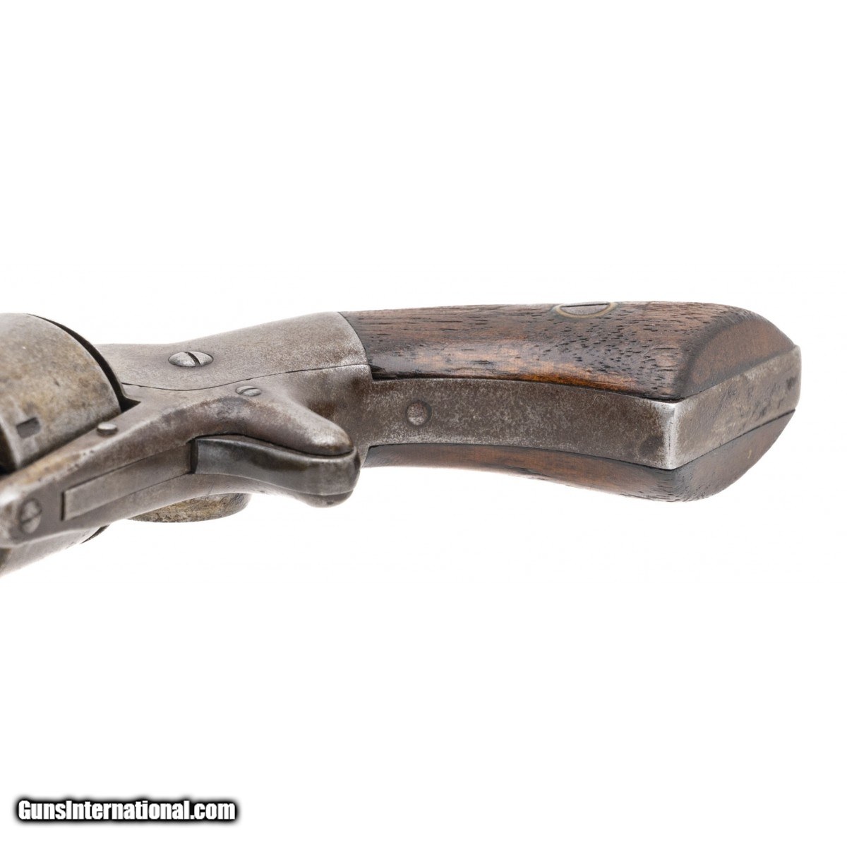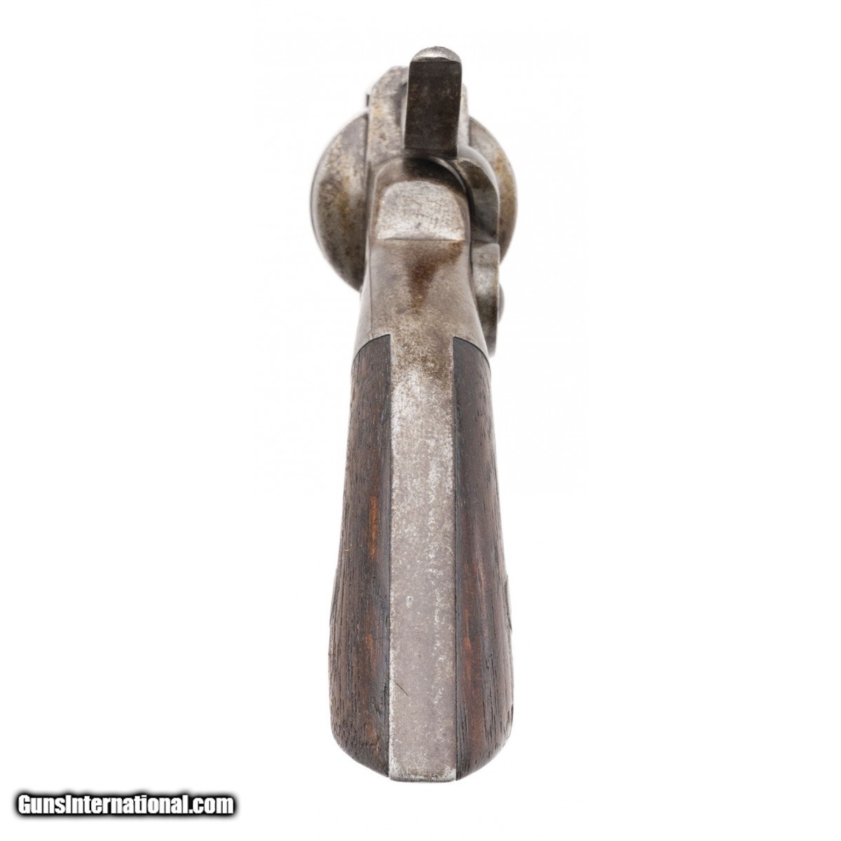 Description: " NSN, circa 1858-1865, .22RF, 2.5"" octagonal barrel marked "" ALLEN & WHEELOCK. WORCESTER. MSUS/ALLEN'S PAT'S. SEPT 7 NOV.9.1858"" Bore is poor with oxidation visible in the lands and grooves. Metal is a grey/brown patina, grips are good with light handling wear. Action functions but timing is off. Consignment SOLD Antique: Yes |