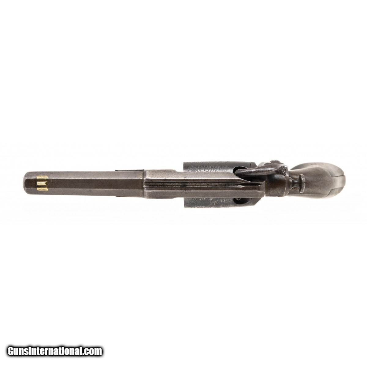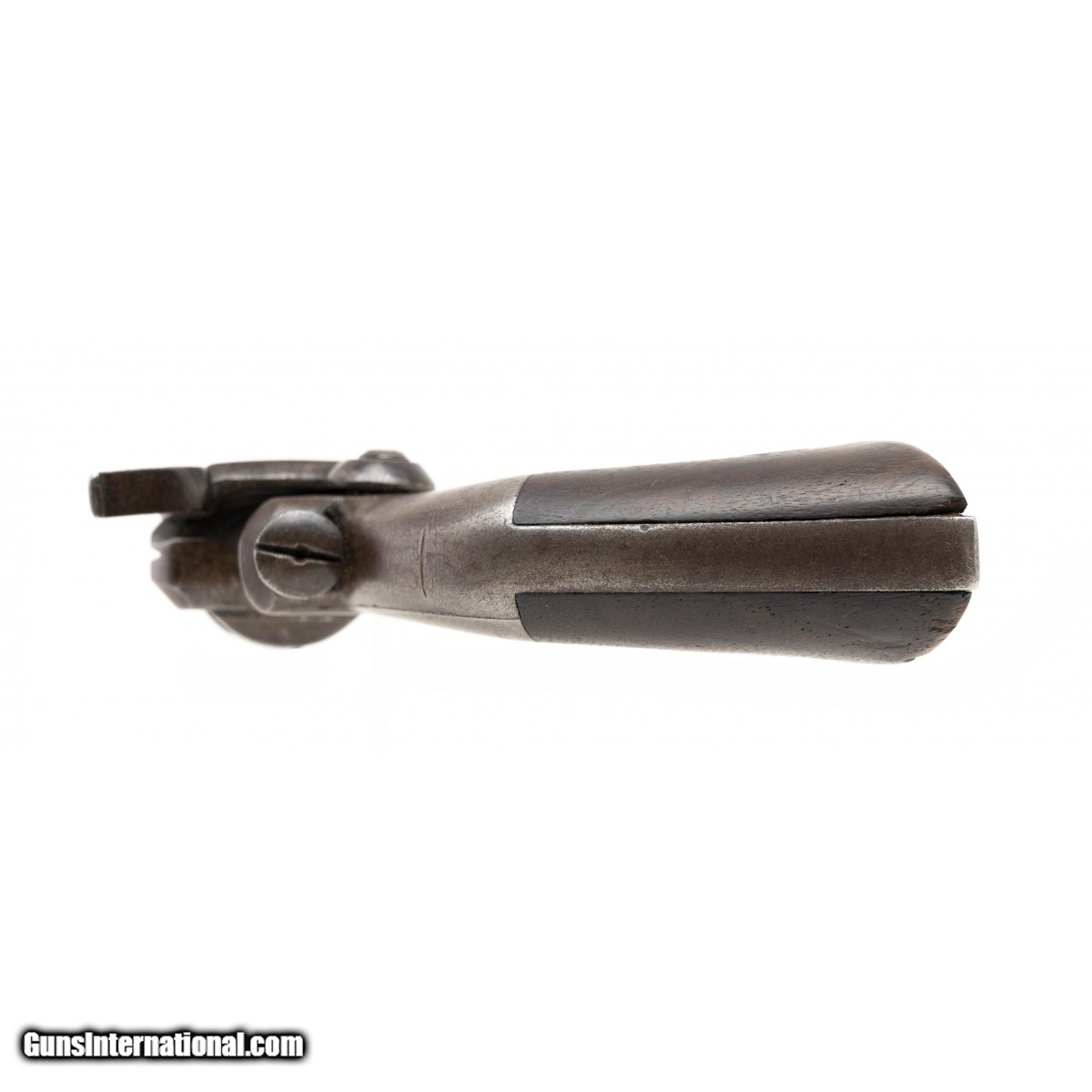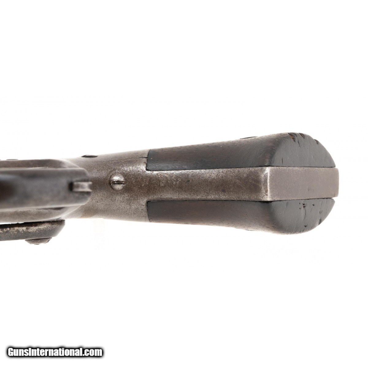 Description: " Caliber is .32. Barrel length is 4"". Bore is good. Manufactured 1858-1861. Cylinder scene is a deer in a forest setting. Grips are good and have three notches on the left side bottom edge. The spring loaded release below the trigger allows the trigger guard lever to open forward and engages the ram rod for loading. Barrel address is legible. A not often found Allen & Wheelock. SOLD Antique: Yes |