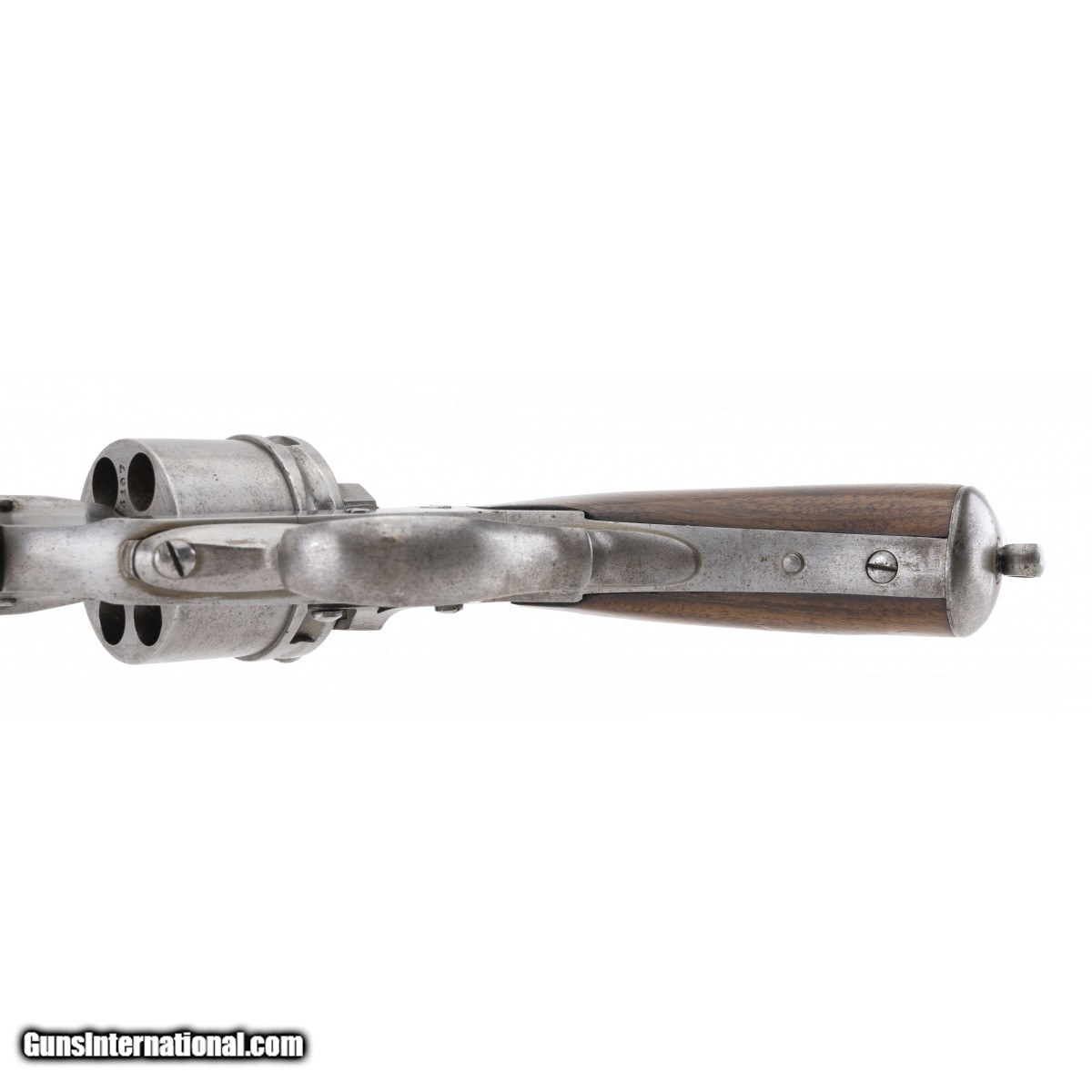 Description: " This fine cartridge Perrin revolver is totally unmarked with the exception of the serial number, 6107, which is on the frame, barrel, and cylinder. Because of the lack of inspection, proof, and other marks we believe this Perrin revolver was most likely manufactured for a foreign government. The overall length is approx. 11.5"". The 5.5"" round 12mm thick rim Perrin centerfire cartridge barrel has an excellent rifled bore. The front sight is a tall narrow blade and the rear is a sighting notch along the top strap. The entire revolver is bright with a few areas of light spotting. The grips are excellent. The lanyard ring is present. The action functions properly in single and double action. This is a super Perrin cartridge revolver that is rarely seen. Don't miss it! SOLD Antique: Yes |