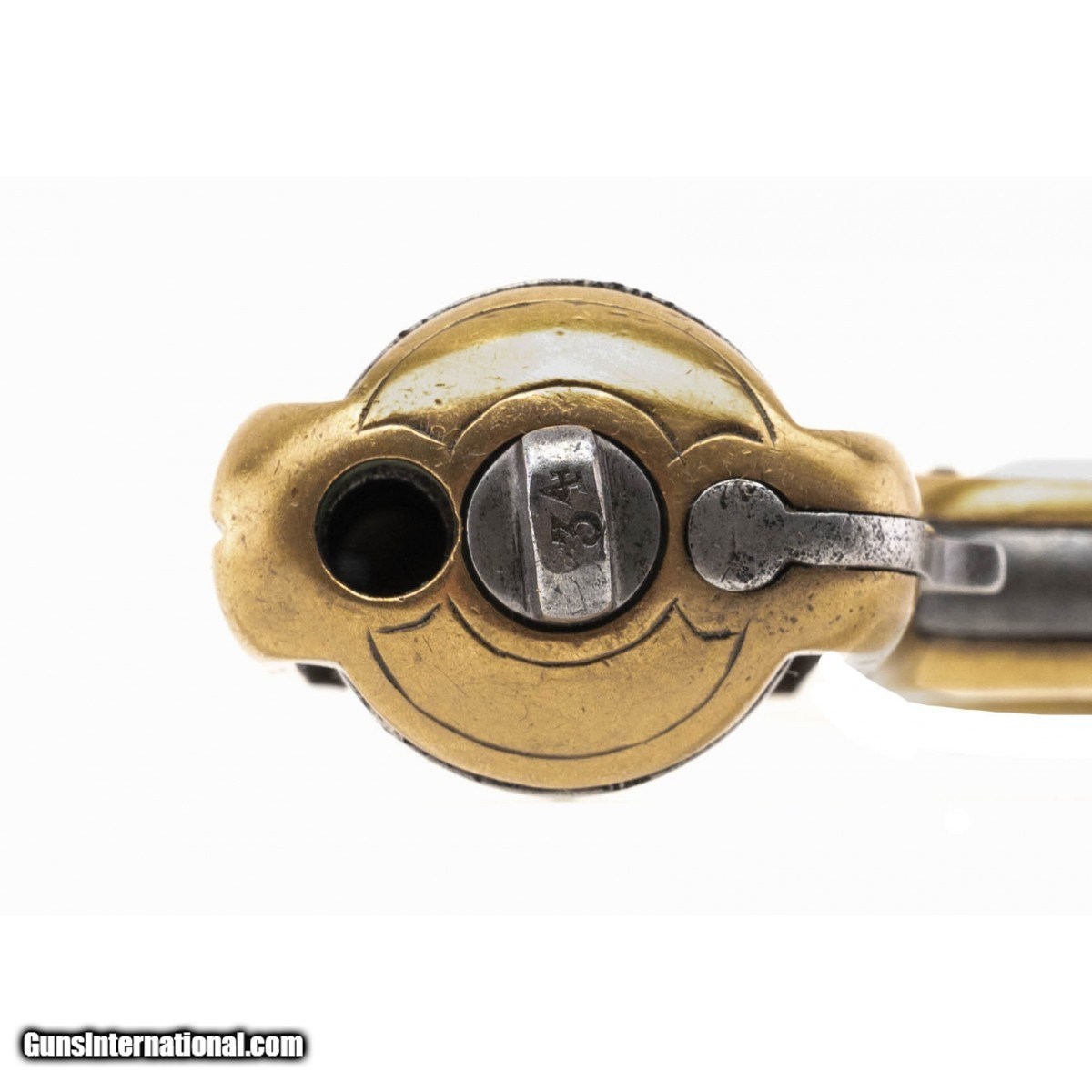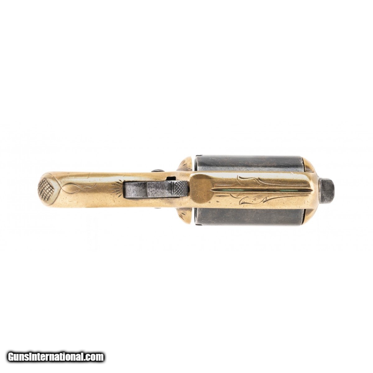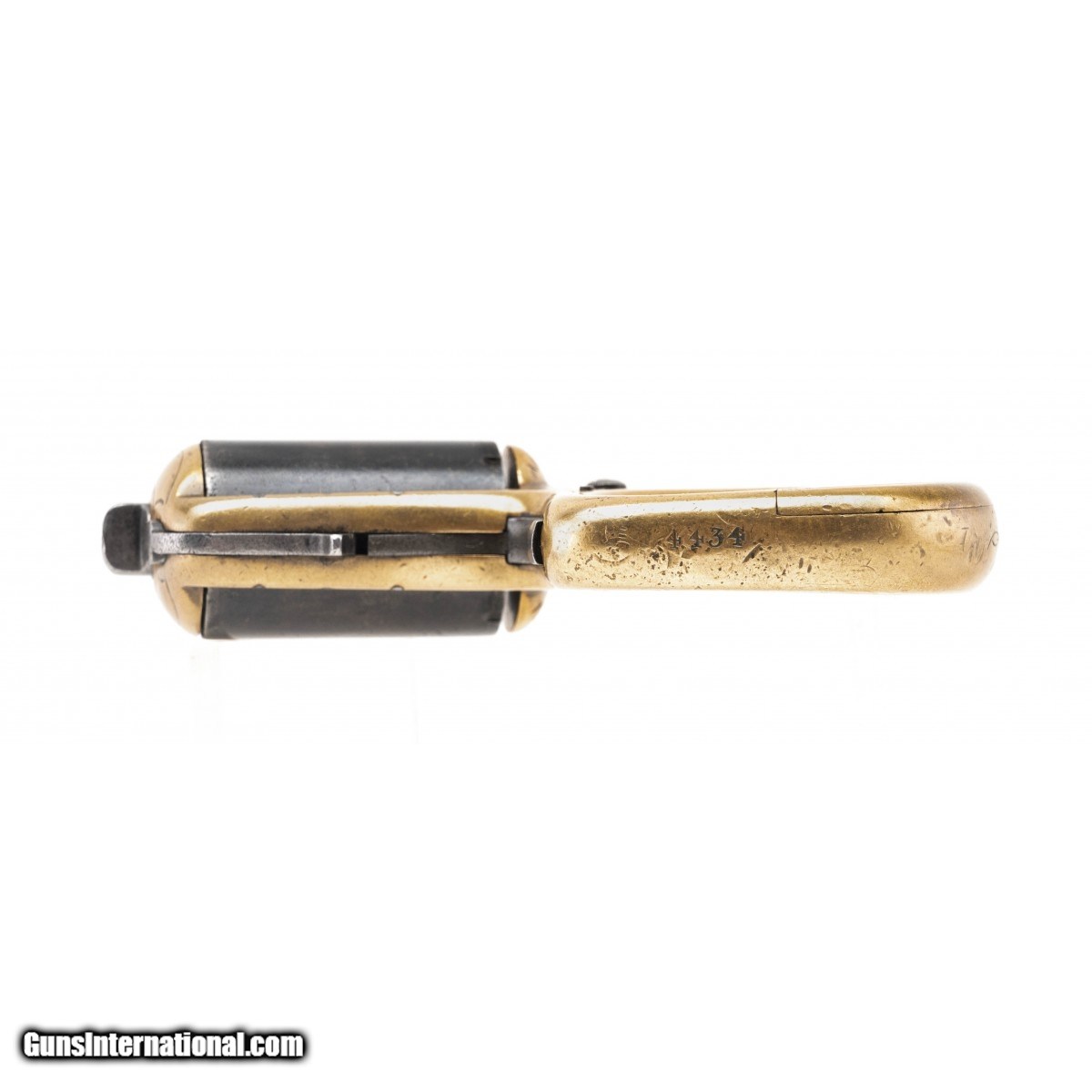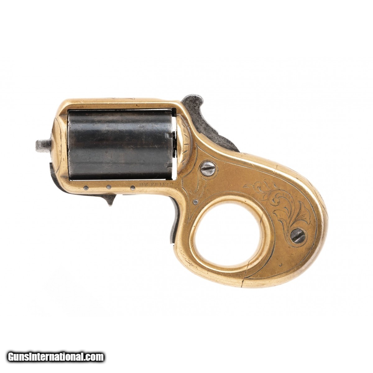 This is an early Reid seven-shot 22 caliber rimfire revolver with the sliding safety device that locks the cylinder at a mid point. The left side of the frame has the desirable early MY FRIEND marking below the cylinder. The brass frame has decorative scroll engraving. The blued cylinder has turned a smooth plum. The serial number is 4434 with the cylinder pin being numbered with the last two digits, 34. The action functions correctly. This interesting and distintive revolver can also be used as brass knuckles for fighting.