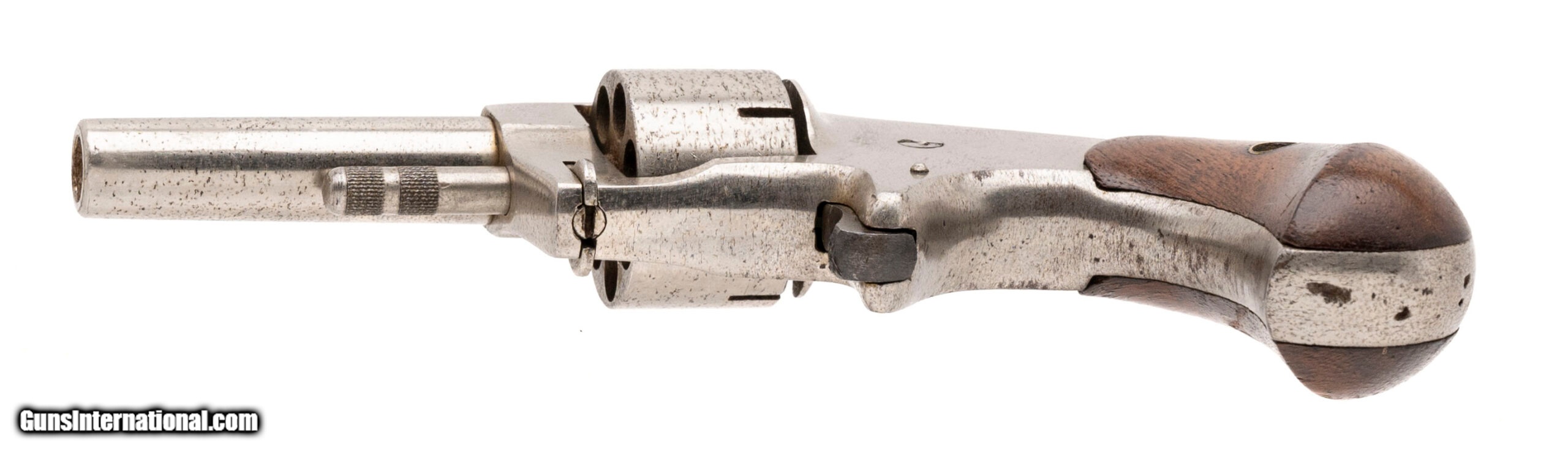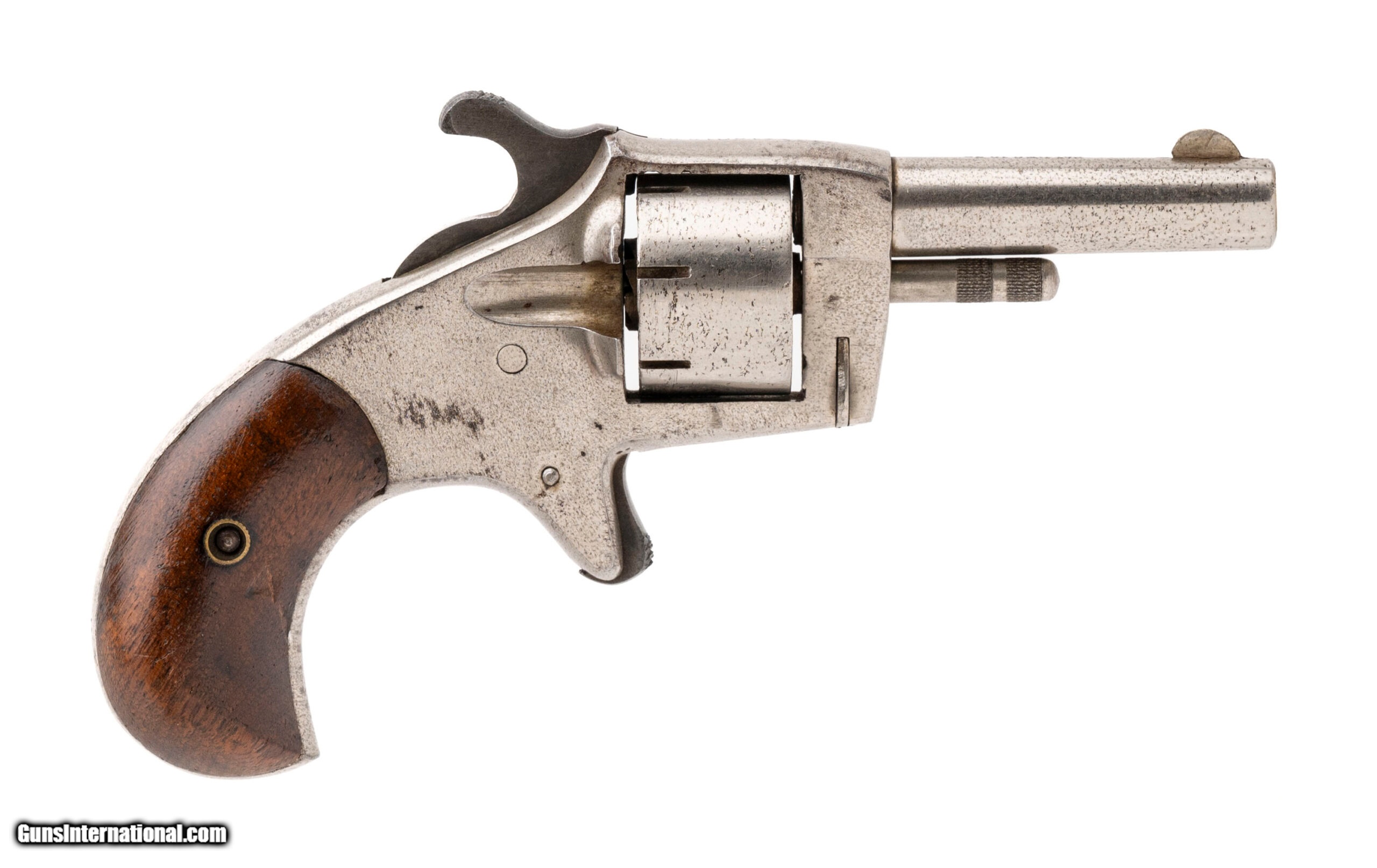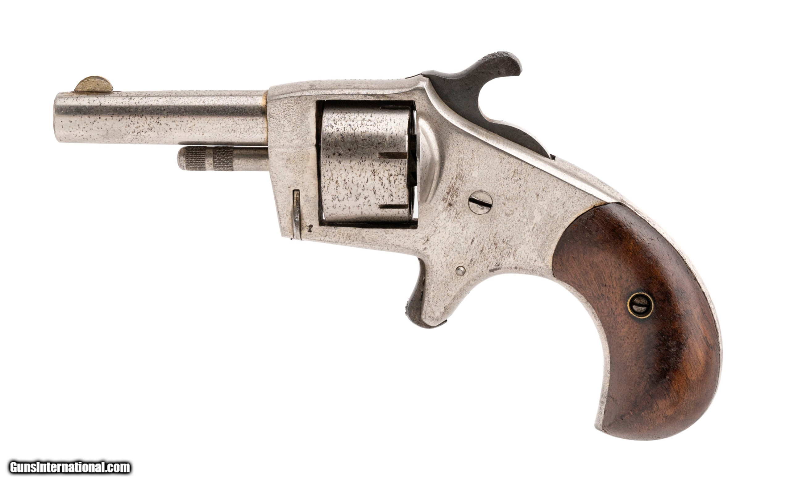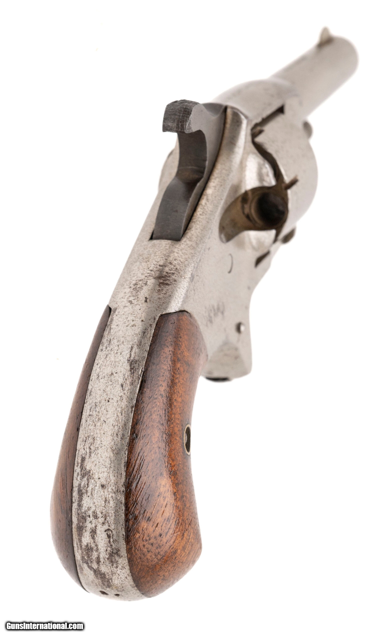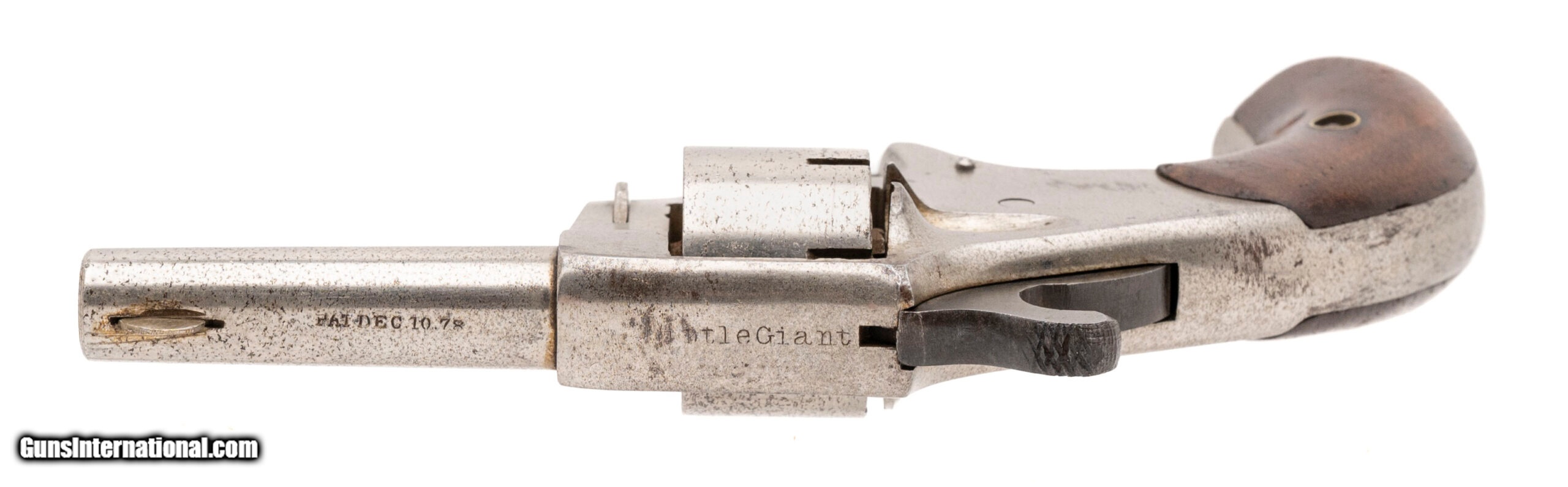 Description: "NSN, circa 1880’s, .22 short, 2" round barrel. This 22 Short rimfire caliber LITTLE GIANT spur trigger revolver retains approx.95% of its nickel finish. The 2"" round barrel has a fair bore. The top of the barrel is marked PAT DEC 10 78 and the top strap is marked LITTLE GIANT with the LITTLE being lightly struck. The grips are fine with no cracks or chips. The action is stiff but it functions correctly. SOLD Antique: Yes |