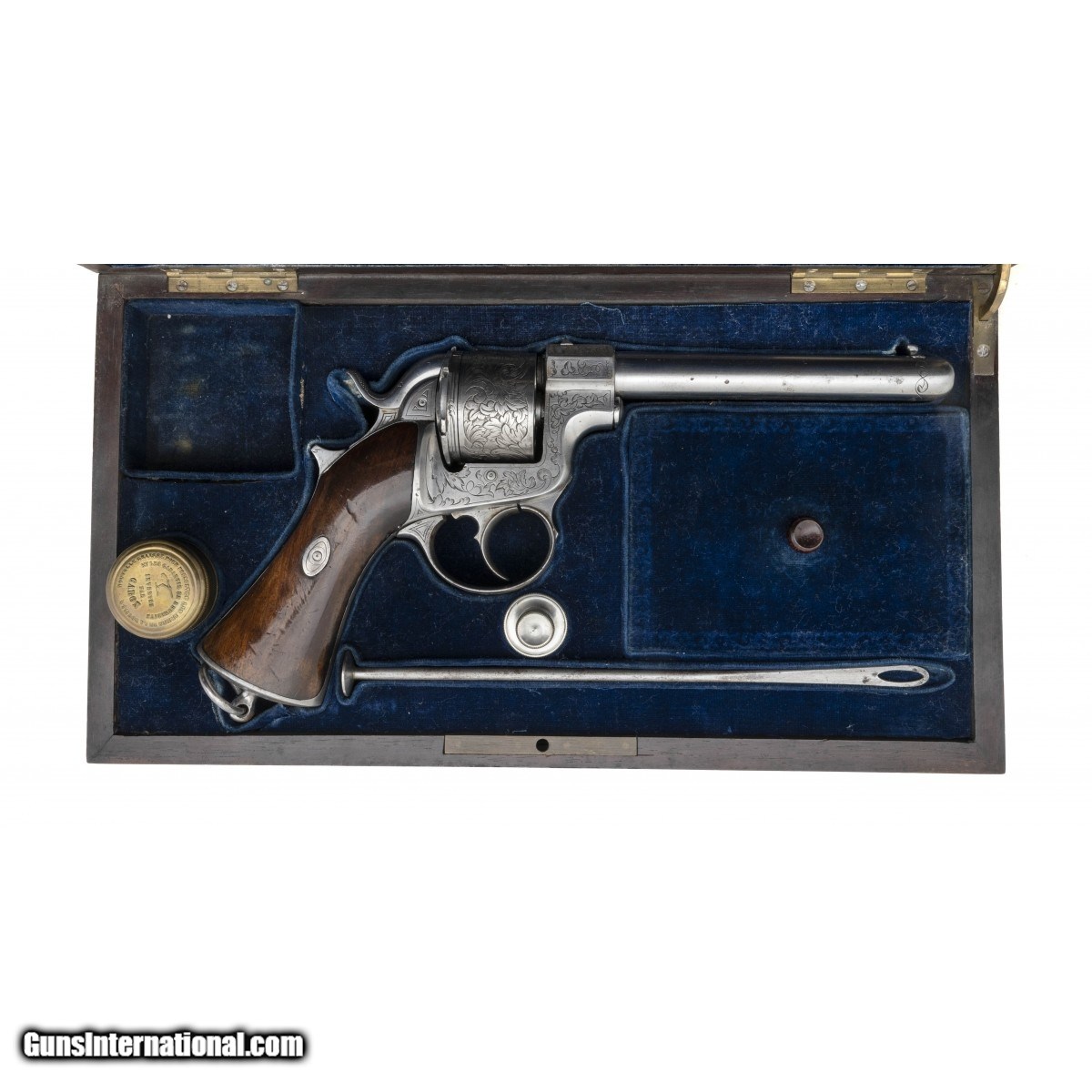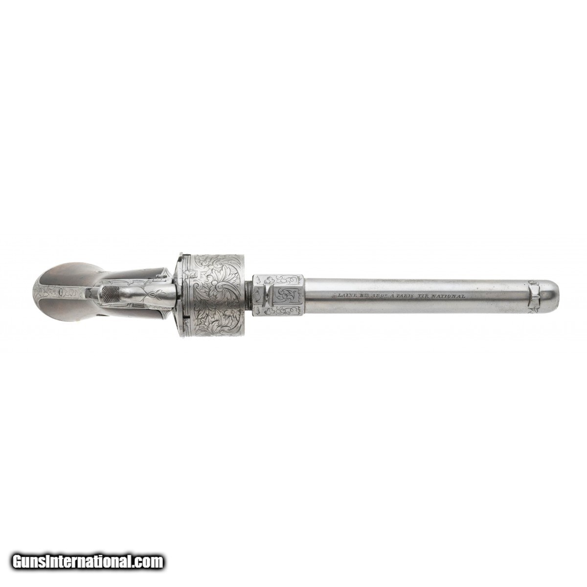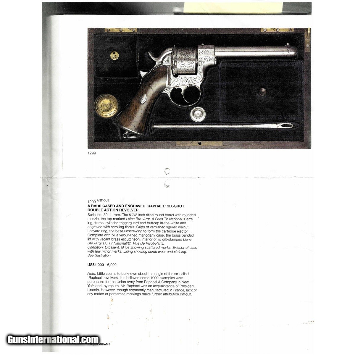 Description: "Serial number 39. Made circa 1860s. 11 mm caliber with a 5 7/8". Gun is in excellent to mint condition on the metal. This gun is in a factory case. The barrel and inside top of the case are both marked with variations of the address “Laine B TE / ARQ Du TIR National/ 21 Rue De Rivoli/ Paris" Very scarce deluxe Raphael Revolver! SOLD Antique: Yes |