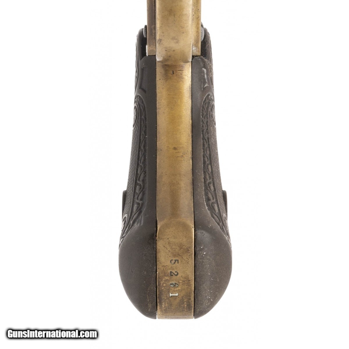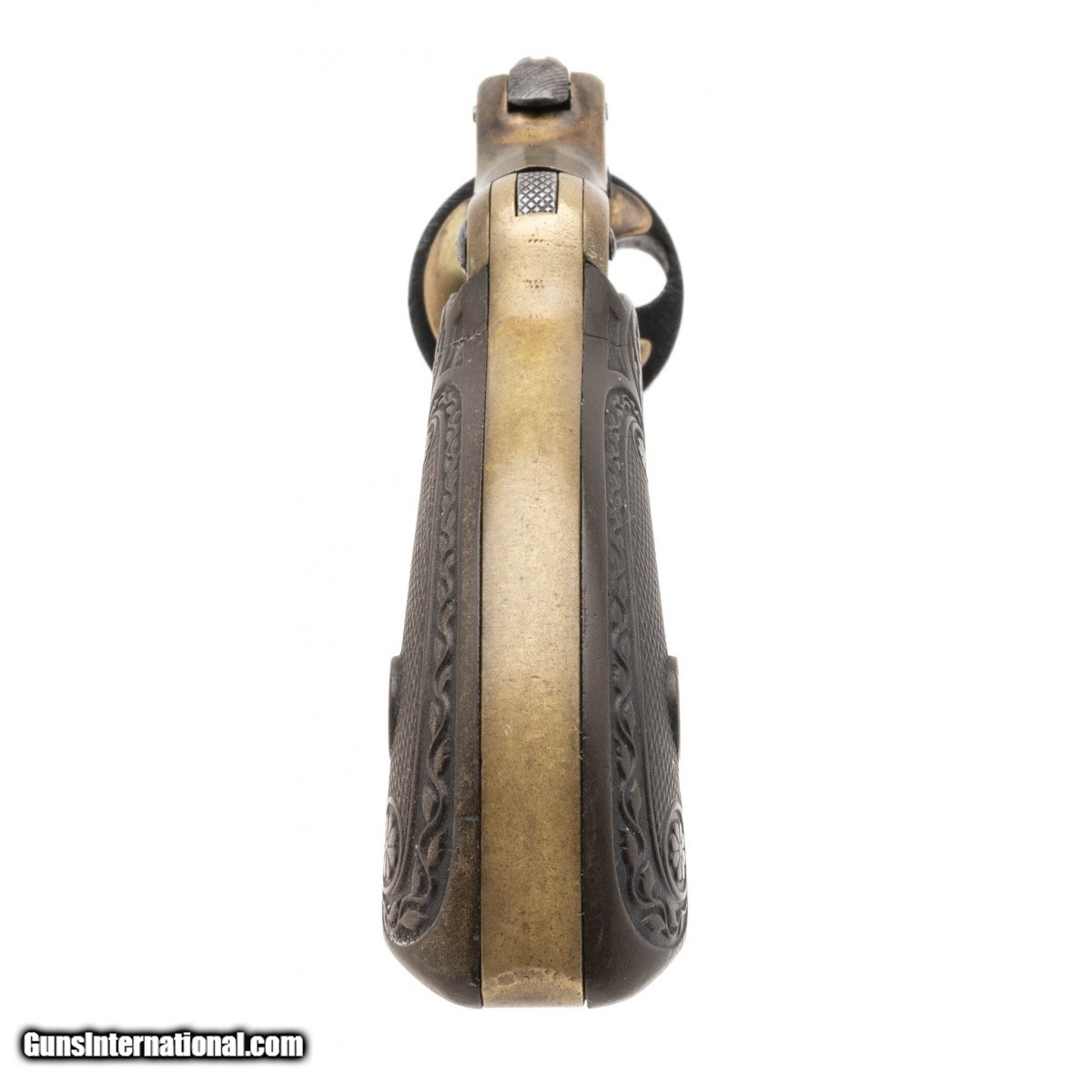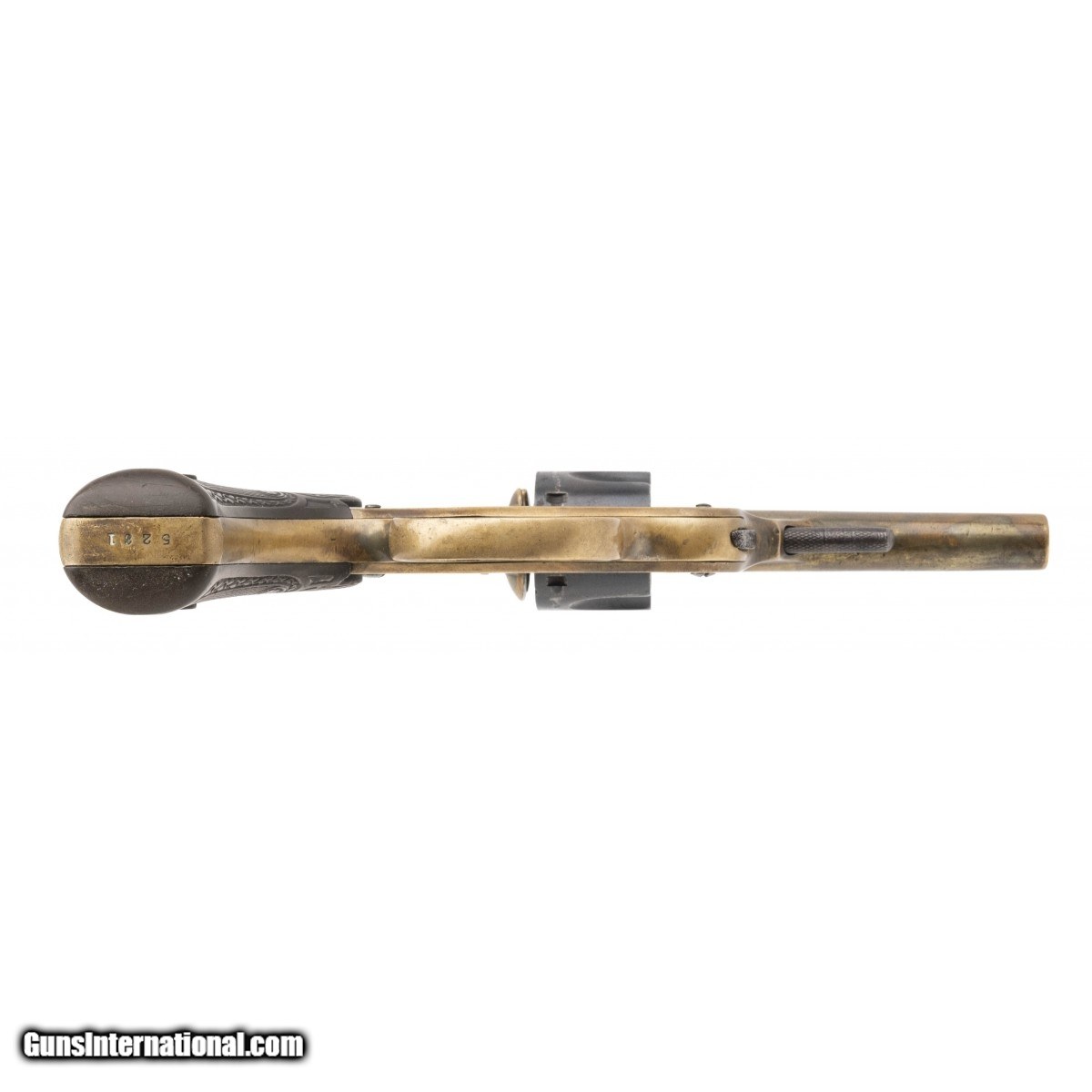 Description: " With its all brass frame and BARREL, the 32 centerfire caliber Spencer Safety Hammerless revolver is an American firearms oddity. A few thousand were made by Otis A. Smith, Rockfall, CT, circa the 1890s. In addition, this revolver is unusual in that the barrel top rib is marked MALTBY, HENLEY (EY are dented) & CO, NEW YORK. U.S.A. over PAT. JAN. 24. 1888 & OCT. 29. 1889. Maltby, Henley & Co. were Smith's New York agents. The 3 3/16"" brass barrel has a very good bore with strong rifling. The cylinder. trigger, and internal parts are the only iron parts. This revolver also features a thumbwheel safety on the top rear of the frame. The safety operates but is very stiff and the revolver may have to be disassembled to reset it. The grips are very good with the left having a solid repair at the top. The action functions correctly. If you are ito early and unusual American cartridge revolvers, this one by Otis Smith is a must. SOLD Antique: Yes |