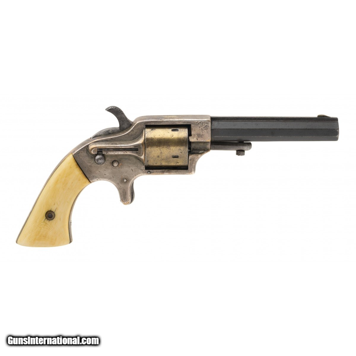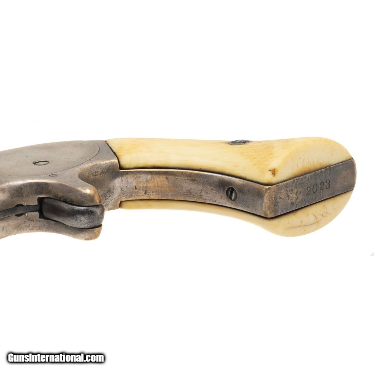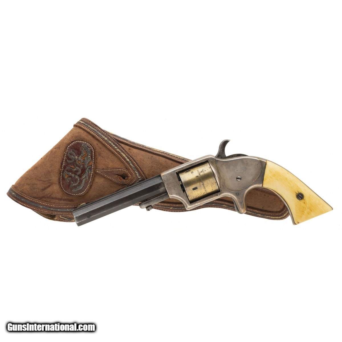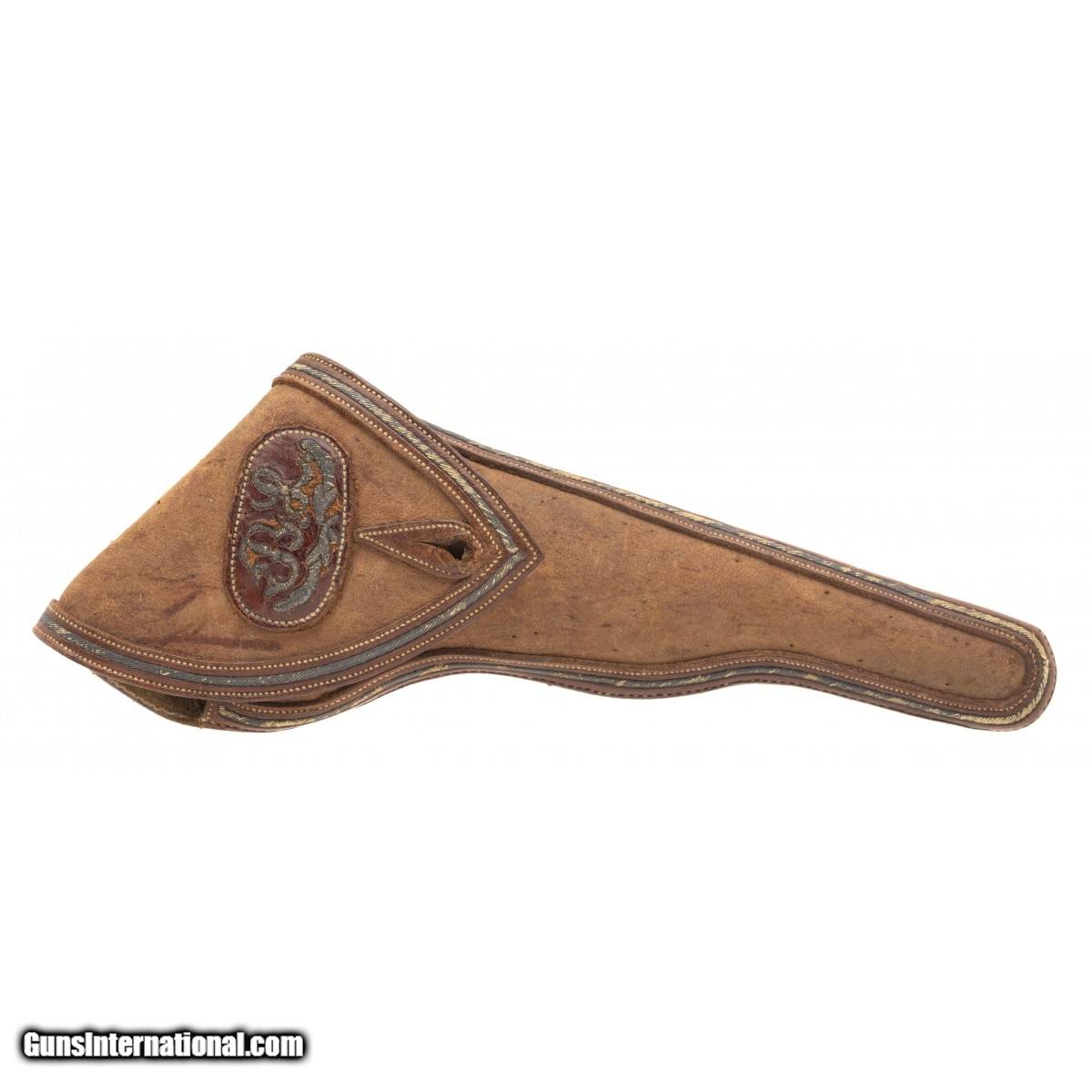 Serial number 2023. Made mid 1860s. #0 caliber Cup Primed Cartridge with a 3 ½" barrel. This gun is in very fine condition with dark bluish gray patina on the barrel. The frame retains most of the original silver finish and the cylinder has most of the gold plated finish. The left hand side of the frame forward of the cylinder has Kittridge and Company markings. Kittridge and company was a firm that is associated with items that went west. Grips are ivory. This gun comes with a flay leather holster adorned with Piteado decoration. Piteado Holsters are mostly made in Mexico. (Consignment)