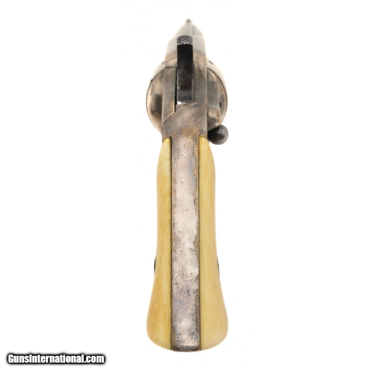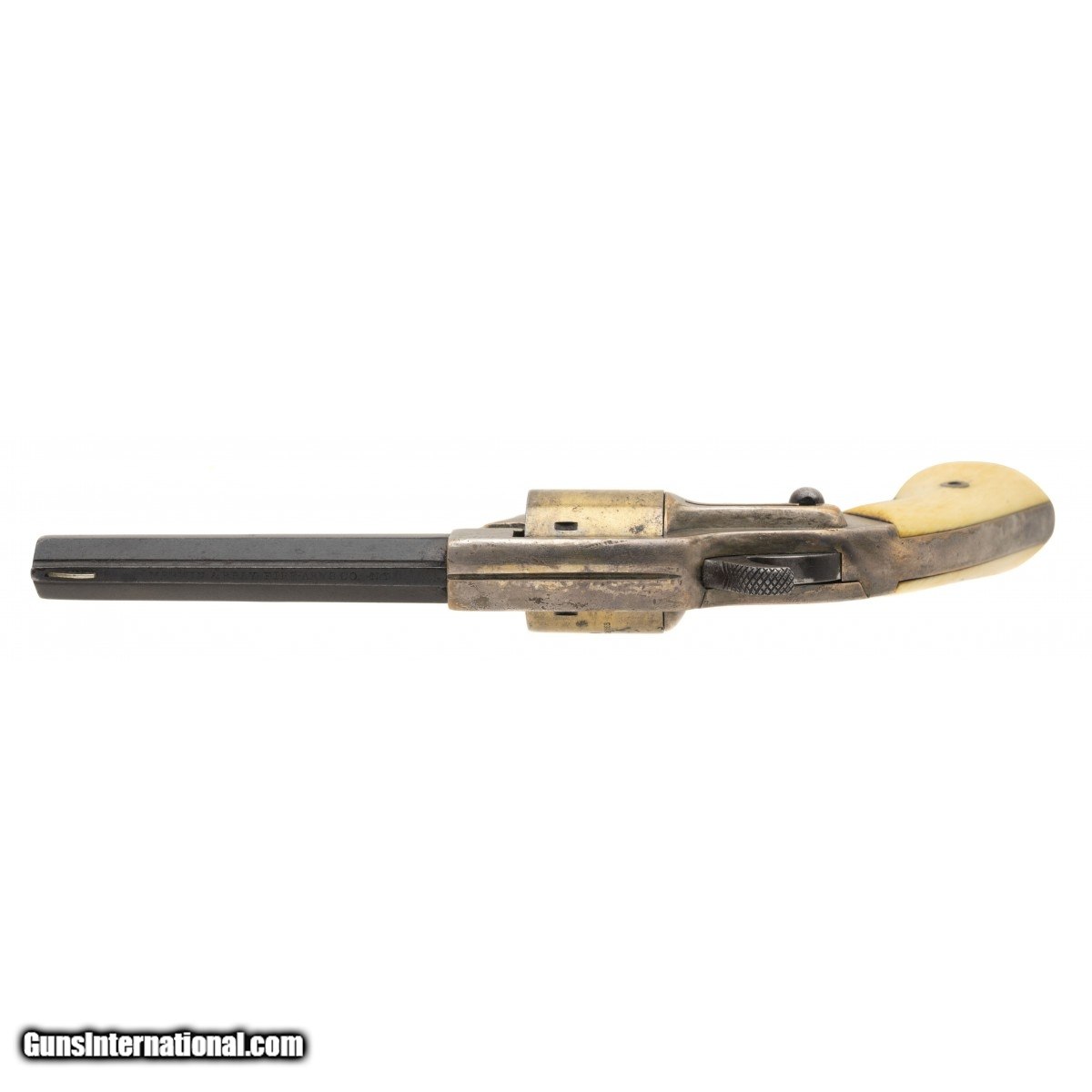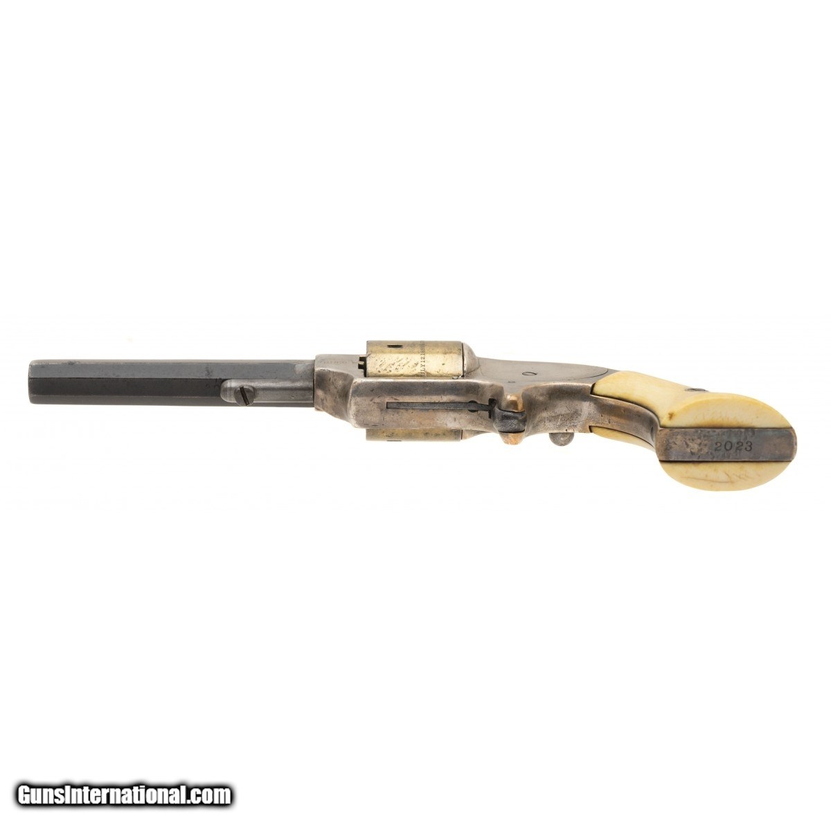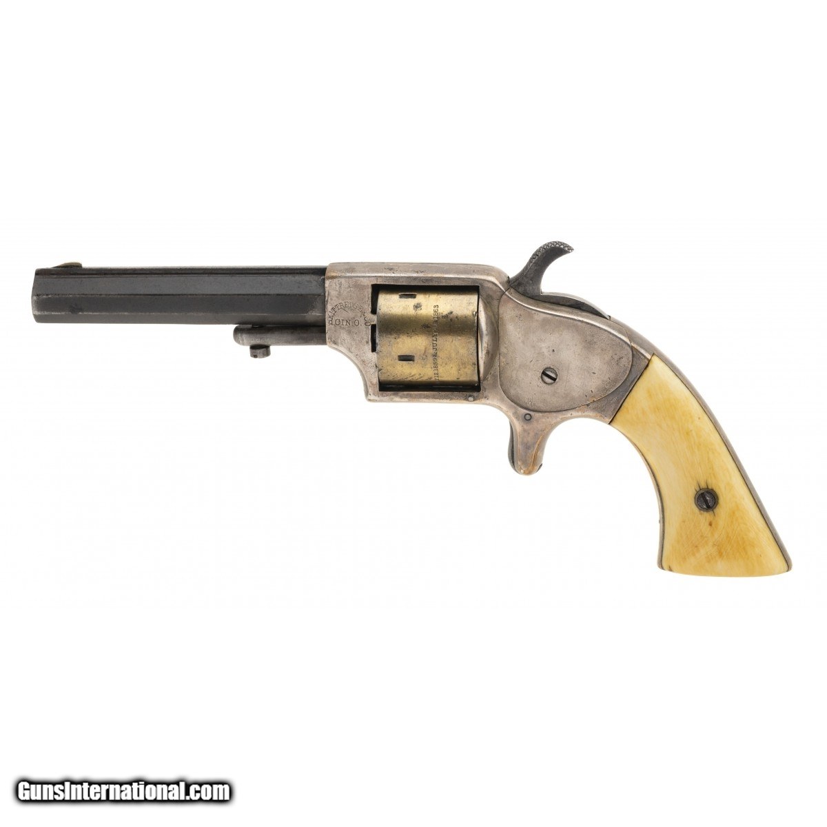 Description: " Serial number 2023. Made mid 1860s. #0 caliber Cup Primed Cartridge with a 3 ½" barrel. This gun is in very fine condition with dark bluish gray patina on the barrel. The frame retains most of the original silver finish and the cylinder has most of the gold plated finish. The left hand side of the frame forward of the cylinder has Kittridge and Company markings. Kittridge and company was a firm that is associated with items that went west. Grips are ivory. This gun comes with a flay leather holster adorned with Piteado decoration. Piteado Holsters are mostly made in Mexico. (Consignment) SOLD |