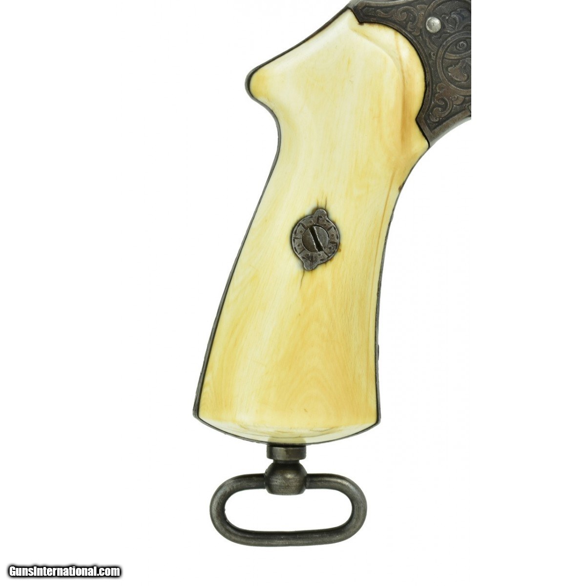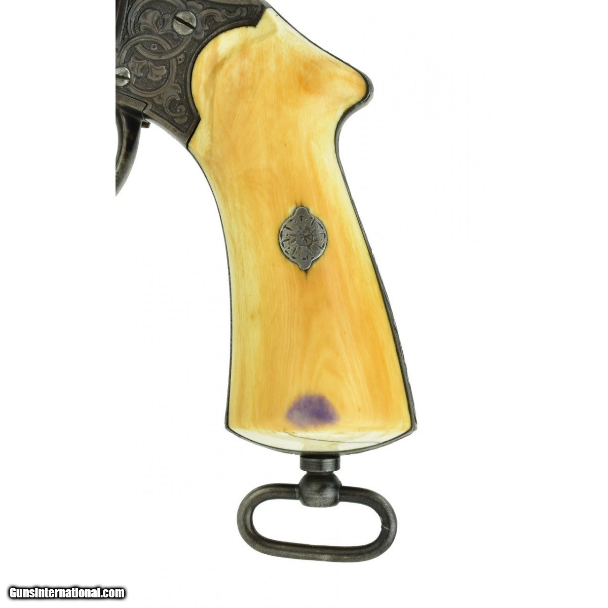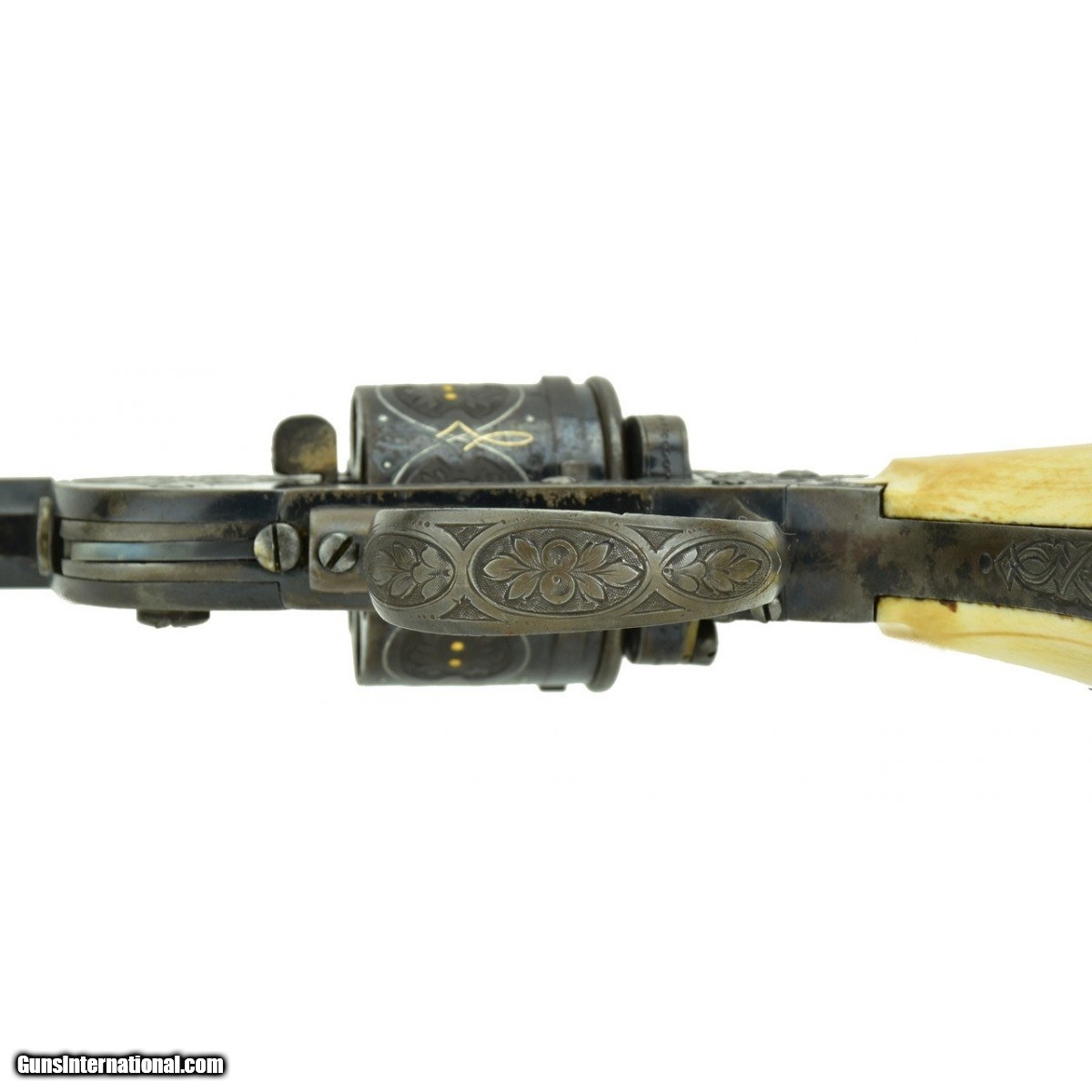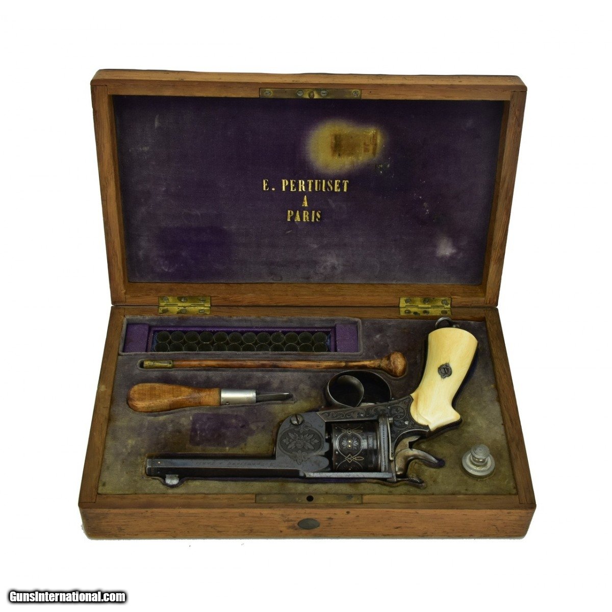 Description: "Very Rare French Levaux Revolver by E. Pertuiset. Very interesting gun! Gun is very fine condition with 90% of the original blue. Gun is highly engraved and has gold inlays on the cylinder. The right hand side of the barrel is marked “E. Pertuiset a Paris". The only other marking is on the left hand side of the barrel’s lug, “Acier Fondu" which translates to cast steel. Gun has beautiful grips. Very nice condition gun that has an interesting self-ejecting break open system. The case has all of the accessories. It is a French casing and has the makers name on the lid. The top of the lid has a blank silver plaque. Along with this gun comes some research information from the littlegun.be detailing the Levaux guns. We have owned one other set that was almost identical to this one. SOLD Antique: Yes |