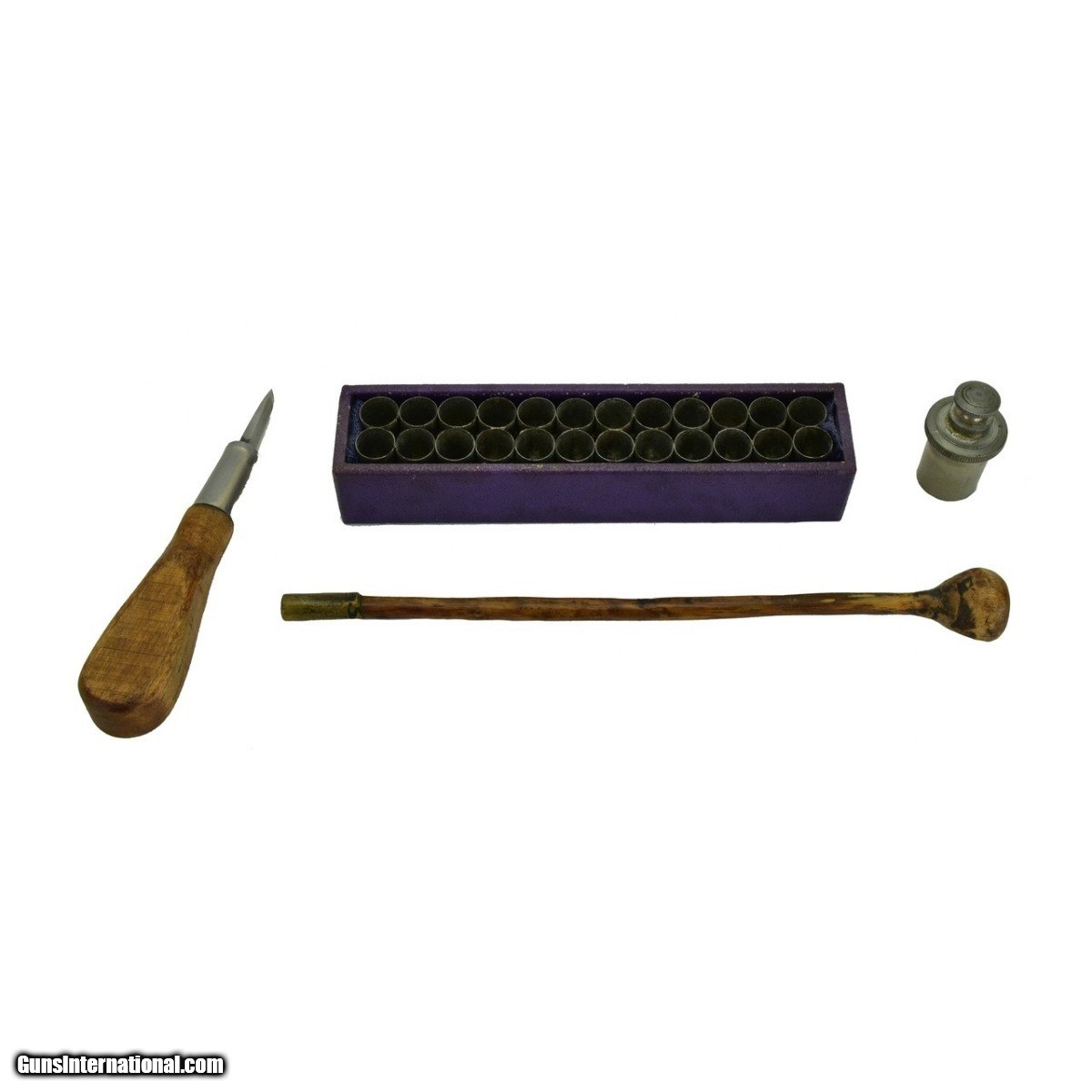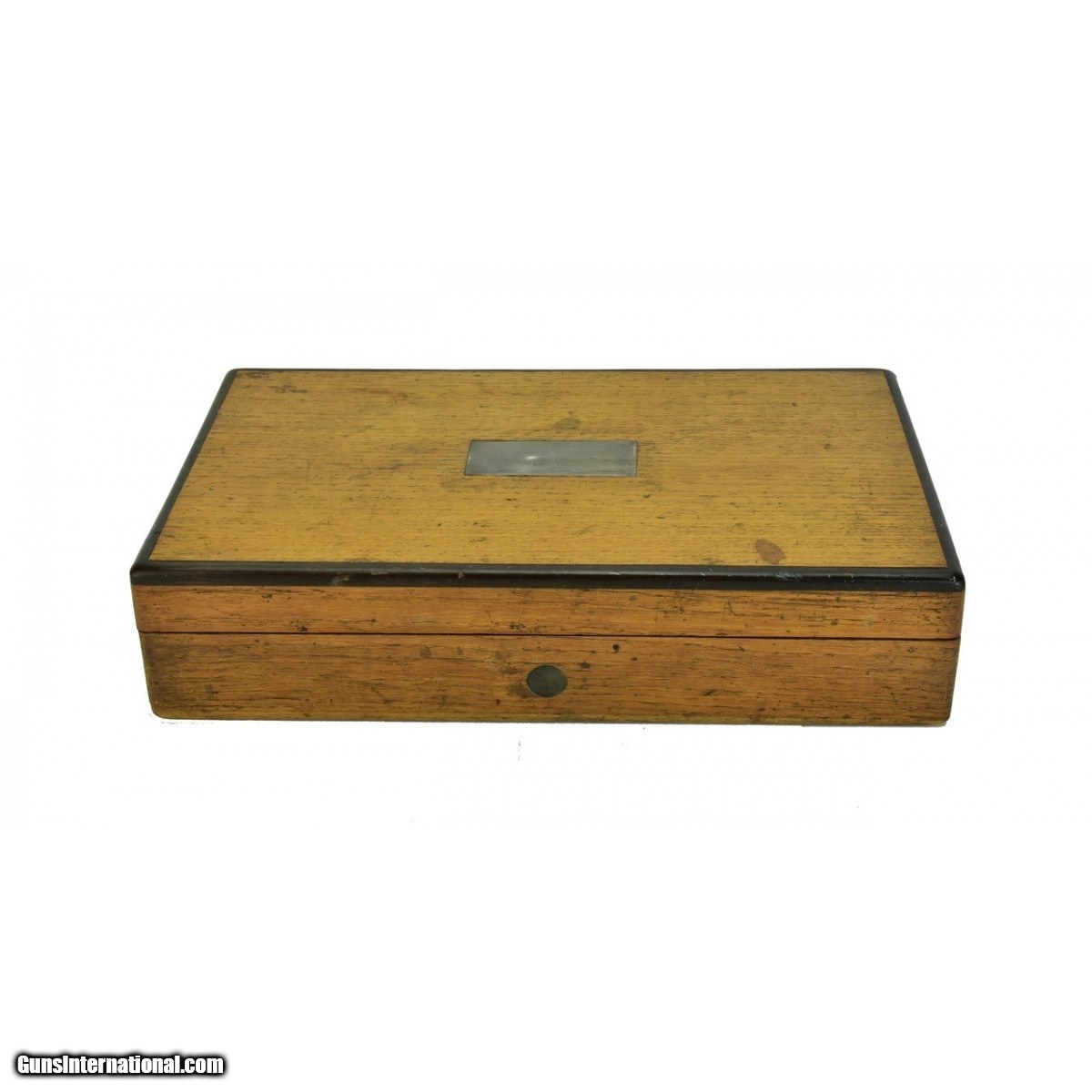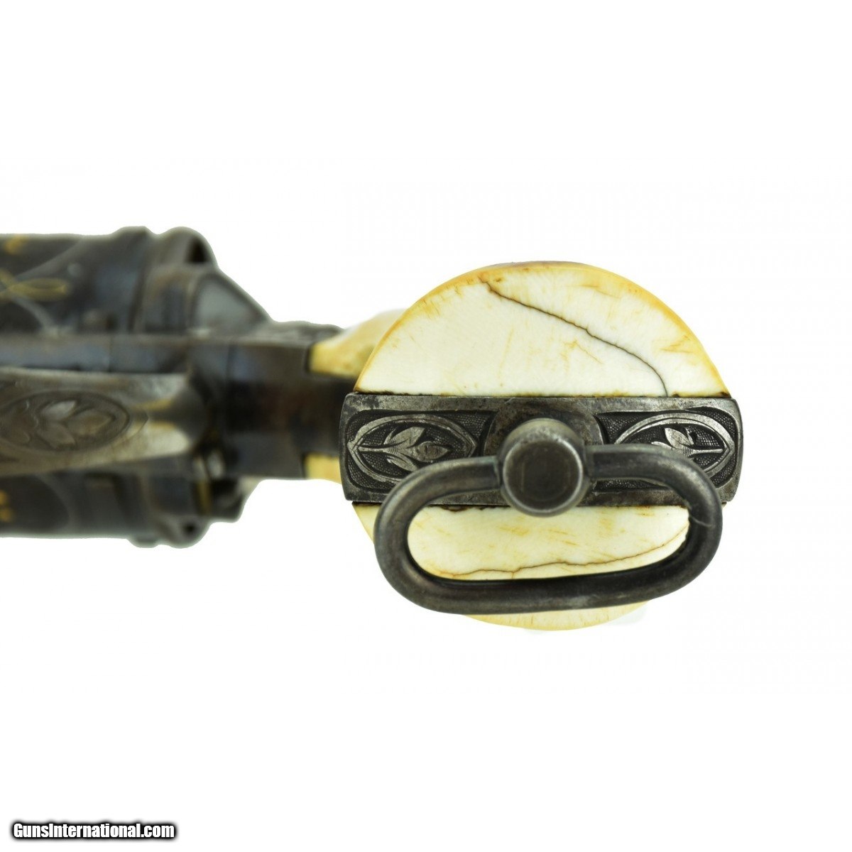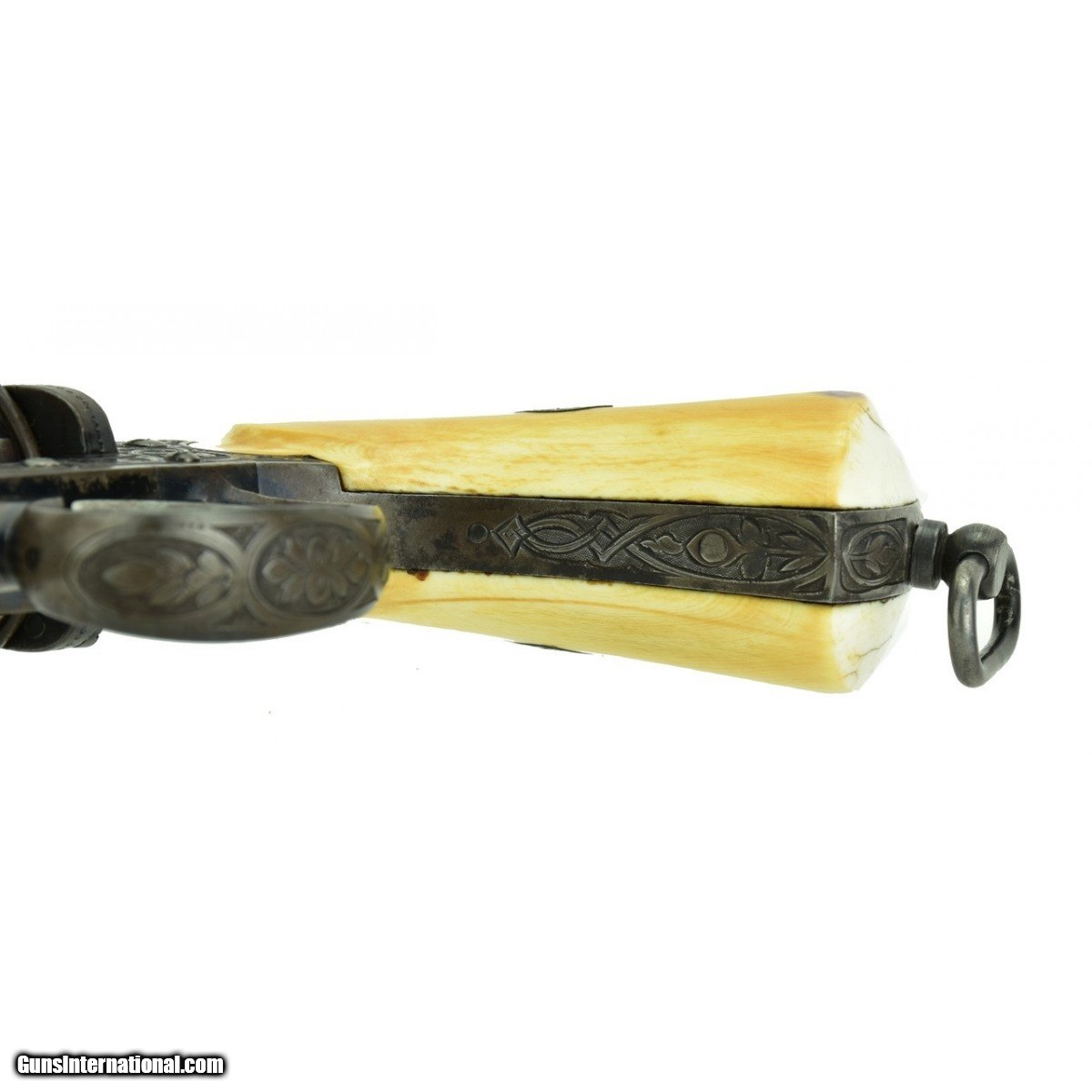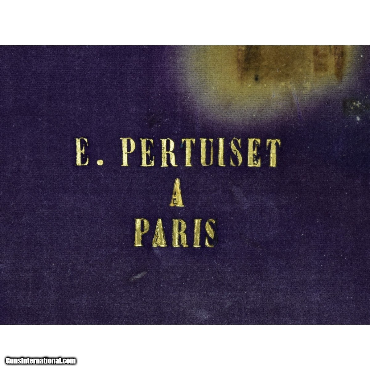 Description: "Very Rare French Levaux Revolver by E. Pertuiset. Very interesting gun! Gun is very fine condition with 90% of the original blue. Gun is highly engraved and has gold inlays on the cylinder. The right hand side of the barrel is marked “E. Pertuiset a Paris". The only other marking is on the left hand side of the barrel’s lug, “Acier Fondu" which translates to cast steel. Gun has beautiful grips. Very nice condition gun that has an interesting self-ejecting break open system. The case has all of the accessories. It is a French casing and has the makers name on the lid. The top of the lid has a blank silver plaque. Along with this gun comes some research information from the littlegun.be detailing the Levaux guns. We have owned one other set that was almost identical to this one. SOLD Antique: Yes |