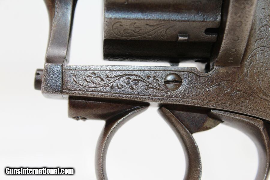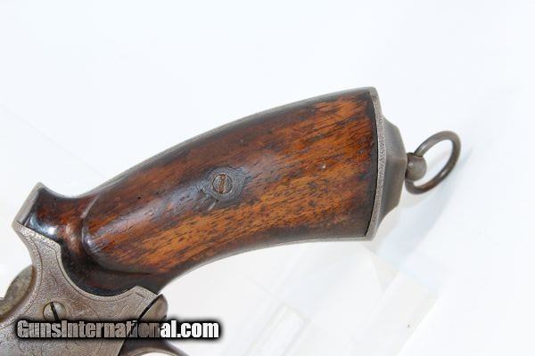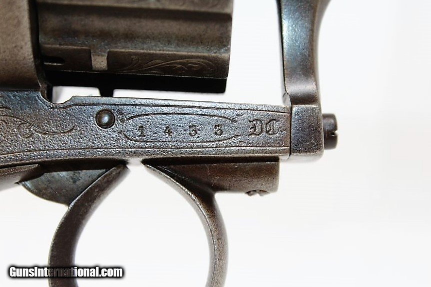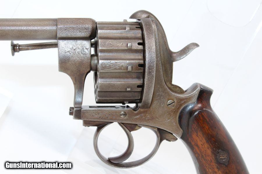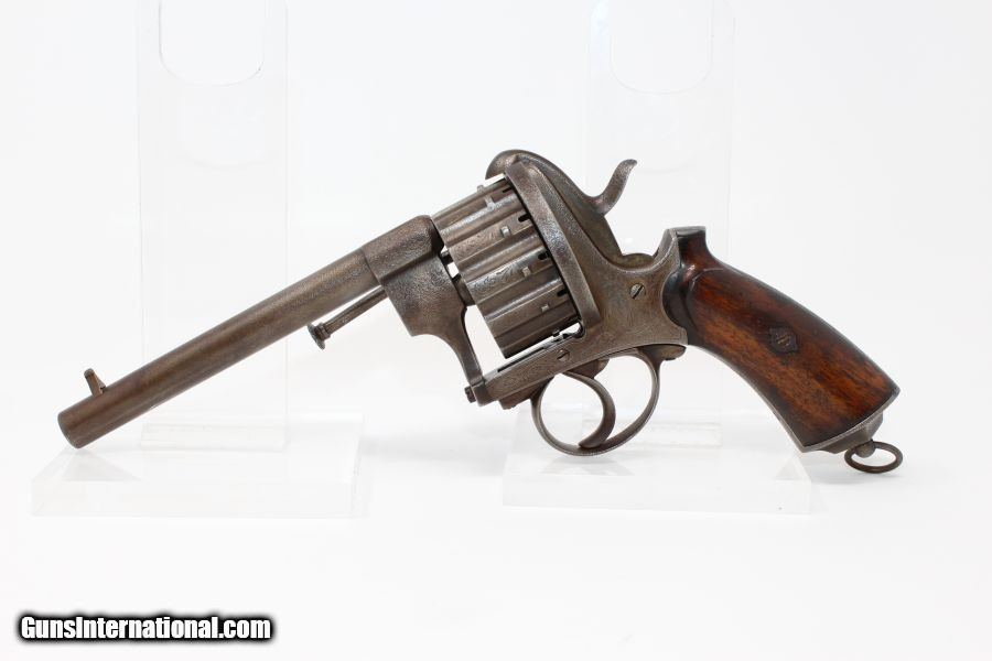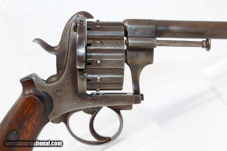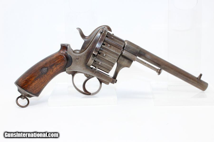 Description: 12-SHOT Antique PINFIRE Revolver by Dumoulin Freres Rare 19th Century 12-Shooter! Here we present an antique 12-Shot Pinfire Revolver by Dumoulin Fréres, made circa 1880. Fréres was active in Liege from about 1877 to 1894 at the address of 89 Boulevard de la Sauvenière. This revolver would have been a fantastic companion for the armed citizen or the police officer in late-19th Century Europe. There were not many firearms which could match the firepower of a 12-shot cylinder in 9mm Pinfire. Obviously, having that much capacity had its tradeoff in the necessary diameter of the cylinder, making it a large weapon to pack around. But if you thought you were going to need a firearm that day, you would have picked the one with the largest capacity. This is interesting for us today as it is a great example how firearms makers and inventors were always trying to maximize the utility of weapons, in this case the round count in a revolver! The overall condition is very good plus. The iron surfaces have a nice, dark patina. The engravings and other markings are clear. The wooden grips are smooth and solid. The bore is in very good condition, clean with sharp rifling. The action is excellent. These are prized and difficult revolvers to acquire. Here is one in fabulous and functional condition! A neat piece from one of the gunmaking capitals of the world: Belgium! Own the original! This is a legitimate antique and not a reproduction. Barrel is 5-3/4 inches. Caliber: 9mm Pinfire Overall condition as seen in photos. Very Fast. Very Safe. FREE SHIPPING WORLDWIDE. Delivered directly to your door by express mail! Guaranteed AUTHENTIC & Includes CERTIFICATE OF AUTHENTICITY. ancestryguns $3200 #8543 SOLD Antique: Yes |