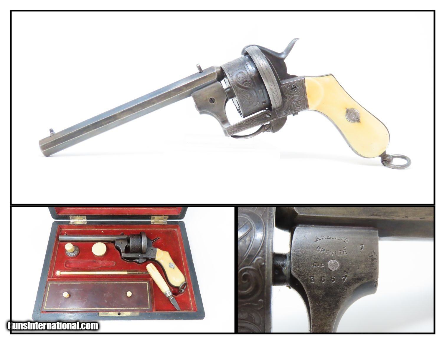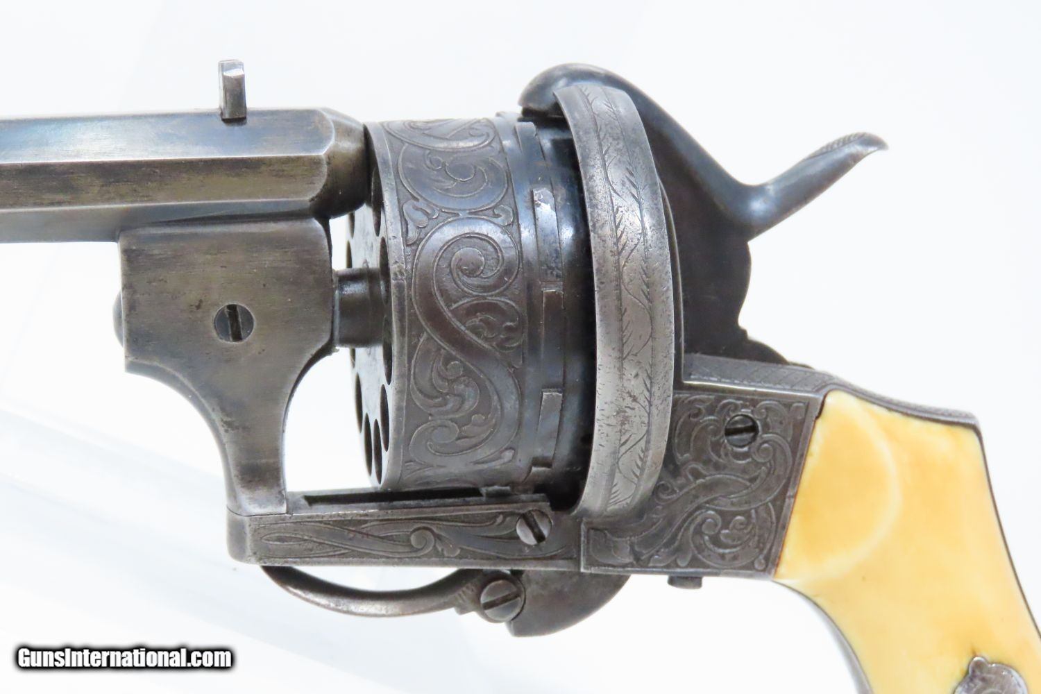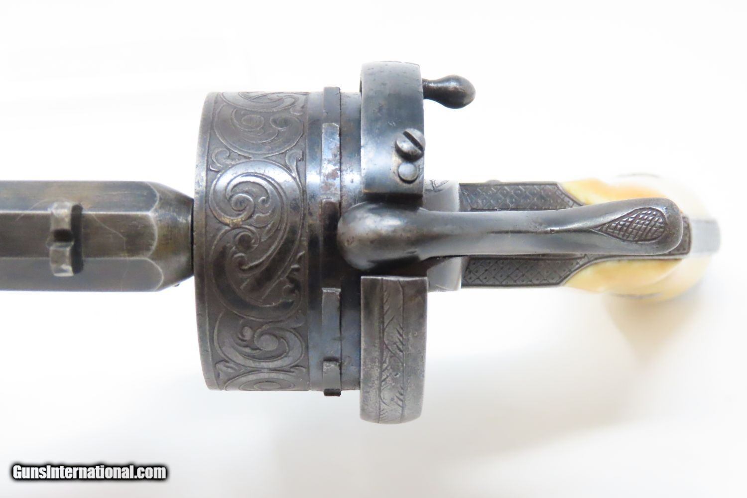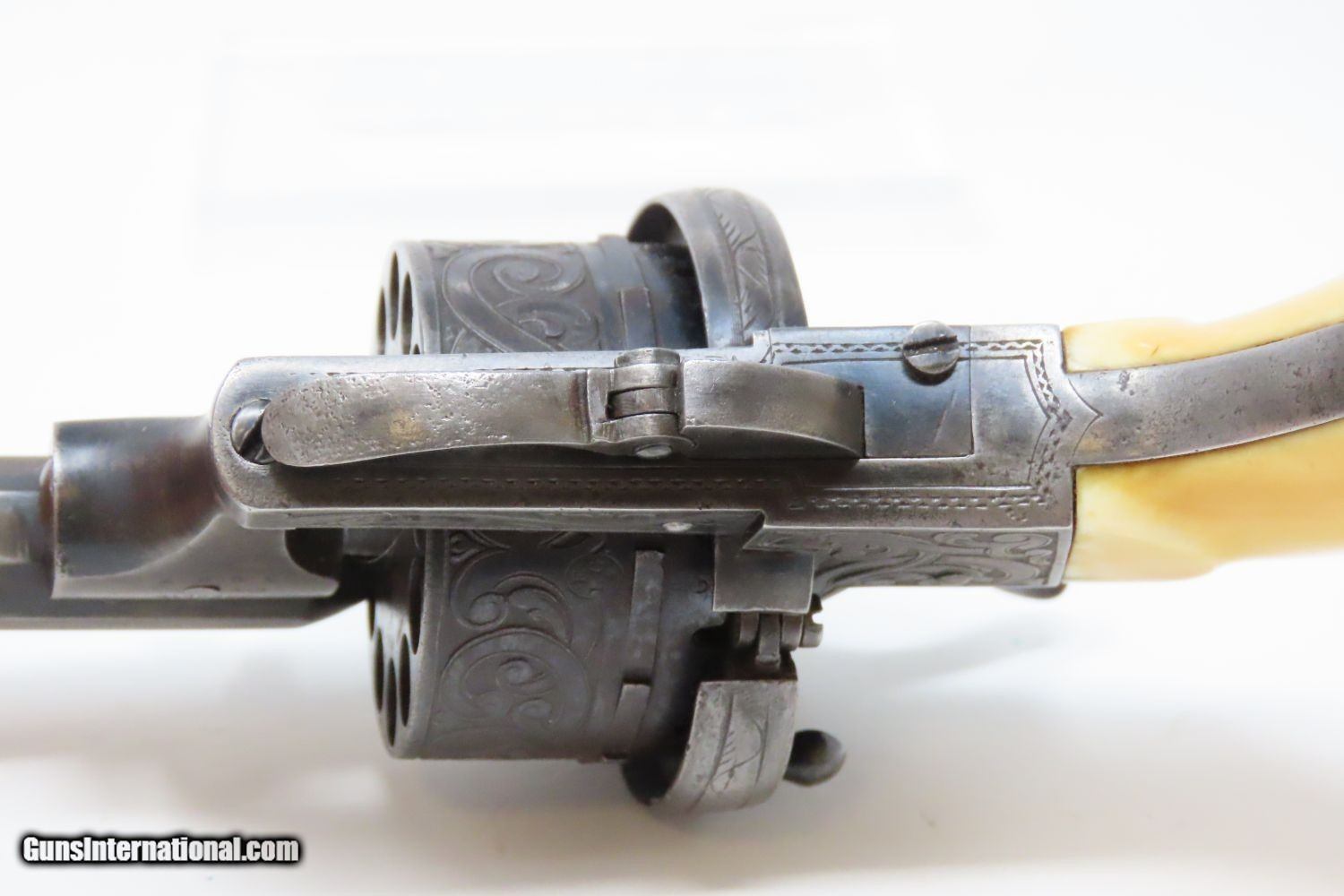 12-Shot Revolver CASED, ENGRAVED Antique ARENDT Pinfire 7.65mm LYON, FRANCE Fully Outfitted with IVORY GRIP & Accoutrements