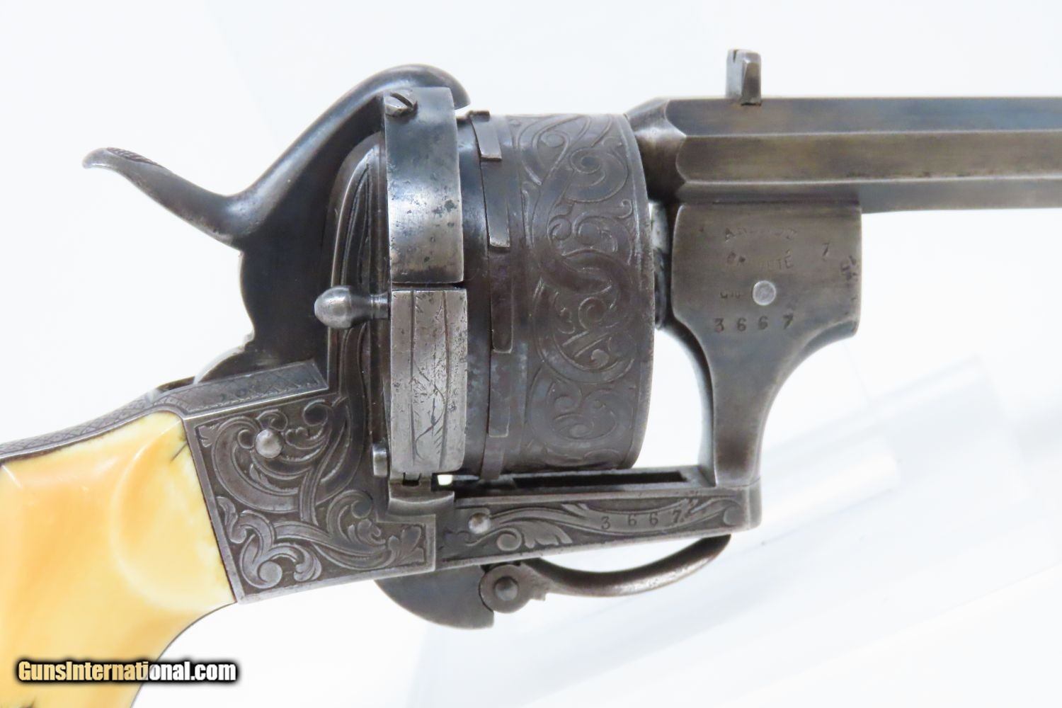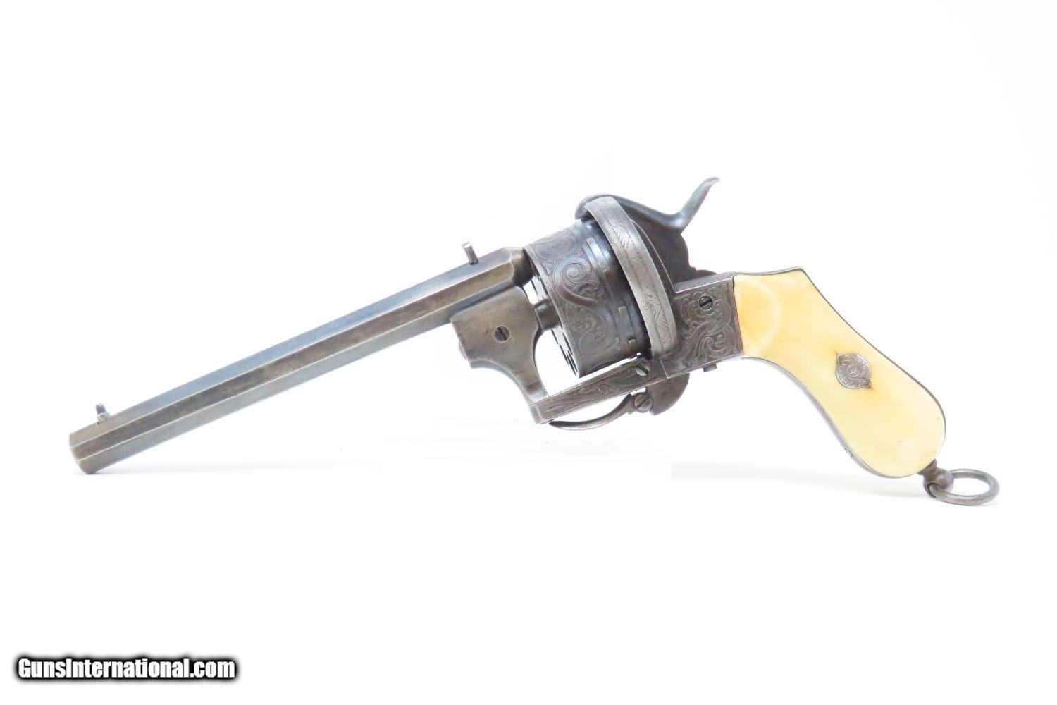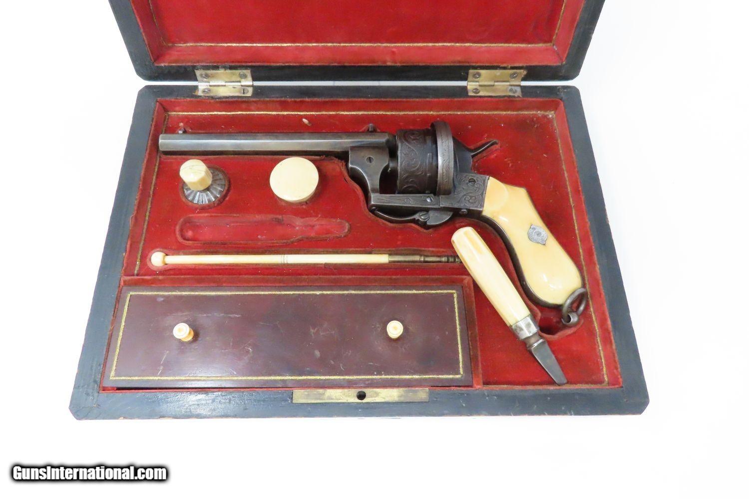 12-Shot Revolver CASED, ENGRAVED Antique ARENDT Pinfire 7.65mm LYON, FRANCE Fully Outfitted with IVORY GRIP & Accoutrements