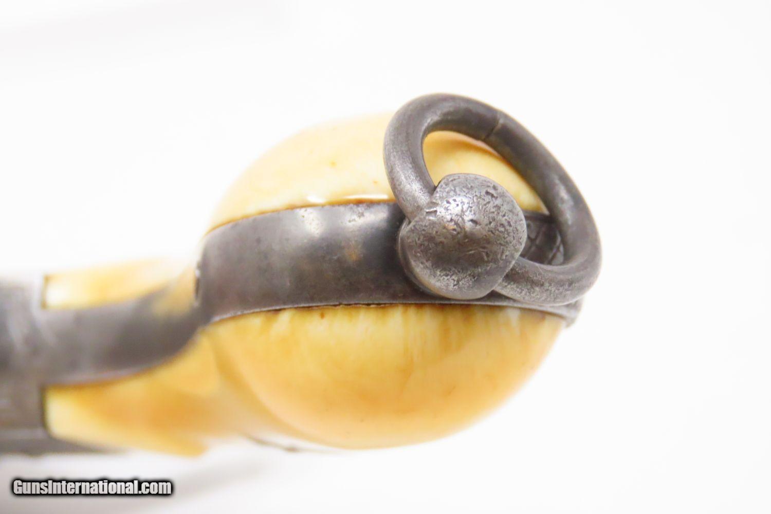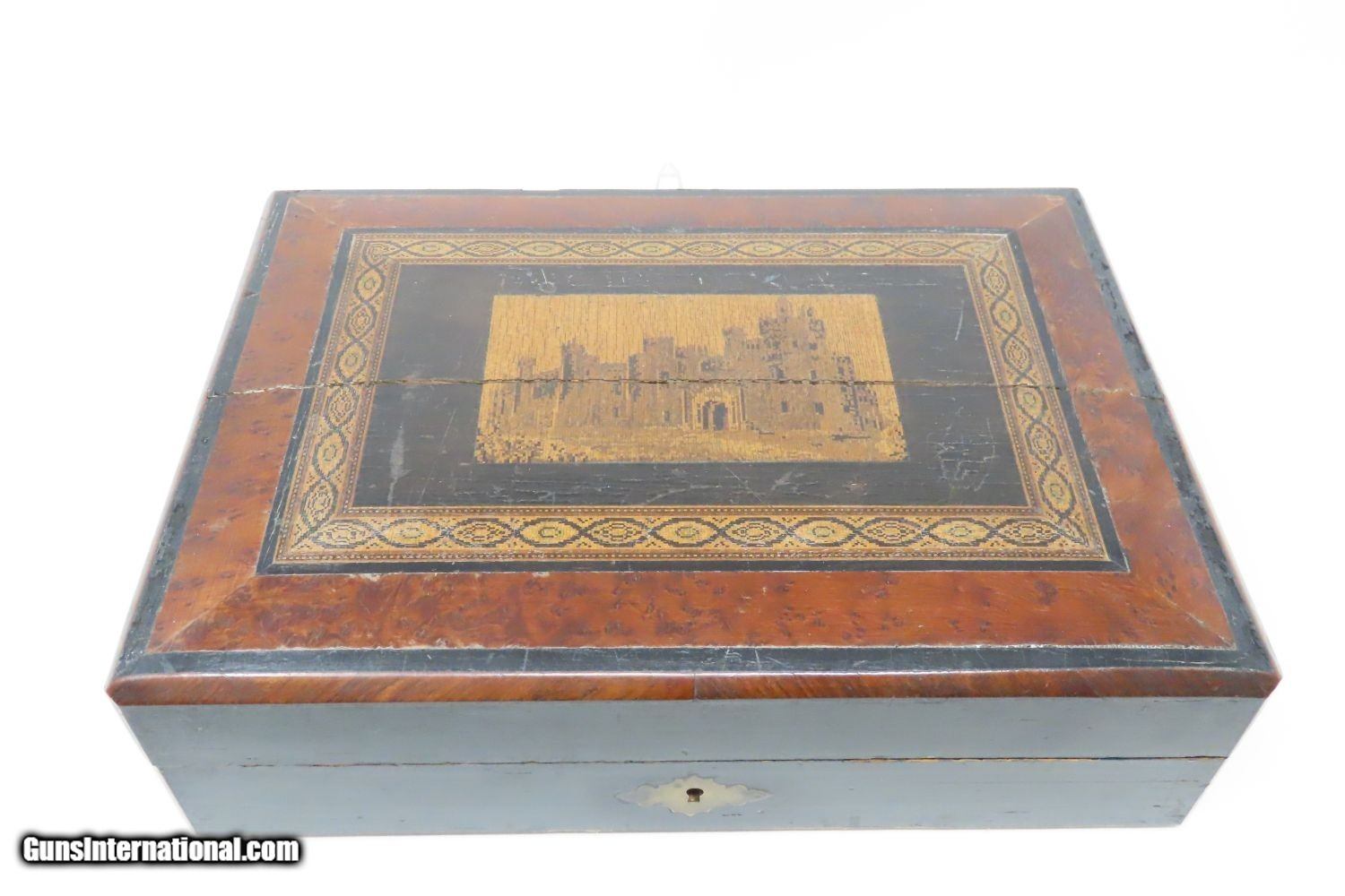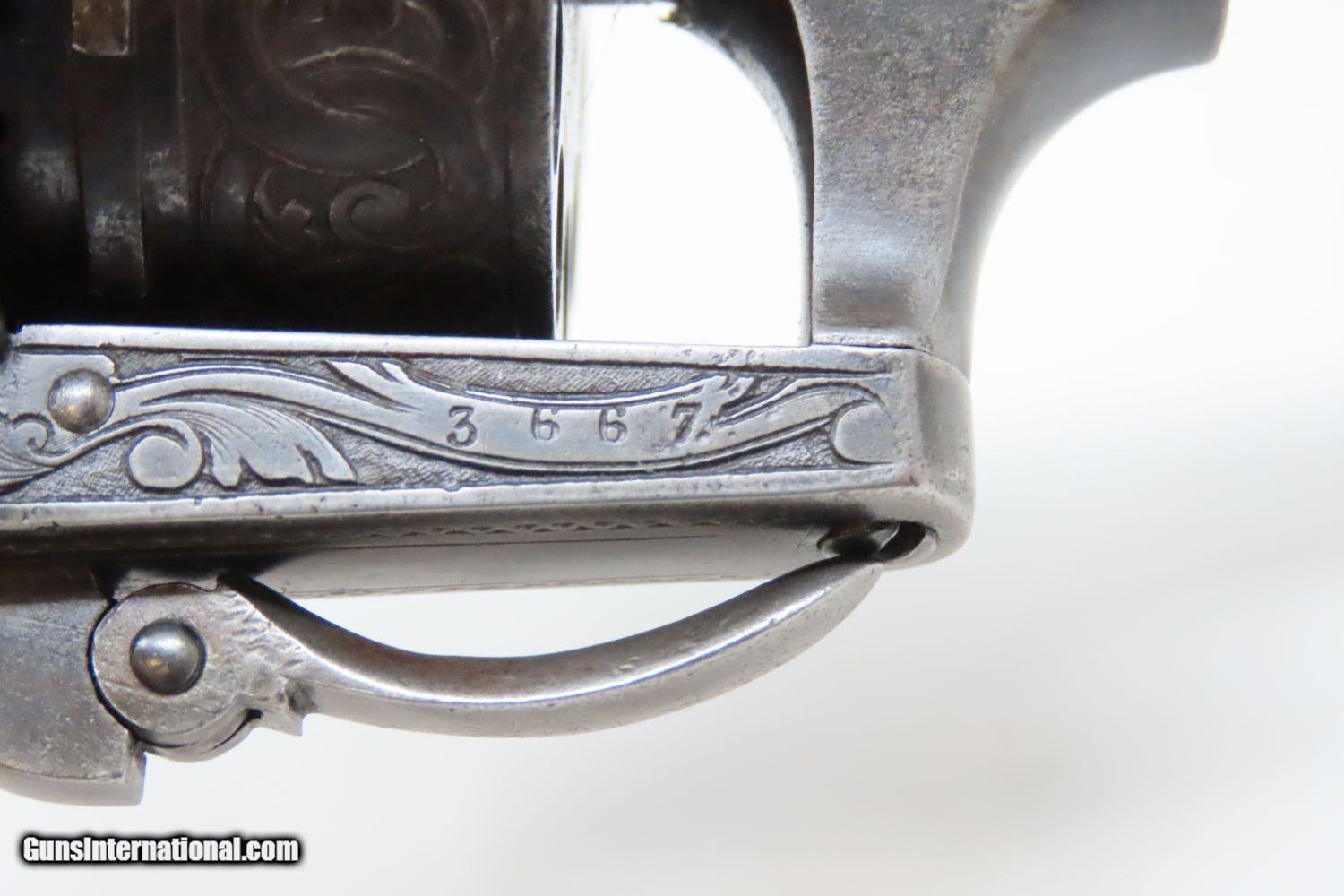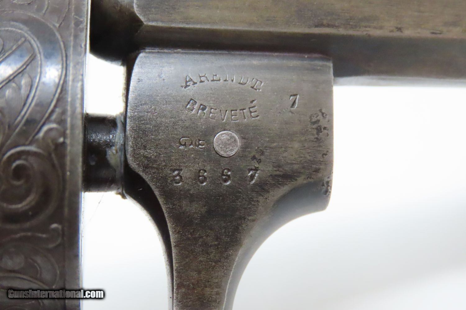 Description: 12-Shot Revolver CASED, ENGRAVED Antique ARENDT Pinfire 7.65mm LYON, FRANCE Fully Outfitted with IVORY GRIP & Accoutrements Here we present an antique Maurice Arendt Brevete (Patent) 12-Shot Pinfire Revolver, made circa the 1860s, within a fitted picture-box case by French arquebusier Verney Jne. of Lyon. Arendt was a manufacturer of weapons in Liege registered with the proofhouse between 1857 and 1889. Verney was a maker and retailer at Rue St. Dominiuqe, 10, in the mid-19th Century. In 1830, notable gun maker and inventor Casimir Lefaucheux invented the pinfire cartridge and patented it in 1835 to become one of the first self-contained firearms cartridges. This very early design included a case with ball, powder and primer, but what made it different from what was to come later in cartridge development was the “firing pin” that projected out of the side of the case. It was this pin that was struck and detonated the primer inside. His son, Eugene, would build on Casimir’s invention, designing a pistol to take advantage of it. The hammer would be flat and smash down on the side of the cylinder, from which the pin of the cartridge would project. This revolver and pistol design would become prolific, especially in Europe throughout the 19th Century, being adopted by militaries, used by civilians and police, and even being sold for use during the American Civil War. Many makers made both licensed and unlicensed copies. This set comes packed inside a fitted “VERNEY JNE. A LYON” retailer case lined with red felt. The lid is split (more like separated) and stable. Also included are an oil bottle, cap/patch container, screwdriver, and cleaning rod that are all made with ivory components.All of that makes this a must have collection, but there’s still one more treat! A fully “Shamrock Brand” tin of fifty 7mm pinfire cartridges is included (for domestic shipping only). The overall condition is very fine. The bore remains in nice condition with strong rifling. The frame and cylinder are deeply engraved with well-defined floral designs. The numbers match throughout. Both ivory grips are fine. The action is as strong and tight for all twelve chambers in both single and double action. This revolver is beautiful and rare, especially in the 12-shot configuration. The original fitted case and the full cartridge tin make this perhaps a one-of-a-kind! Own the original! This is a legitimate antique and not a reproduction. Barrel is 5-3/4 inches. Caliber: 7.65mm Pinfire Overall condition as seen in photos. Very Fast. Very Safe. FREE SHIPPING WORLDWIDE. Delivered directly to your door by express mail! Guaranteed AUTHENTIC & Includes CERTIFICATE OF AUTHENTICITY. ancestryguns $5785 #201292 SOLD Antique: Yes |