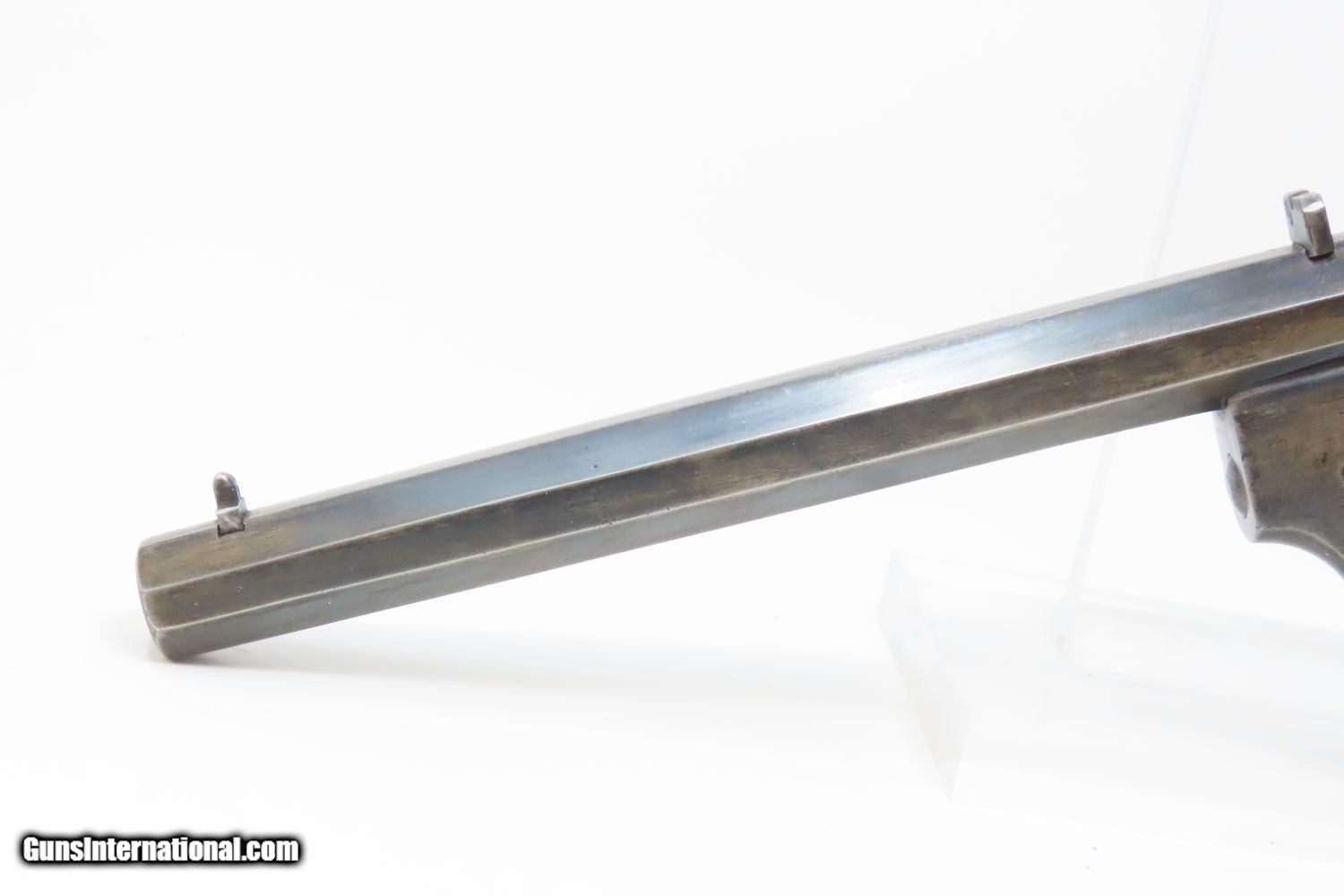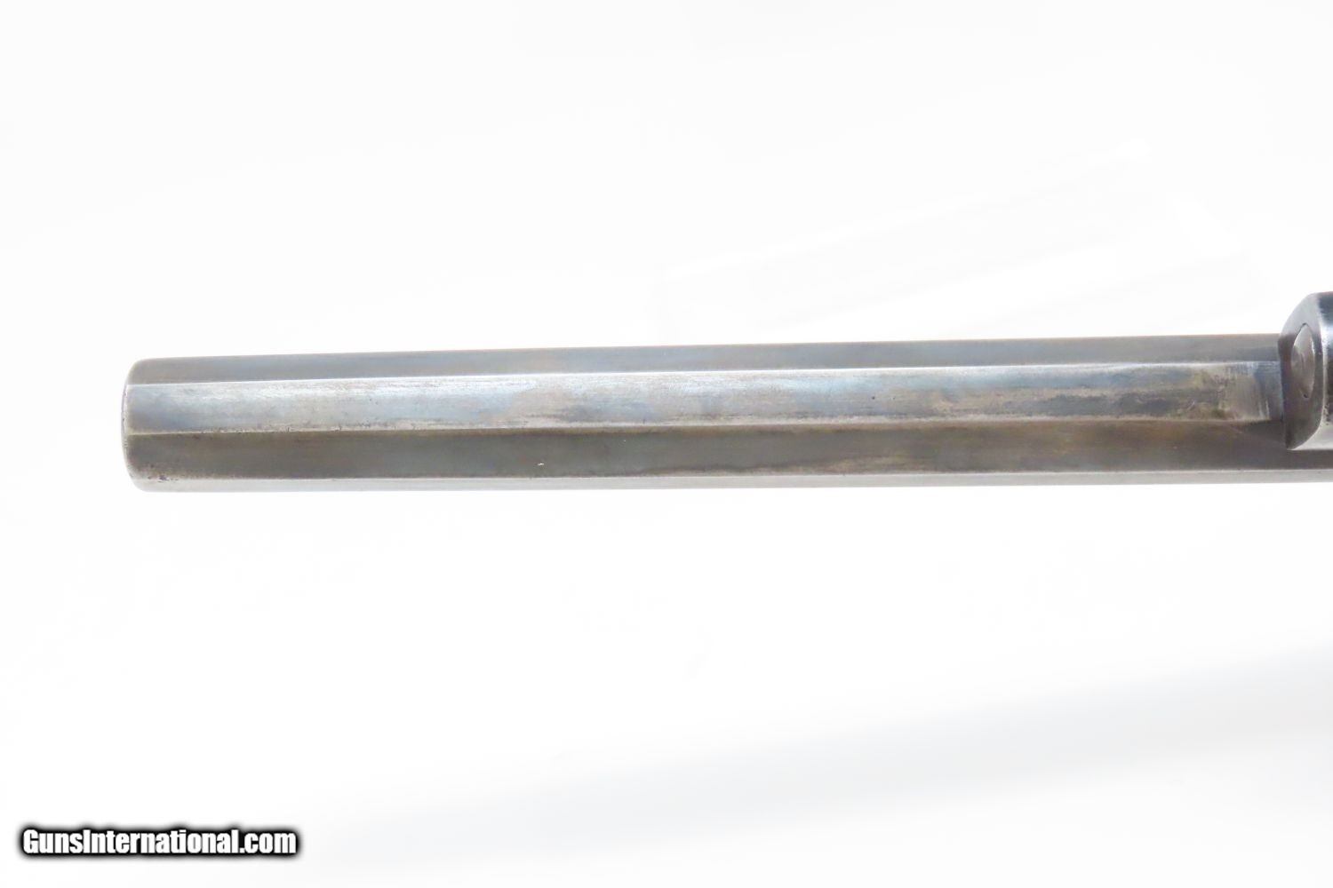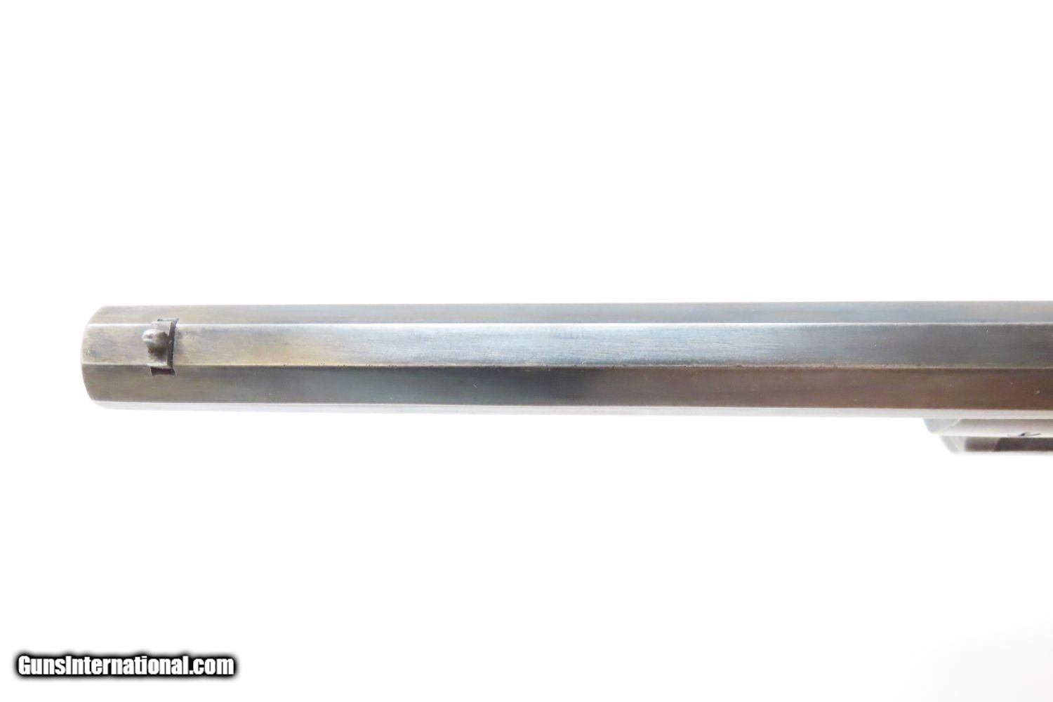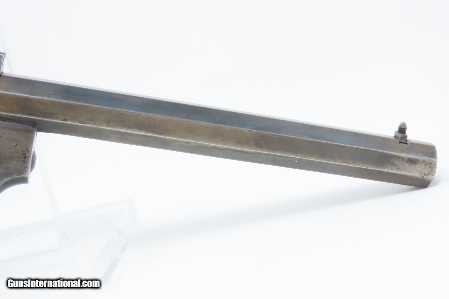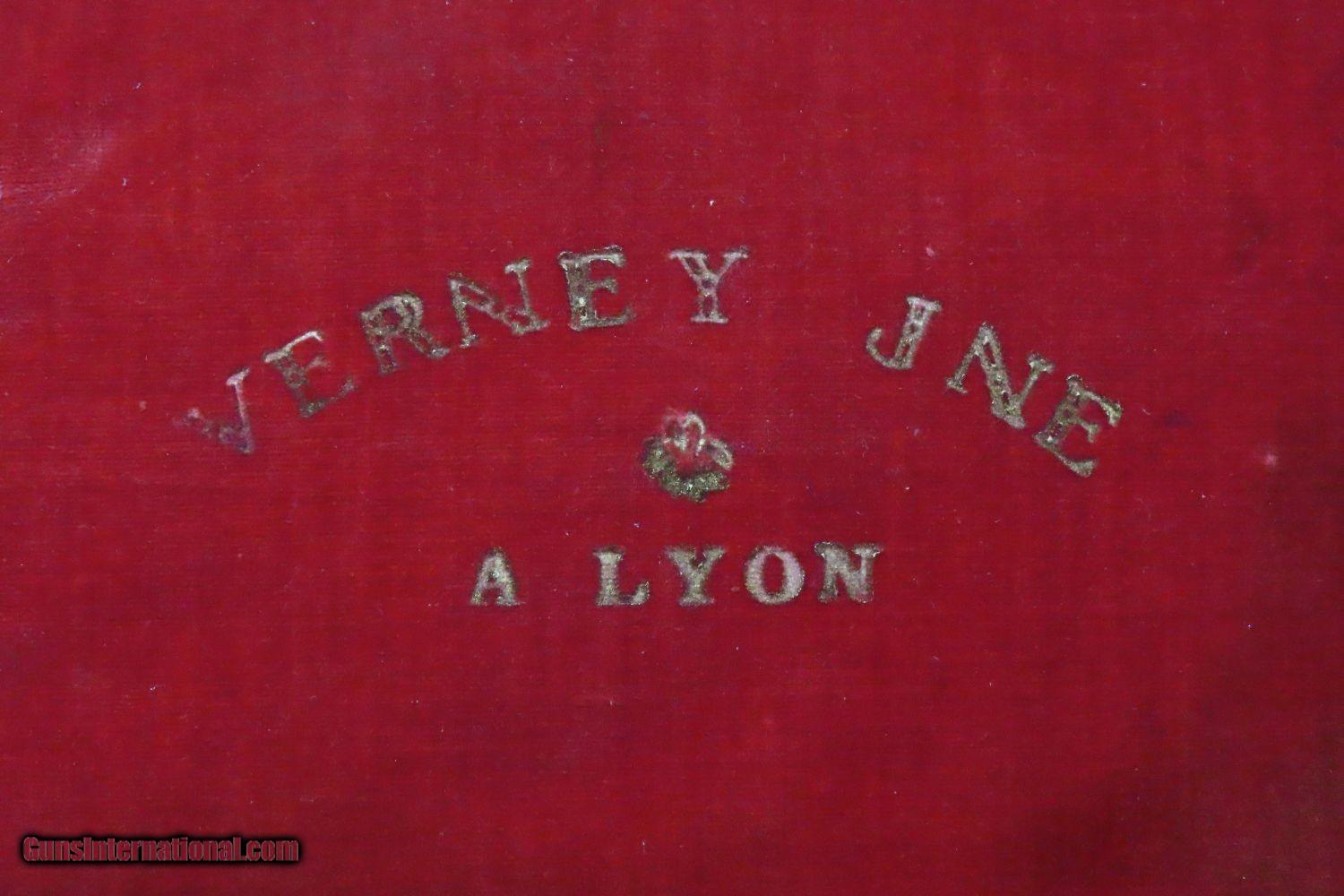 Description: 12-Shot Revolver CASED, ENGRAVED Antique ARENDT Pinfire 7.65mm LYON, FRANCE Fully Outfitted with IVORY GRIP & Accoutrements Here we present an antique Maurice Arendt Brevete (Patent) 12-Shot Pinfire Revolver, made circa the 1860s, within a fitted picture-box case by French arquebusier Verney Jne. of Lyon. Arendt was a manufacturer of weapons in Liege registered with the proofhouse between 1857 and 1889. Verney was a maker and retailer at Rue St. Dominiuqe, 10, in the mid-19th Century. In 1830, notable gun maker and inventor Casimir Lefaucheux invented the pinfire cartridge and patented it in 1835 to become one of the first self-contained firearms cartridges. This very early design included a case with ball, powder and primer, but what made it different from what was to come later in cartridge development was the “firing pin” that projected out of the side of the case. It was this pin that was struck and detonated the primer inside. His son, Eugene, would build on Casimir’s invention, designing a pistol to take advantage of it. The hammer would be flat and smash down on the side of the cylinder, from which the pin of the cartridge would project. This revolver and pistol design would become prolific, especially in Europe throughout the 19th Century, being adopted by militaries, used by civilians and police, and even being sold for use during the American Civil War. Many makers made both licensed and unlicensed copies. This set comes packed inside a fitted “VERNEY JNE. A LYON” retailer case lined with red felt. The lid is split (more like separated) and stable. Also included are an oil bottle, cap/patch container, screwdriver, and cleaning rod that are all made with ivory components.All of that makes this a must have collection, but there’s still one more treat! A fully “Shamrock Brand” tin of fifty 7mm pinfire cartridges is included (for domestic shipping only). The overall condition is very fine. The bore remains in nice condition with strong rifling. The frame and cylinder are deeply engraved with well-defined floral designs. The numbers match throughout. Both ivory grips are fine. The action is as strong and tight for all twelve chambers in both single and double action. This revolver is beautiful and rare, especially in the 12-shot configuration. The original fitted case and the full cartridge tin make this perhaps a one-of-a-kind! Own the original! This is a legitimate antique and not a reproduction. Barrel is 5-3/4 inches. Caliber: 7.65mm Pinfire Overall condition as seen in photos. Very Fast. Very Safe. FREE SHIPPING WORLDWIDE. Delivered directly to your door by express mail! Guaranteed AUTHENTIC & Includes CERTIFICATE OF AUTHENTICITY. ancestryguns $5785 #201292 SOLD Antique: Yes |