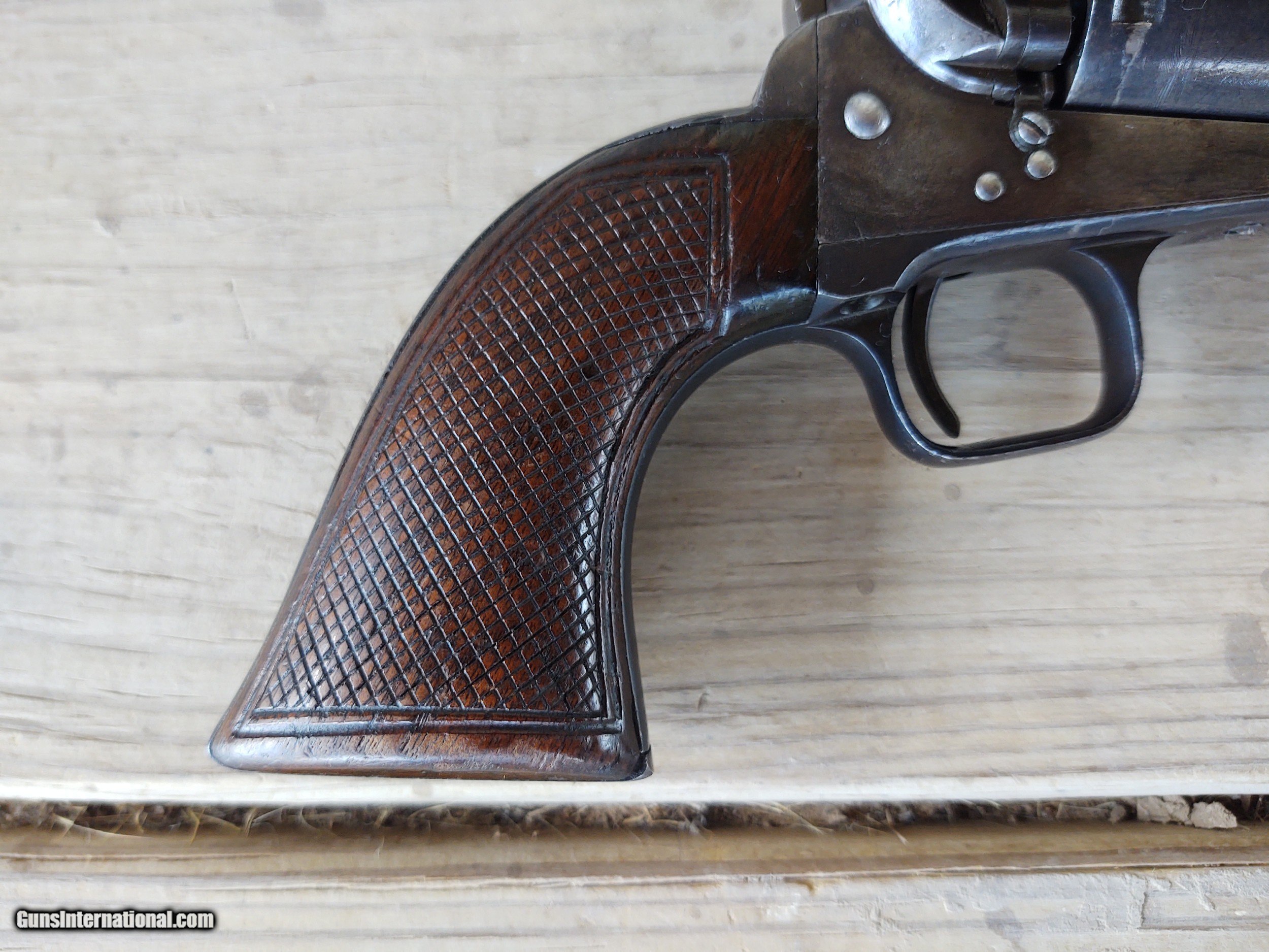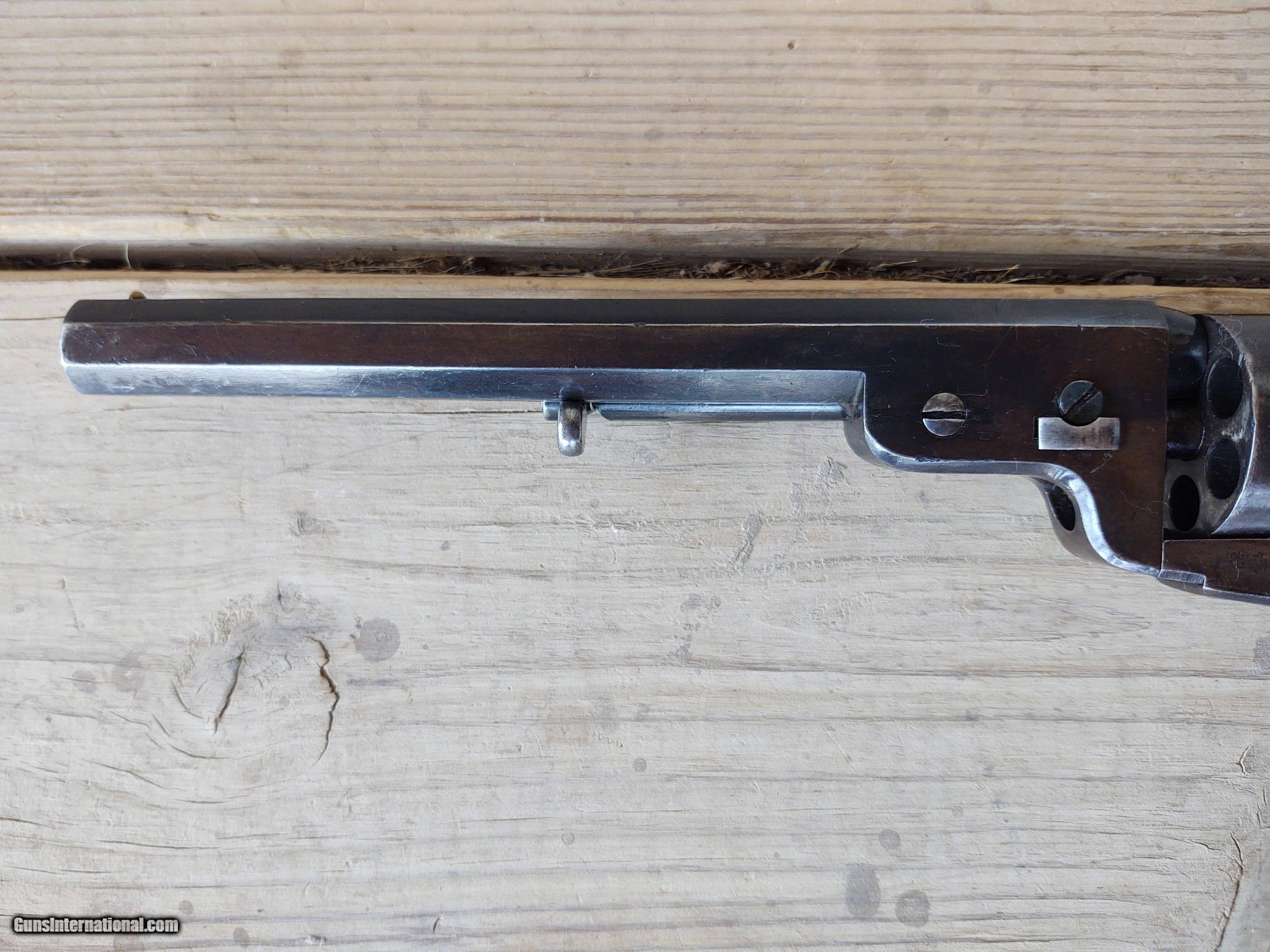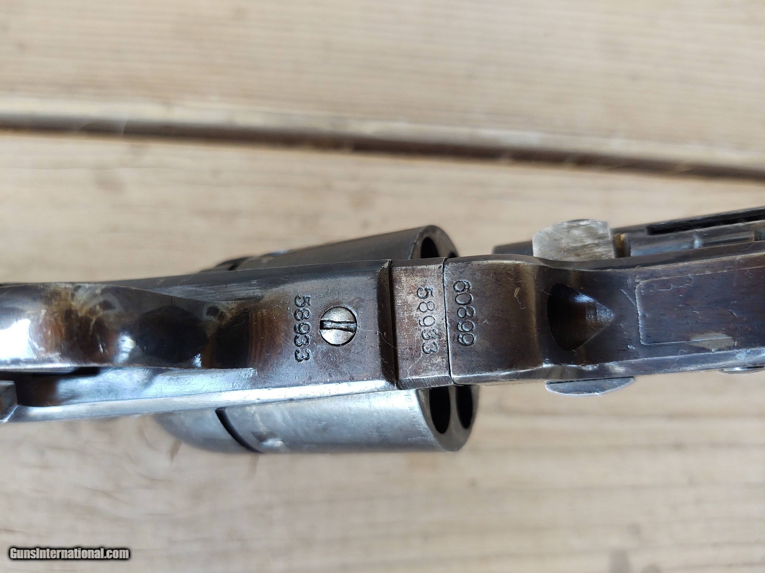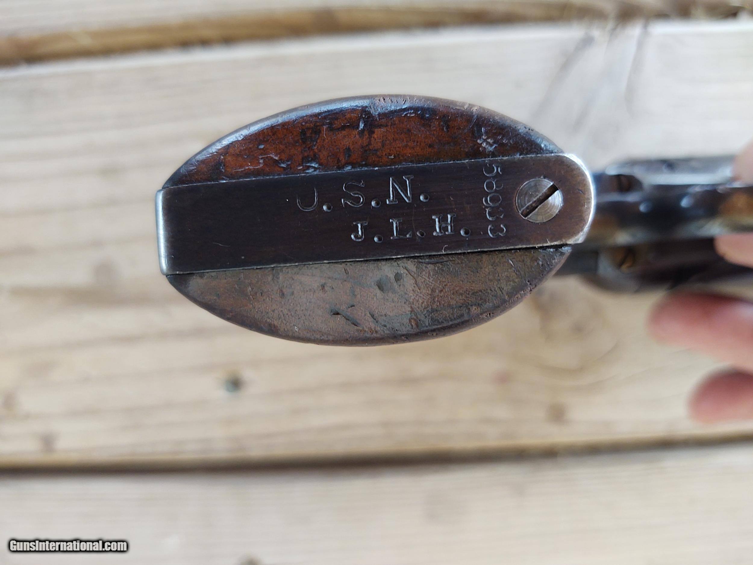Description: This is a fine and rare USN martially marked Colt M1851 Navy model revolver. These M1851 revolvers were produced from 1852 thru 1859, and during that time period, about 2,750 M-1851 Navy cvaliber revolvers were purchased by the US Navy. This revolver is stamped with the Naval Inspector's initials "J.L.H." and "U.S.N." on the bottom of the backstrap, indicating inspection by Commander James L. Henderson, who inspected small arms at Norfolk from June of 1857 through April of 1861, and indicating it's issuance to the US Navy. The Navy subsequently contracted with the Colt factory to alter some 2,200 revolvers to accept metallic cartridges, of which about 1,000 are estimated to have been the Colt M1851 Navy. This pistol is serial numbered 58933 on its principal parts, giving it an 1856 production date and putting it in the 55500 to 62000 serial number range of the Navy’s first contract purchase of 2,000 revolvers. The revolver has a second inspector's marking as well with the inspector's initials "R.W.M." and an anchor symbol on the bottom of the barrel, indicating inspection by Richard W. Meade. This revolver was issued as a percussion revolver to the US Navy, under the backstrap inspector's mark of JLH/USN, and it was later returned by the Navy to the Colt factory for conversion to .38CF with the rare Richards-Mason centerfire conversion under the Naval conversion contract. It was then re-issued back into naval service under the RWM inspector's mark. The barrel number does not match the frame/backstrap numbers, and this is common to revolvers sent back for a second trip to the Colt factory, as many part numbers were not matched during the conversion/refurbishment contract, as well as some parts receiving some softening of the original stampings from the Colt factory polishing/rebluing effort. The revolver is in excellent mechanical shape, with an absolutely tight hammer/cylinder lockup and a very crisp trigger. The bore is bright, with strong sharp rifling and very modest, light scattered powder fouling in the lands. Barrel edges are sharp and the ejector has the Colt bullseye head. The screwheads are not marred. The cylinder scene is lightly visible and the cylinder has a slight drag mark around it's circumference. The frame has aged to a dull patina and the bluing on the barrel, backstrap and cylinder has aged to an almost even patina to match the frame patina. The grips, while they are not officially "naval", are finely checkered, retain almost all the original finish and have no chips or marring. Overall, this is an excellent example of a scarce Naval issued Colt M1851 Navy in good to fine condition that has been factory converted to .38CF under the Richards-Mason patent. The pictures are the best description of this fine and rare "Navy Navy" conversion, and this revolver will be a wonderful addition to your Colt revolver collection. Sold as a collector piece only. Payment via personal check/postal Money Order ONLY; no credit cards, bank checks, PayPal, etc.; revolver will be shipped after payment is cleared by the bank; email me for all questions and/or requests for additional pictures. $95 for shipping and insurance to lower 48 (will be shipped in a box/ hard case). Thanks for the interest. SOLD Antique: Yes Manufacturer: Colt Model: 1851 Serial Number: 58933 Barrel Length: 7.5 inches Condition: fine Metal Condition: fine Wood Condition: good Bore Condition: good |