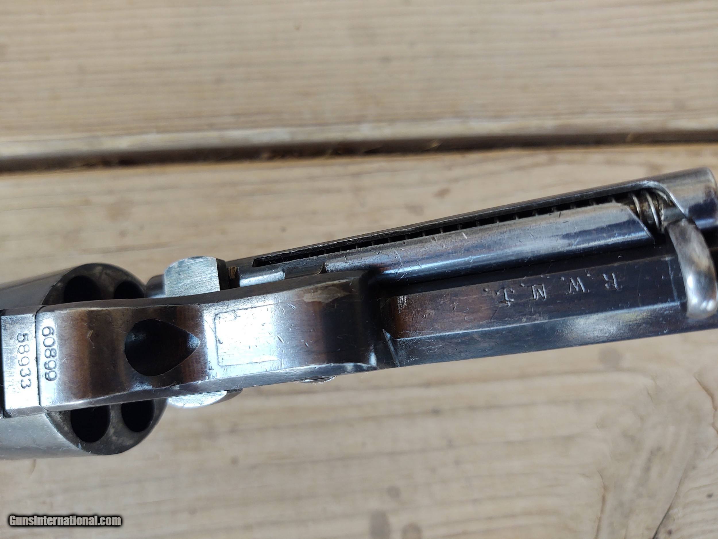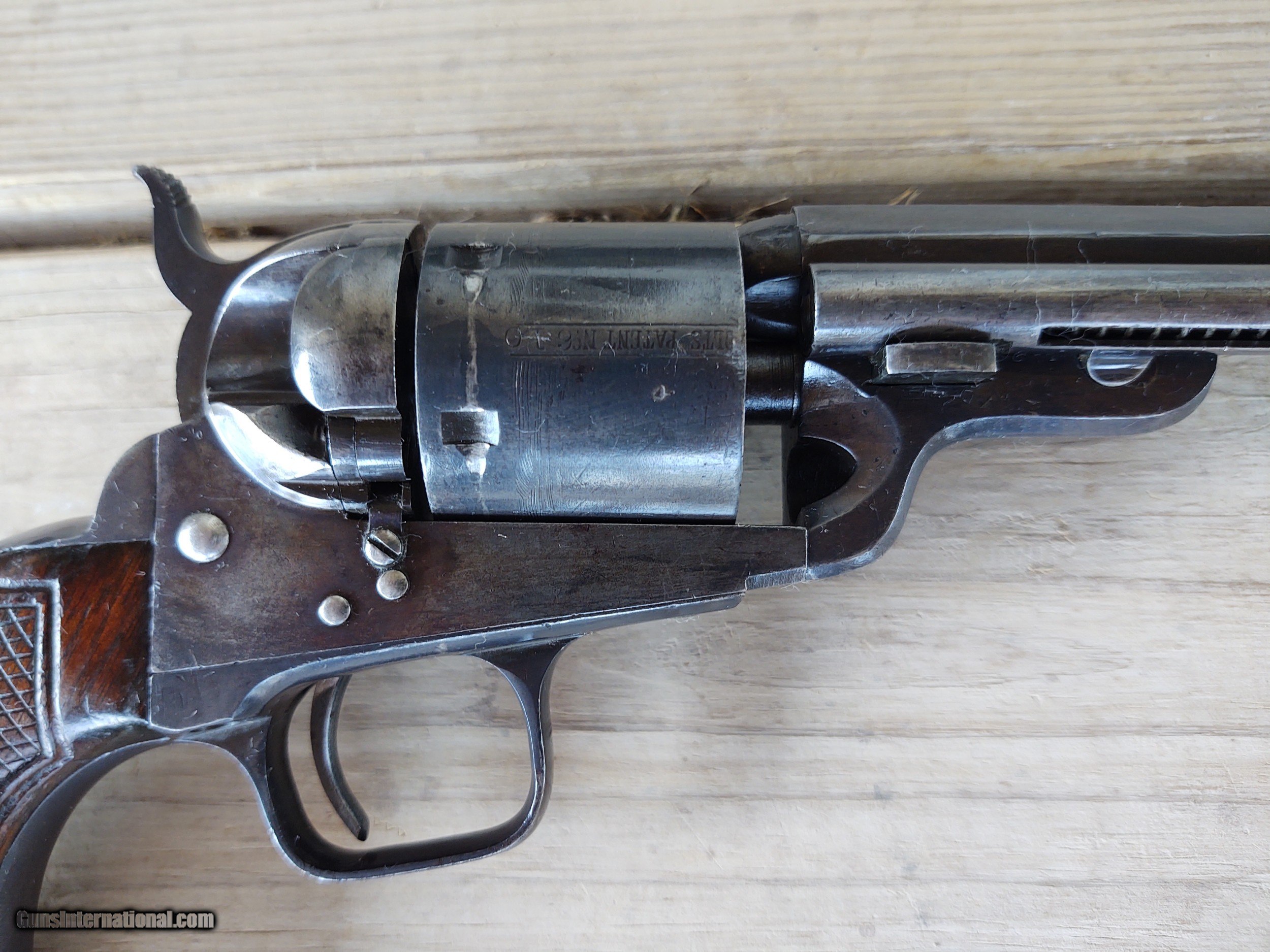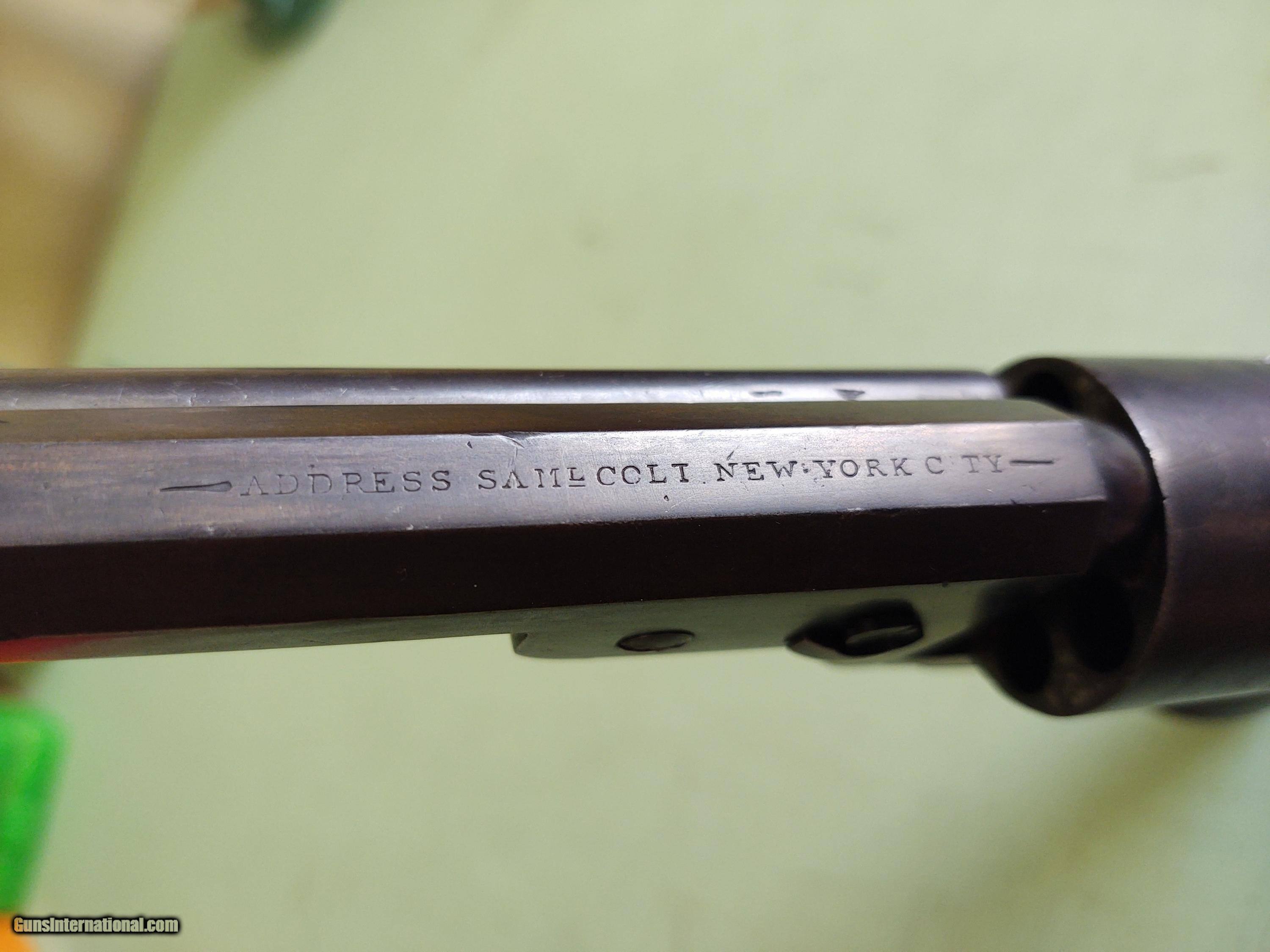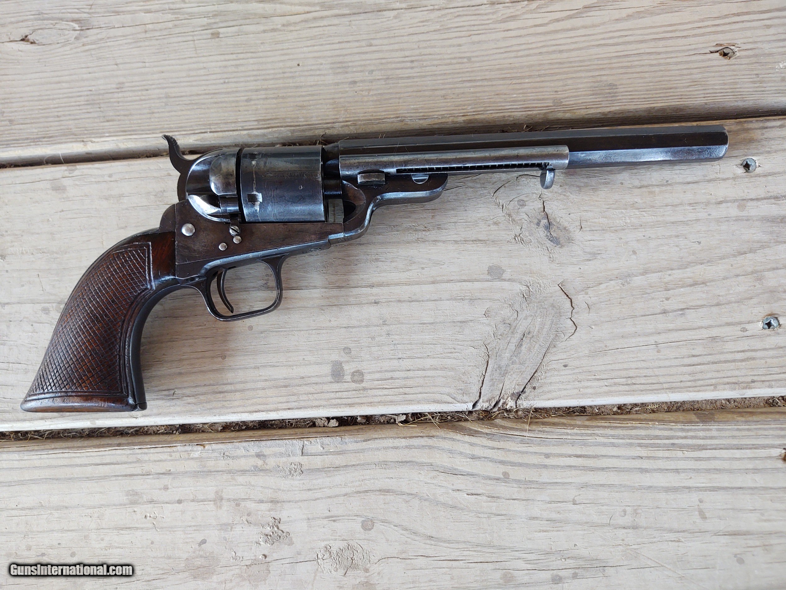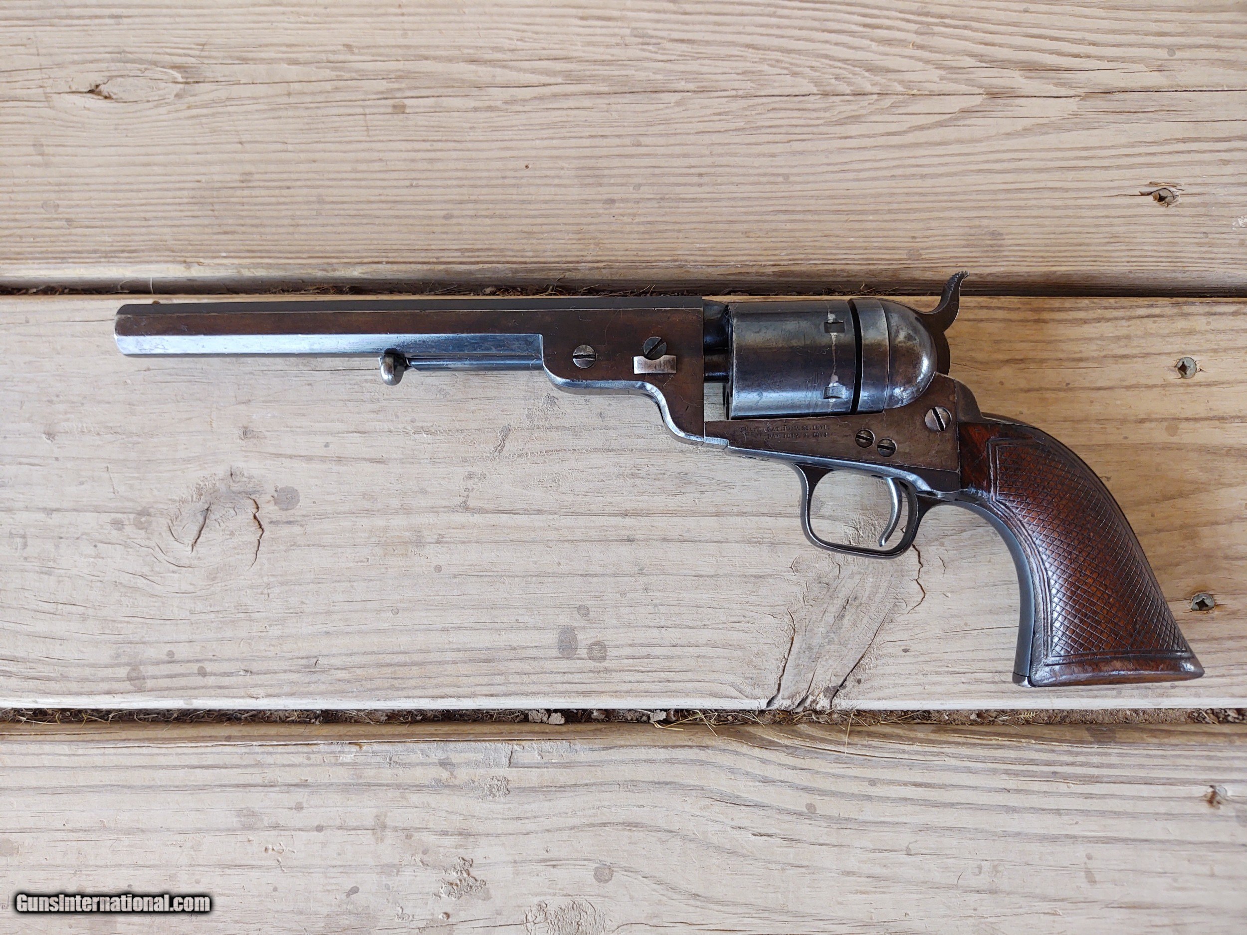 Description: This is a fine and rare USN martially marked Colt M1851 Navy model revolver. These M1851 revolvers were produced from 1852 thru 1859, and during that time period, about 2,750 M-1851 Navy cvaliber revolvers were purchased by the US Navy. This revolver is stamped with the Naval Inspector's initials "J.L.H." and "U.S.N." on the bottom of the backstrap, indicating inspection by Commander James L. Henderson, who inspected small arms at Norfolk from June of 1857 through April of 1861, and indicating it's issuance to the US Navy. The Navy subsequently contracted with the Colt factory to alter some 2,200 revolvers to accept metallic cartridges, of which about 1,000 are estimated to have been the Colt M1851 Navy. This pistol is serial numbered 58933 on its principal parts, giving it an 1856 production date and putting it in the 55500 to 62000 serial number range of the Navy’s first contract purchase of 2,000 revolvers. The revolver has a second inspector's marking as well with the inspector's initials "R.W.M." and an anchor symbol on the bottom of the barrel, indicating inspection by Richard W. Meade. This revolver was issued as a percussion revolver to the US Navy, under the backstrap inspector's mark of JLH/USN, and it was later returned by the Navy to the Colt factory for conversion to .38CF with the rare Richards-Mason centerfire conversion under the Naval conversion contract. It was then re-issued back into naval service under the RWM inspector's mark. The barrel number does not match the frame/backstrap numbers, and this is common to revolvers sent back for a second trip to the Colt factory, as many part numbers were not matched during the conversion/refurbishment contract, as well as some parts receiving some softening of the original stampings from the Colt factory polishing/rebluing effort. The revolver is in excellent mechanical shape, with an absolutely tight hammer/cylinder lockup and a very crisp trigger. The bore is bright, with strong sharp rifling and very modest, light scattered powder fouling in the lands. Barrel edges are sharp and the ejector has the Colt bullseye head. The screwheads are not marred. The cylinder scene is lightly visible and the cylinder has a slight drag mark around it's circumference. The frame has aged to a dull patina and the bluing on the barrel, backstrap and cylinder has aged to an almost even patina to match the frame patina. The grips, while they are not officially "naval", are finely checkered, retain almost all the original finish and have no chips or marring. Overall, this is an excellent example of a scarce Naval issued Colt M1851 Navy in good to fine condition that has been factory converted to .38CF under the Richards-Mason patent. The pictures are the best description of this fine and rare "Navy Navy" conversion, and this revolver will be a wonderful addition to your Colt revolver collection. Sold as a collector piece only. Payment via personal check/postal Money Order ONLY; no credit cards, bank checks, PayPal, etc.; revolver will be shipped after payment is cleared by the bank; email me for all questions and/or requests for additional pictures. $95 for shipping and insurance to lower 48 (will be shipped in a box/ hard case). Thanks for the interest. SOLD Antique: Yes Manufacturer: Colt Model: 1851 Serial Number: 58933 Barrel Length: 7.5 inches Condition: fine Metal Condition: fine Wood Condition: good Bore Condition: good |