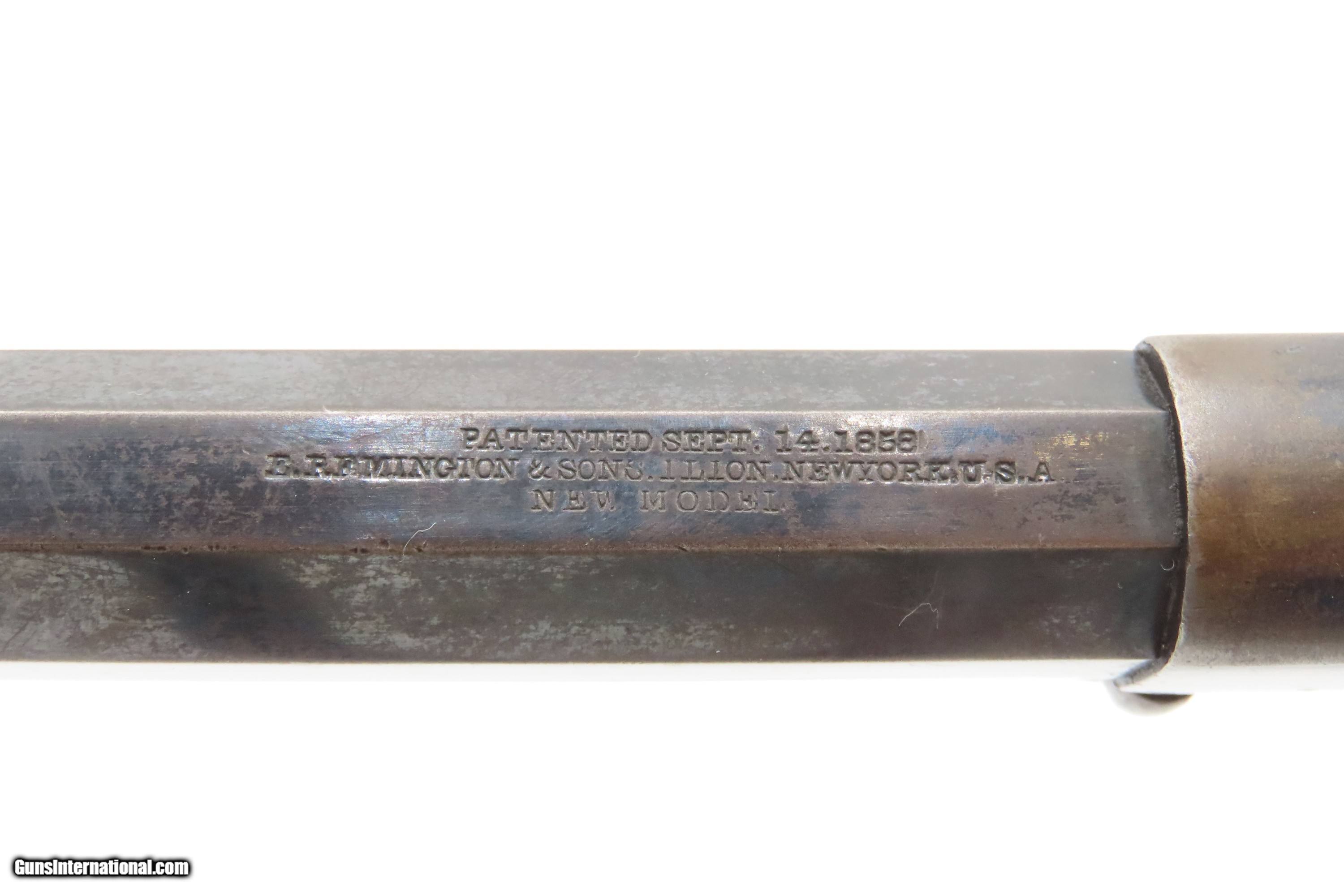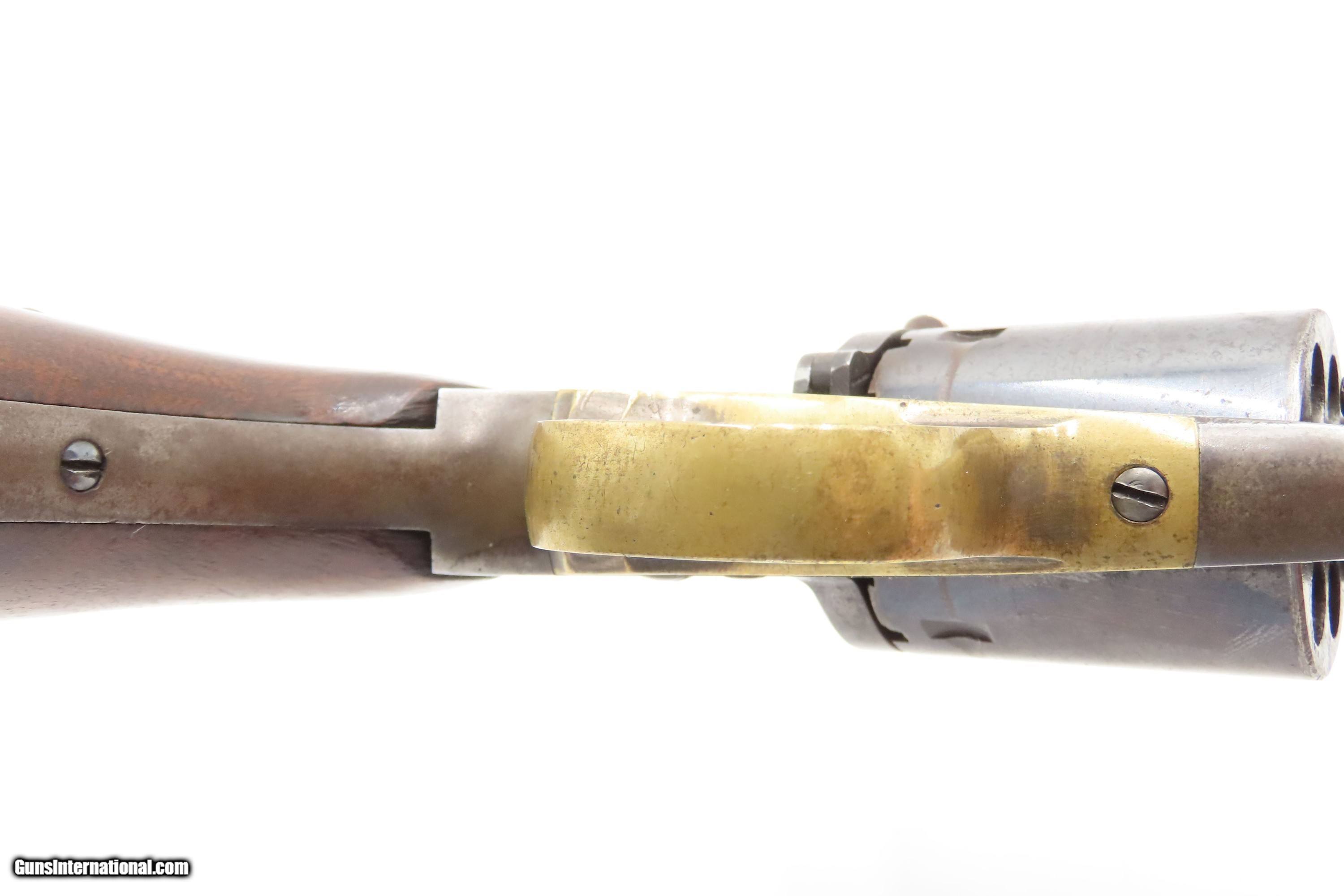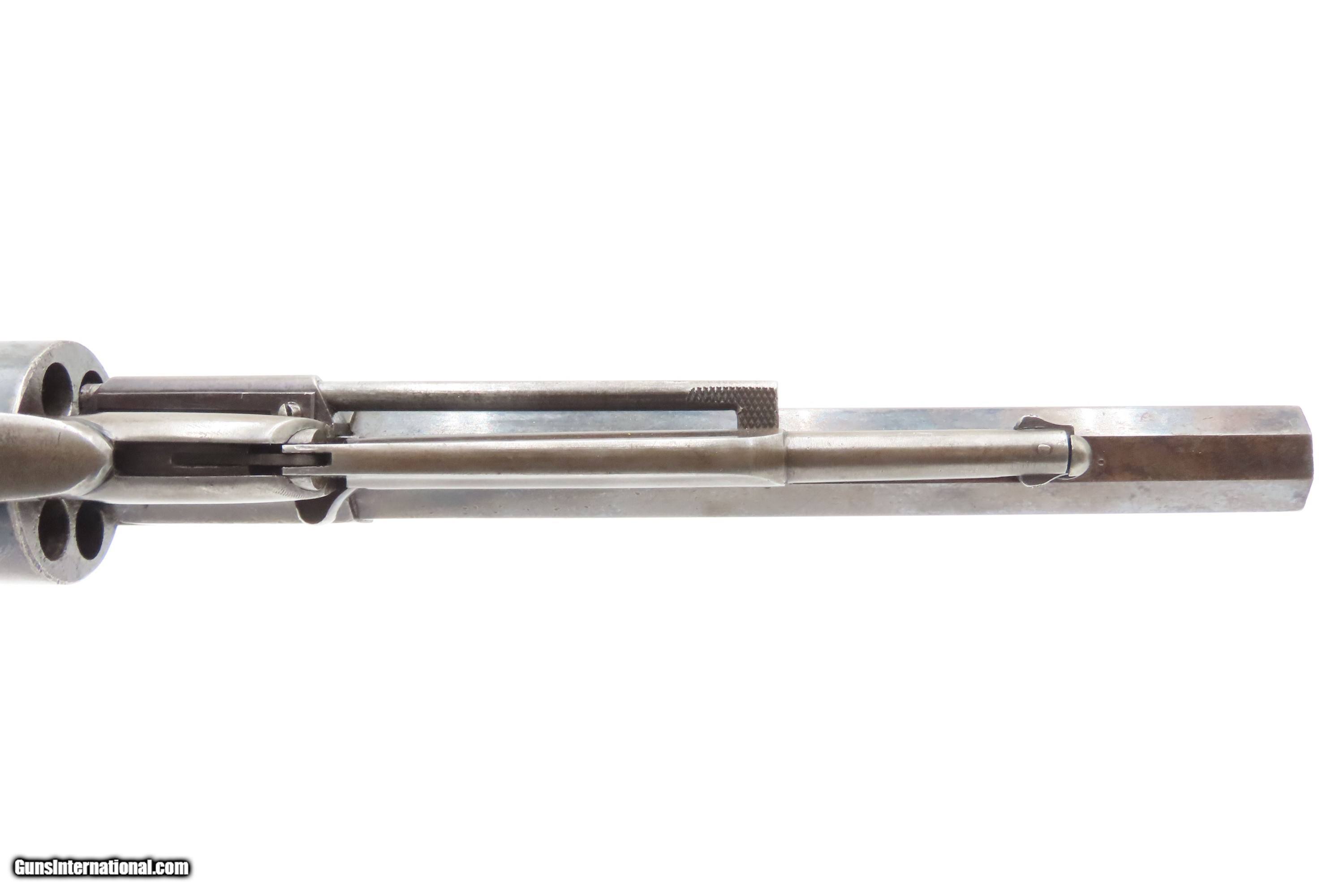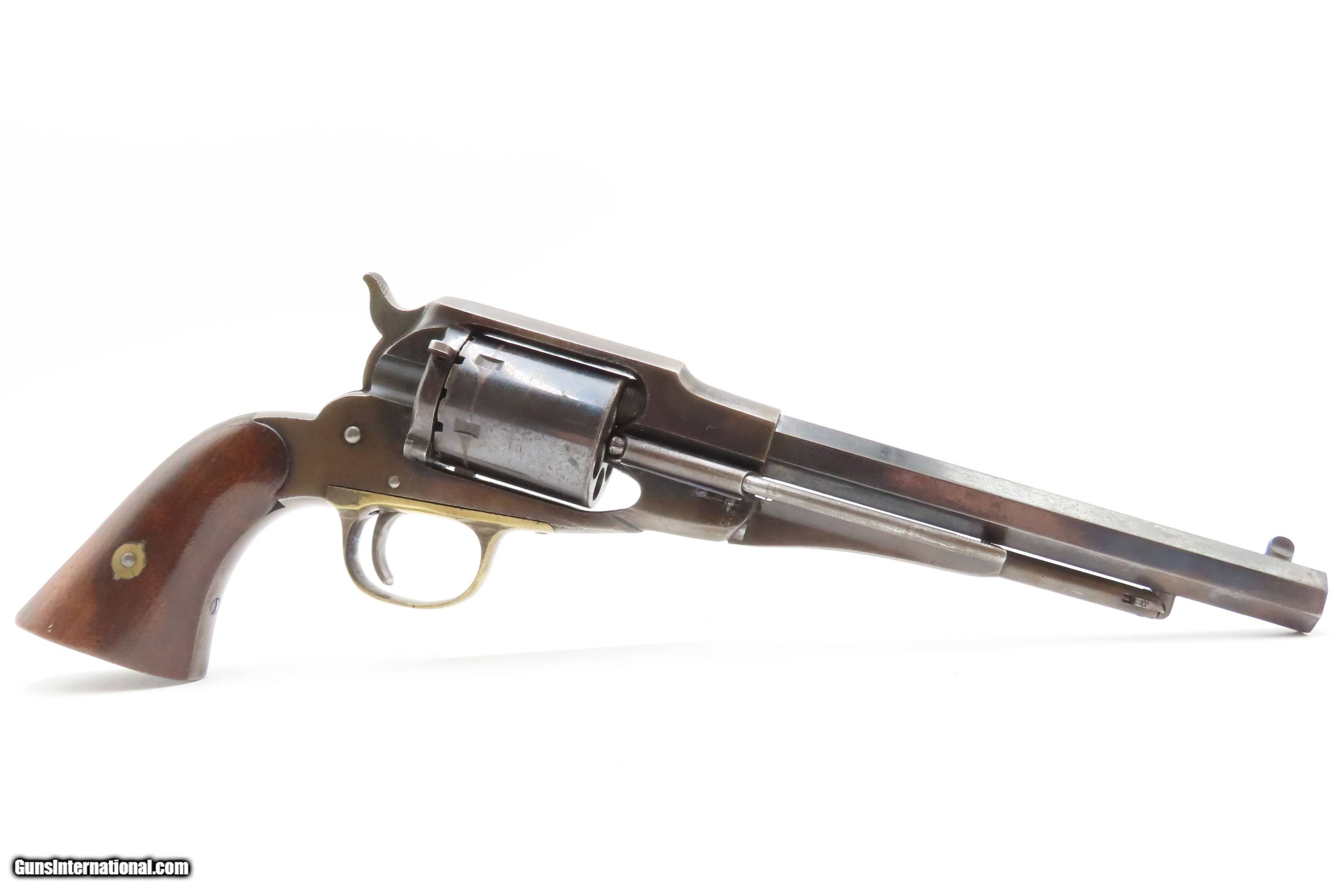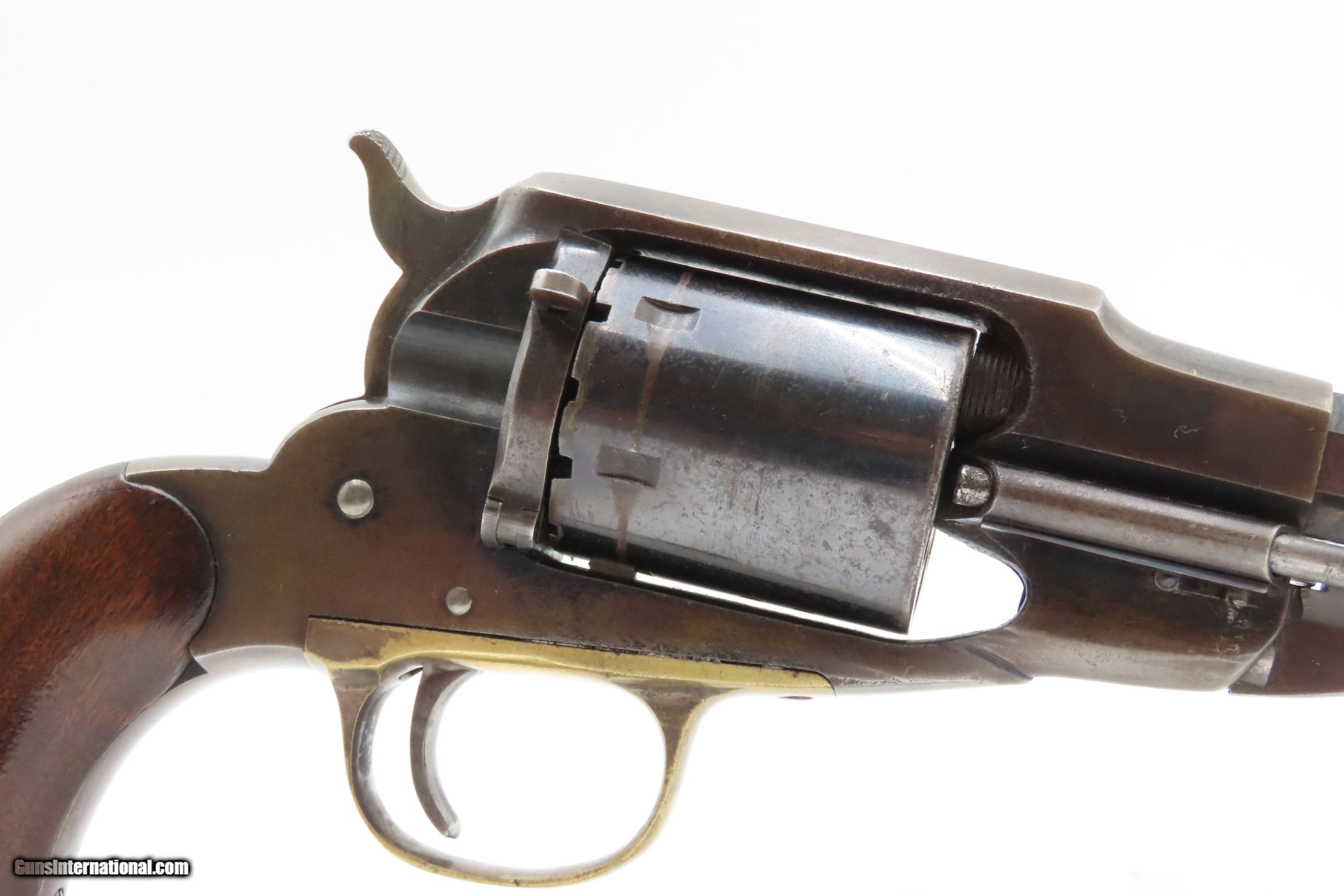 Description: 1870s ENGRAVED Antique REMINGTON .38 RF Cartridge Conversion New Model NAVY Remington New Model NAVY REVOLVER in .38 Rimfire Here Ancestry Guns presents an antique U.S. Remington New Model Navy Cartridge Conversion Revolver, made circa 1863 to 1878 in Ilion, New York. About 28,000 New Model Navy revolvers were converted/made, some of them leaving the Remington factory in this configuration. These revolvers were converted from percussion to utilize .38 Rimfire cartridges, making these very desirable in the budding metallic cartridge revolver market. Smith & Wesson’s infamous Rollin White Patent was just expiring. The U.S. Navy even experimented with a small contract of these revolvers in this configuration, with a loading gate and ejector rod built in. These Navy models were fitted with hinged and latched loading gates, and nearly all came with ejector assemblies. These revolvers sold for a whopping $9.00. With the end of the Civil War, the U.S. military found itself in possession of hundreds of thousands of percussion revolvers that it no longer needed, and almost immediately started the process of selling off nearly all of the “secondary” percussion revolvers, which were those not produced by Colt or Remington. The Ordnance Department also realized that the day of the percussion revolver was over, and that metallic cartridges had made percussion arms obsolete. Remington would continue to pay this royalty until the expiration of White’s patent protection in April of the following year. During that time, Remington would produce 4,574 cartridge revolvers with bored through cylinders, getting a jump on Colt in the cartridge revolver market. It is possible that this example is a factory original cartridge gun. It is marked with the conversion assembly number “631”. The overall condition is fine. Some original finish is preserved on the barrel and frame, with much remaining on the cylinder. Shiny bright bore retain sharp rifling. Crisp markings. Both grips are solid with are average amount of handling. Matching visible numbers. Here is a very scarce and desirable factory cartridge conversion of Remington’s New Model Navy! Own the original! This is a legitimate antique and not a reproduction. Barrel is 7-3/8 inches. Caliber: .38 Rimfire Overall condition as seen in photos. Very Fast. Very Safe. FREE SHIPPING WORLDWIDE. Delivered directly to your door by express mail! Guaranteed AUTHENTIC & Includes CERTIFICATE OF AUTHENTICITY. $2800 #259335 Antique: Yes Price: $2,800.00 Buy Now Pay with