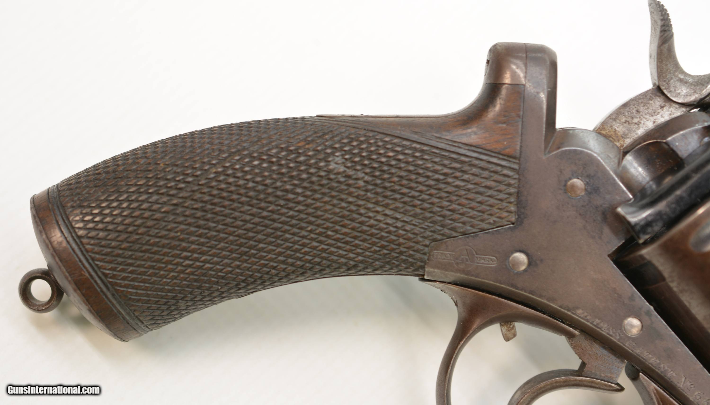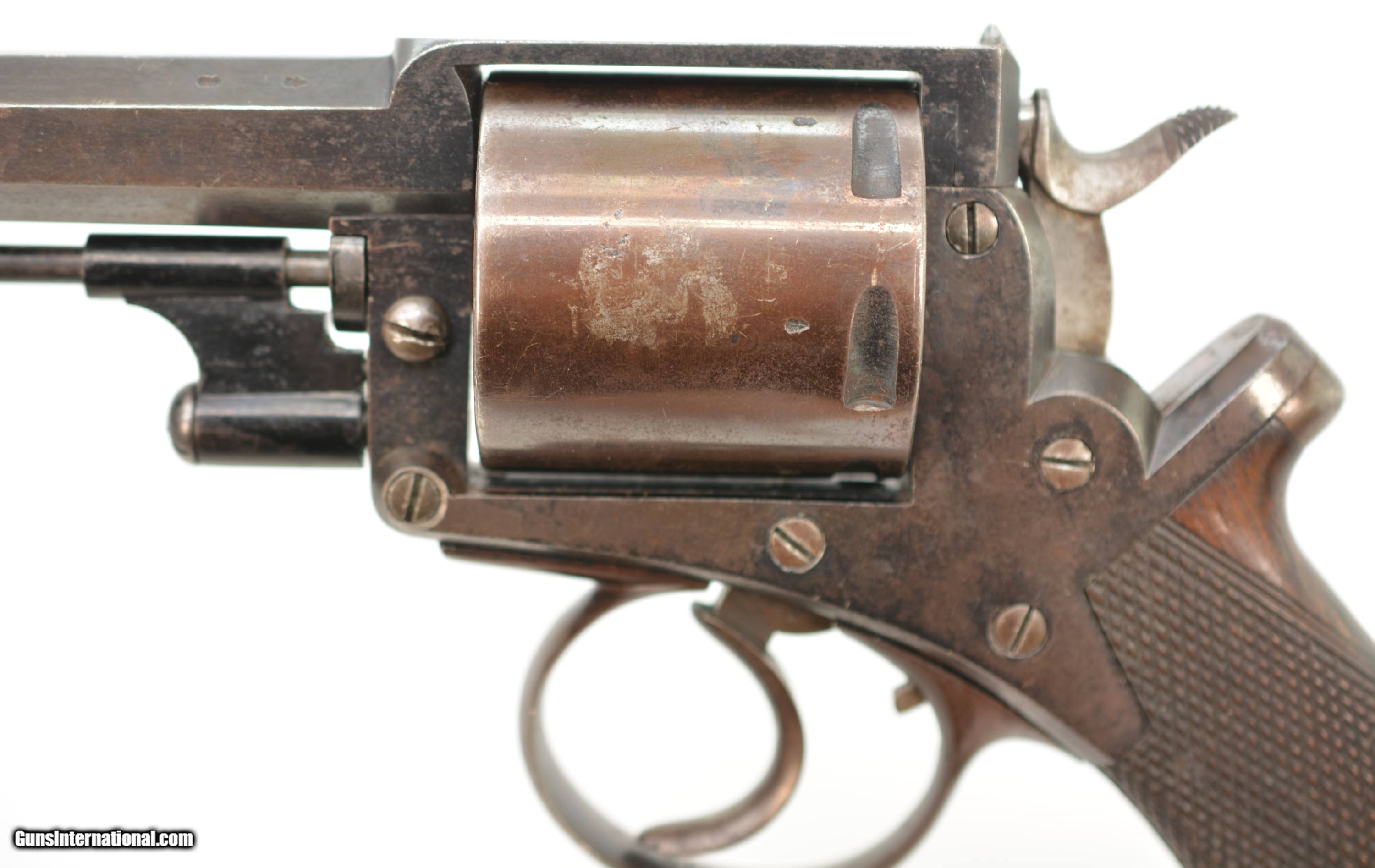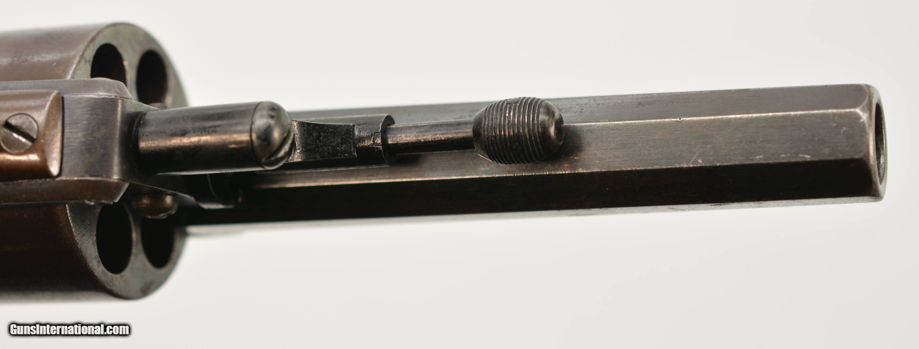 Description: Serial #6551, .450 CF, 4 1/2" octagonal barrel with a good bore that has mild freckling and light pitting along its length. This revolver retains 75-80% of the original bright blue finish, with the balance turned to smooth plum-brown patina, especially on the cylinder, as well as some silvering along the edges and corners. The Adams commercial markings are crisp and clear on the right side, while the topstrap and barrel are engraved: “WM POWELL & SON CARR"S LANE BIRMINGHAM". The checkered walnut grip is in very good condition without any cracks or chips, but there is some light-moderate flattening of the points. The mechanism is fully functional, and the revolver rates very fine-near excellent condition overall. The revolver was purchased from noted British handgun author Joel Black, who himself purchased it from the renowned Nunnemacher Collection (the bulk of which now resides in the Milwaukee Public Museum). This is a great looking example of a late production, .450 Adams revolver, and has quite a bit of original finish remaining. Antique SOLD Antique: Yes Manufacturer: Adams Model: 1872 Serial Number: 6551 Caliber Info: .450 Gauge Info: .450 |