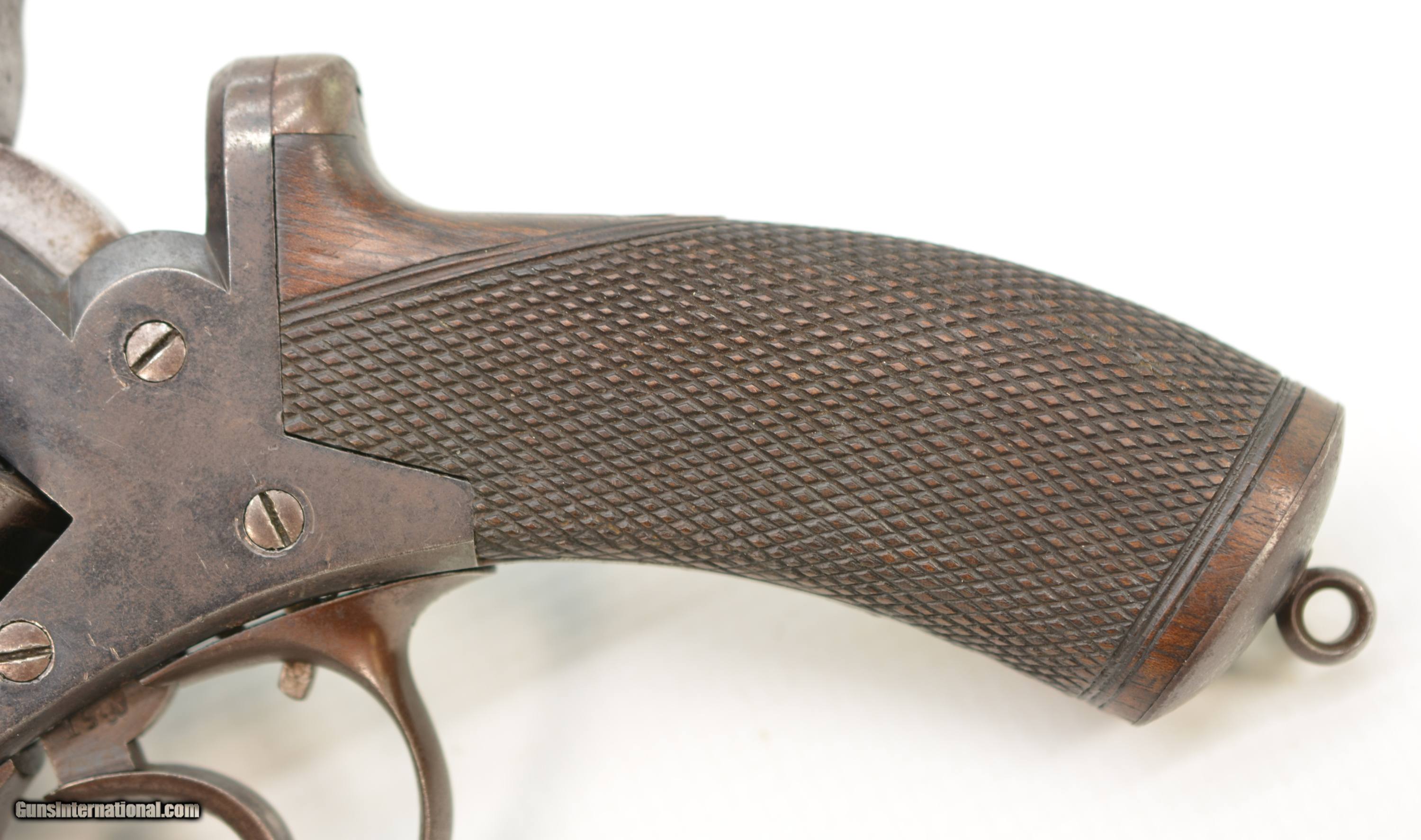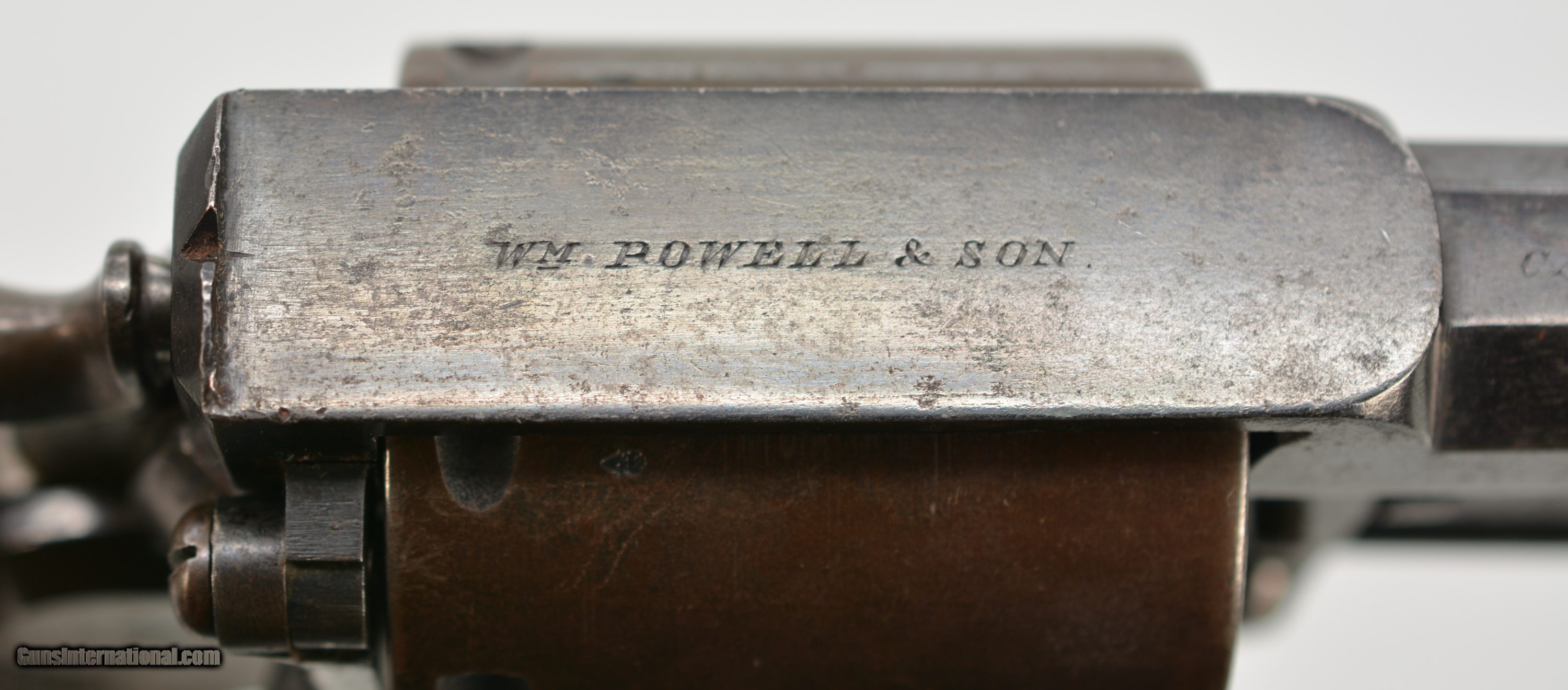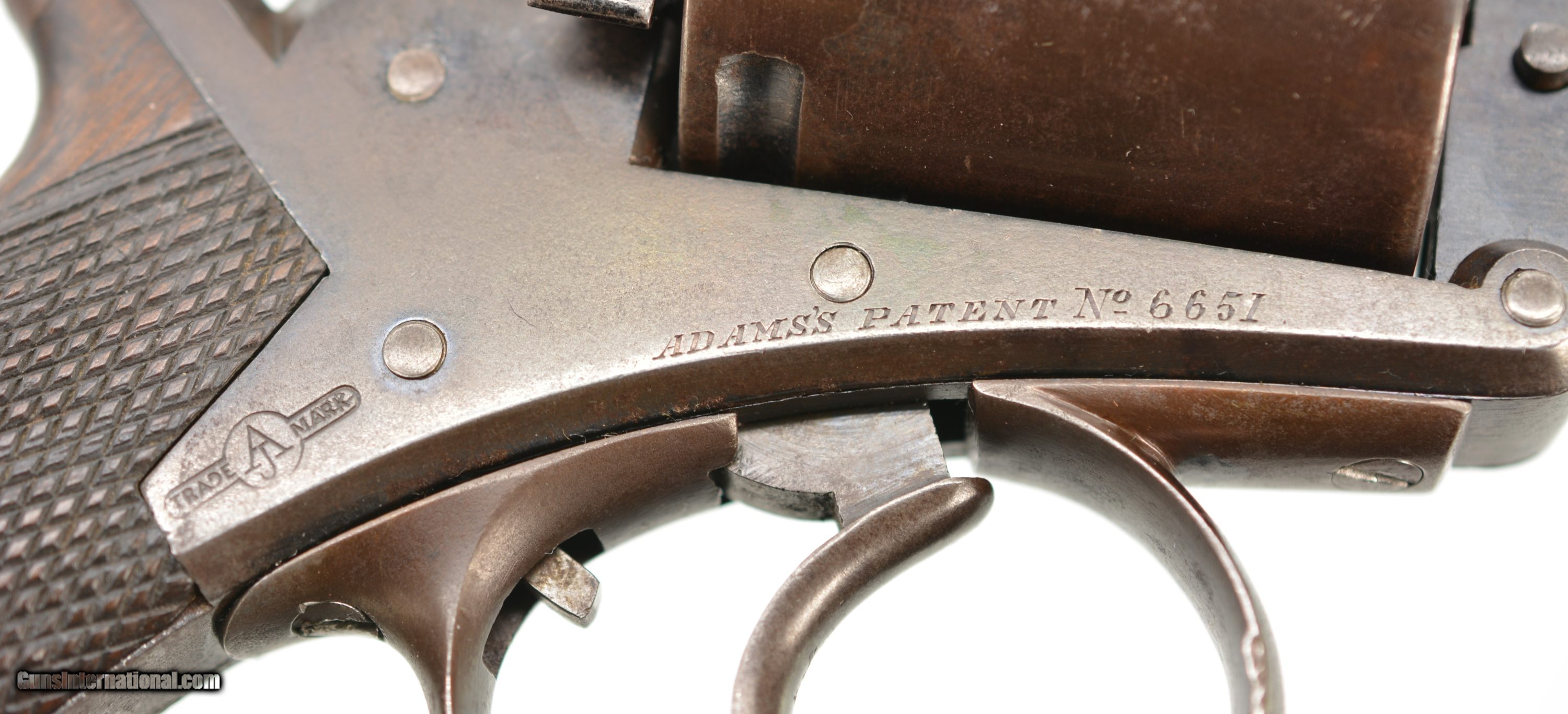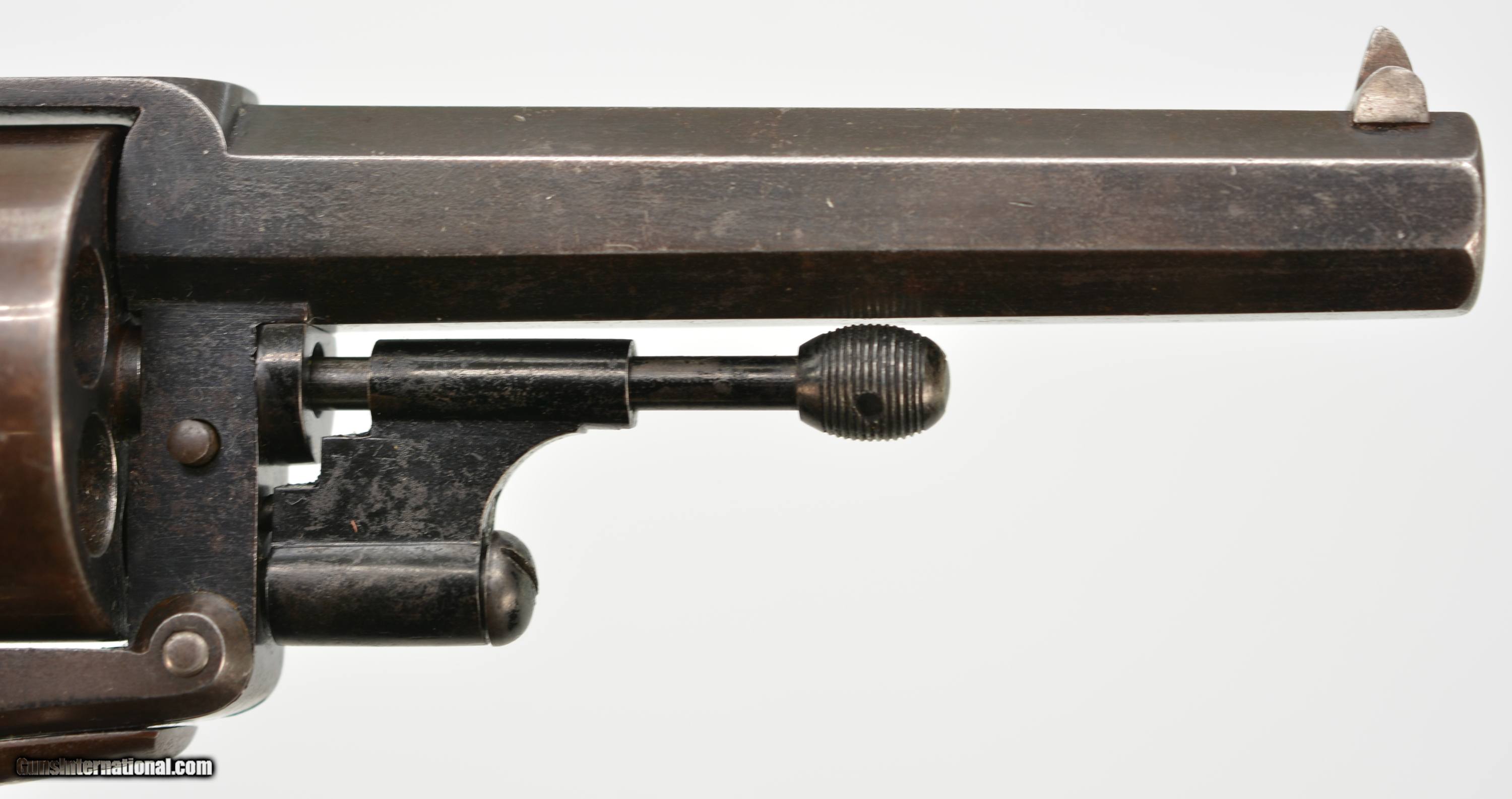 Description: Serial #6551, .450 CF, 4 1/2" octagonal barrel with a good bore that has mild freckling and light pitting along its length. This revolver retains 75-80% of the original bright blue finish, with the balance turned to smooth plum-brown patina, especially on the cylinder, as well as some silvering along the edges and corners. The Adams commercial markings are crisp and clear on the right side, while the topstrap and barrel are engraved: “WM POWELL & SON CARR"S LANE BIRMINGHAM". The checkered walnut grip is in very good condition without any cracks or chips, but there is some light-moderate flattening of the points. The mechanism is fully functional, and the revolver rates very fine-near excellent condition overall. The revolver was purchased from noted British handgun author Joel Black, who himself purchased it from the renowned Nunnemacher Collection (the bulk of which now resides in the Milwaukee Public Museum). This is a great looking example of a late production, .450 Adams revolver, and has quite a bit of original finish remaining. Antique SOLD Antique: Yes Manufacturer: Adams Model: 1872 Serial Number: 6551 Caliber Info: .450 Gauge Info: .450 |