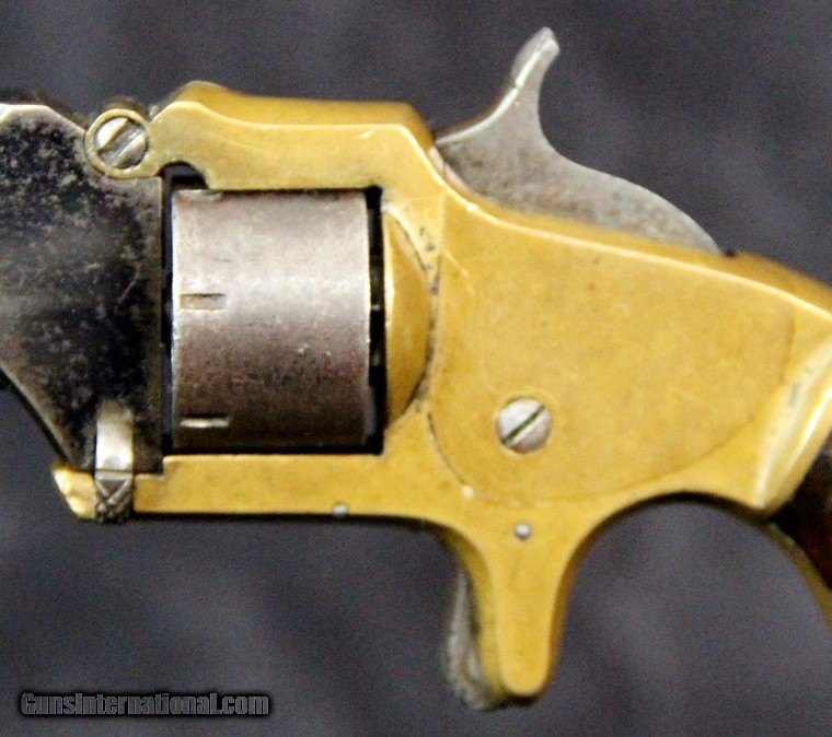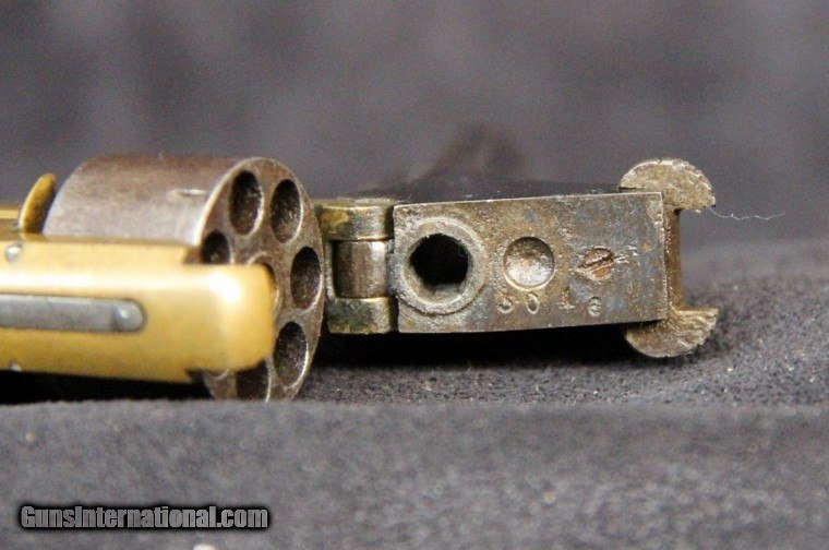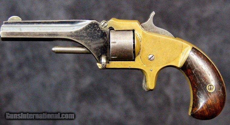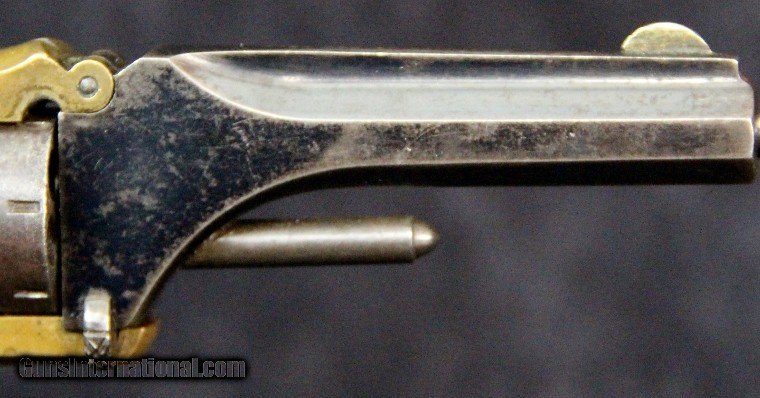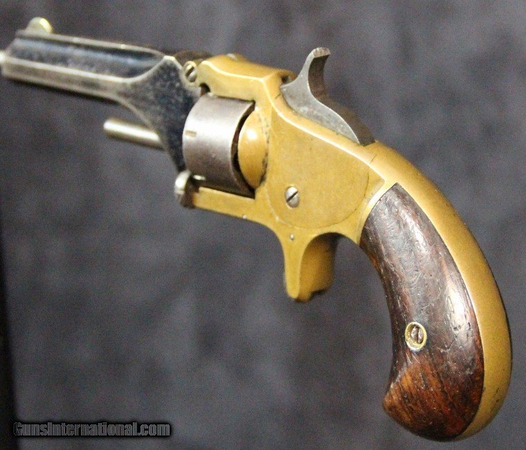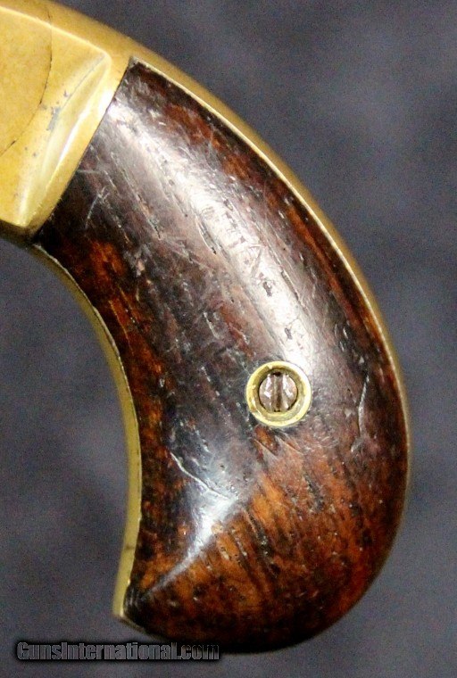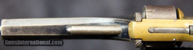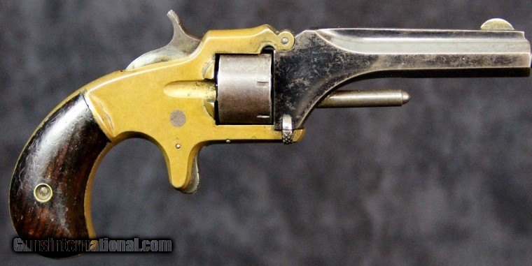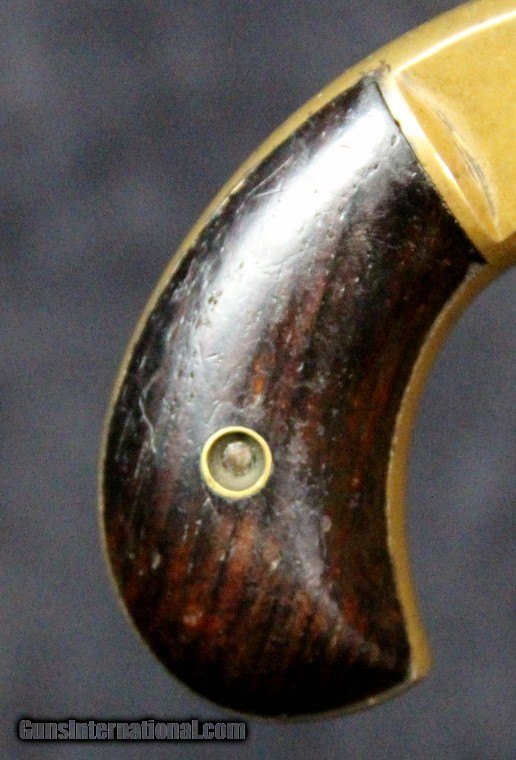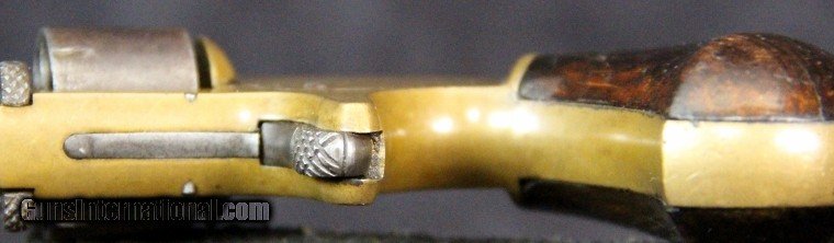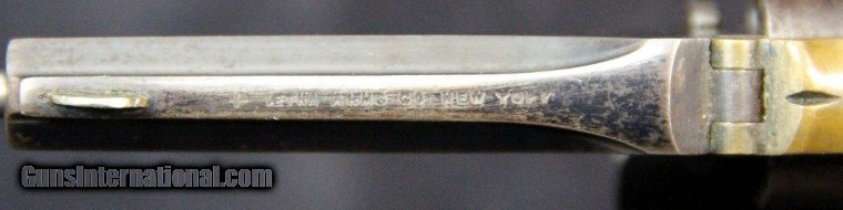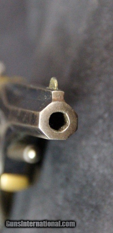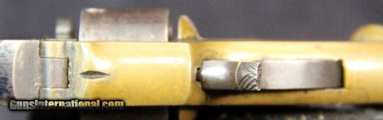 Description: .22rf, short, #5016, 3 1/16 inch barrel, blue and brass finish, 2 piece rosewood grips, manufactured from 1869-1880. Condition: good bore with scattered oxidation, 70% barrel blue, 40% cylinder blue fading, smooth mustard colored frame, very good grips, excellent mechanically, excellent marks. SOLD Antique: Yes |