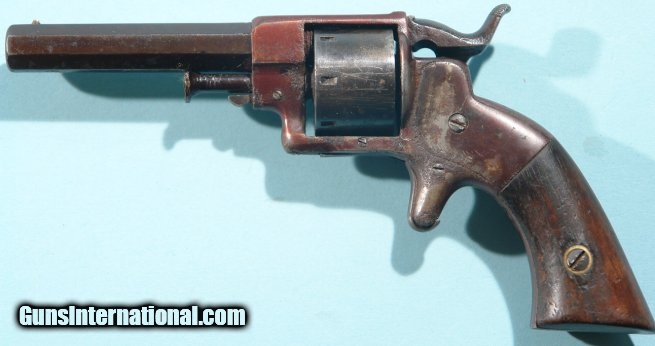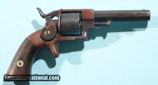 Description: ALLEN & WHEELOCK SIDE HAMMER .22RF POCKET REVOLVER. Antique revolver. Refinished overall and now a nice dark blue and plum color. No identifying marks on it remaining. Excellent original walnut grips have not been sanded. Some salt & peppering on frame under plum color. Strong mainspring but does not hold at full cock. ALL of the original parts just not color. Be nice for display or parts gun. SOLD Antique: Yes |