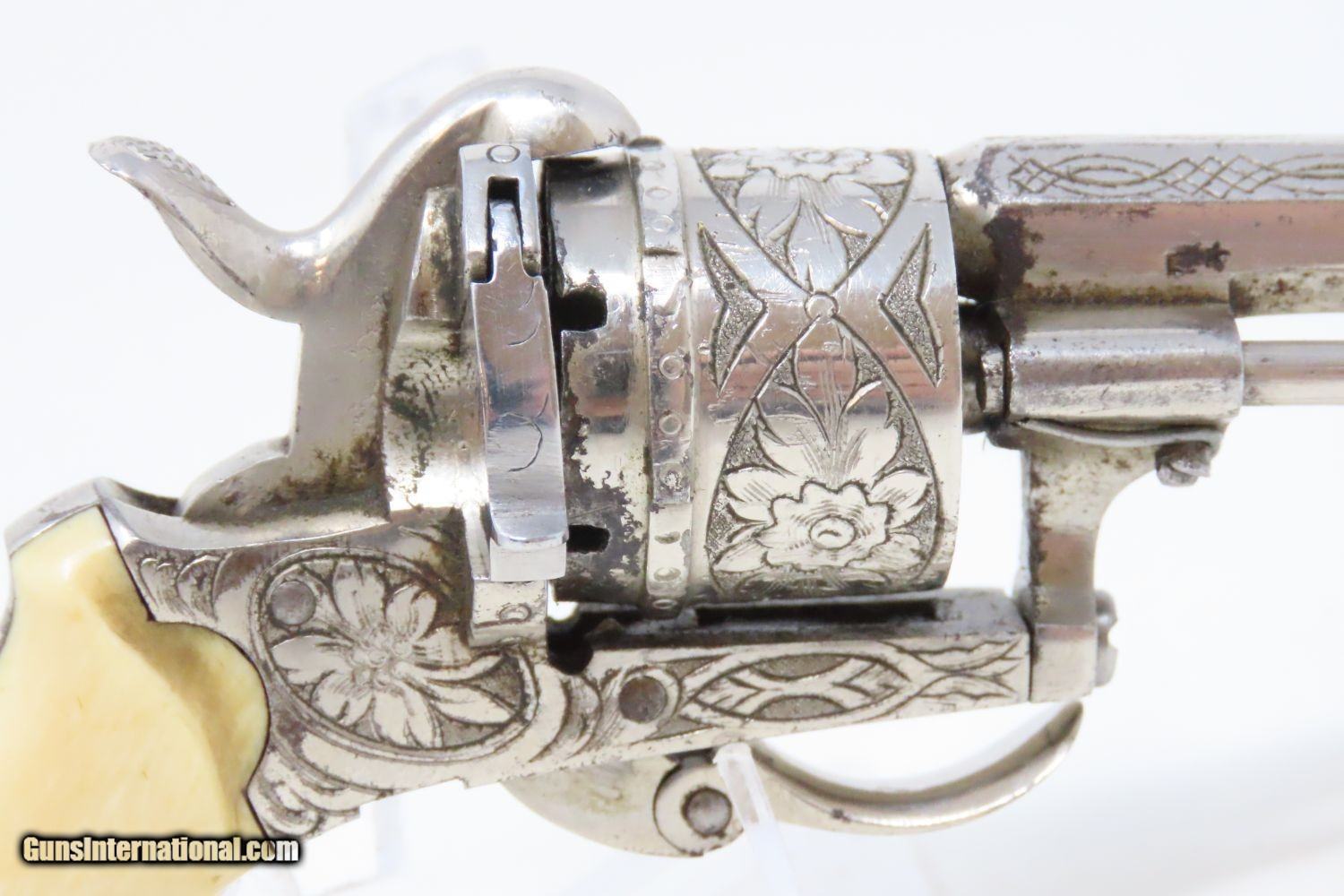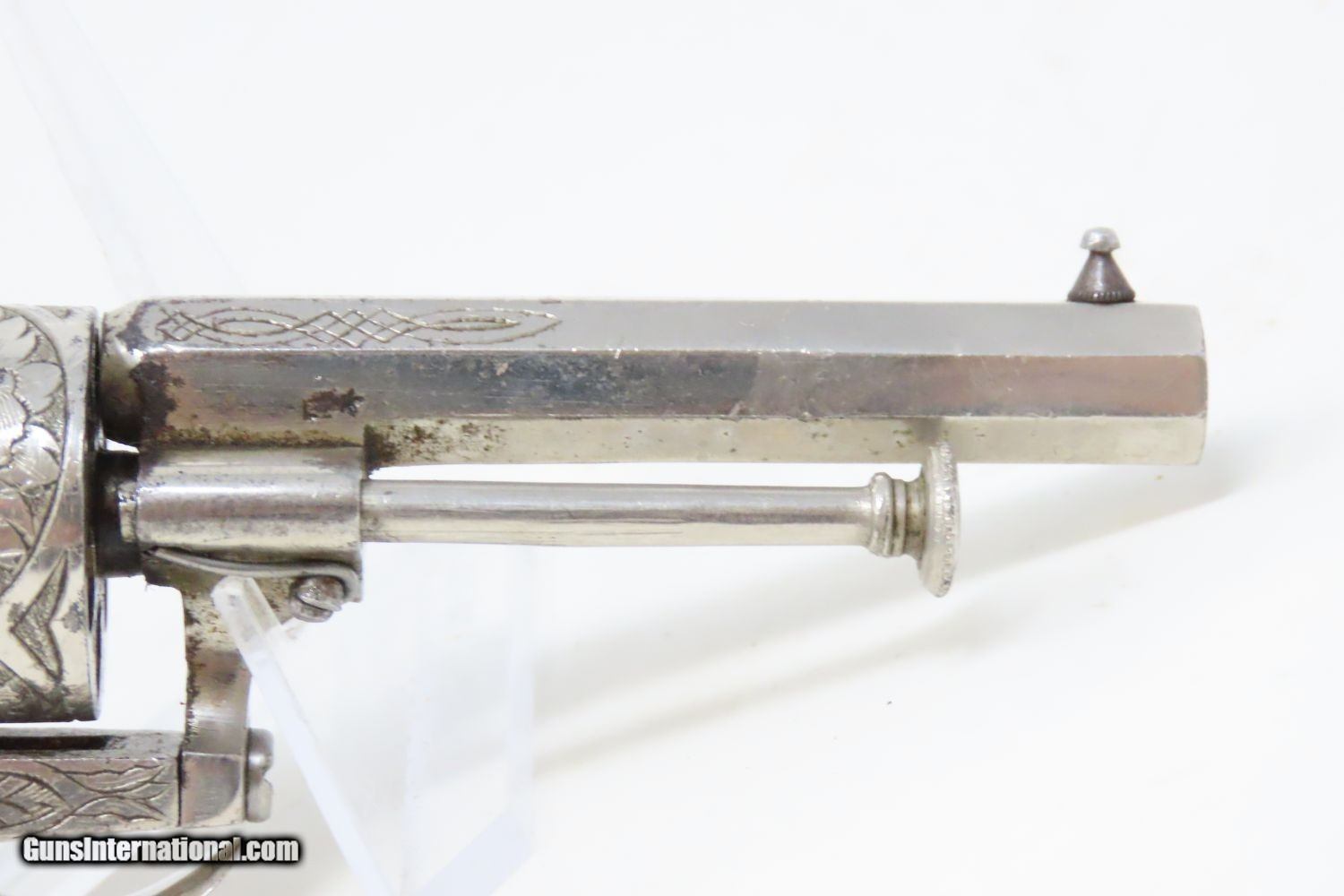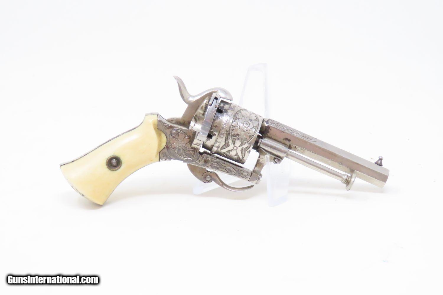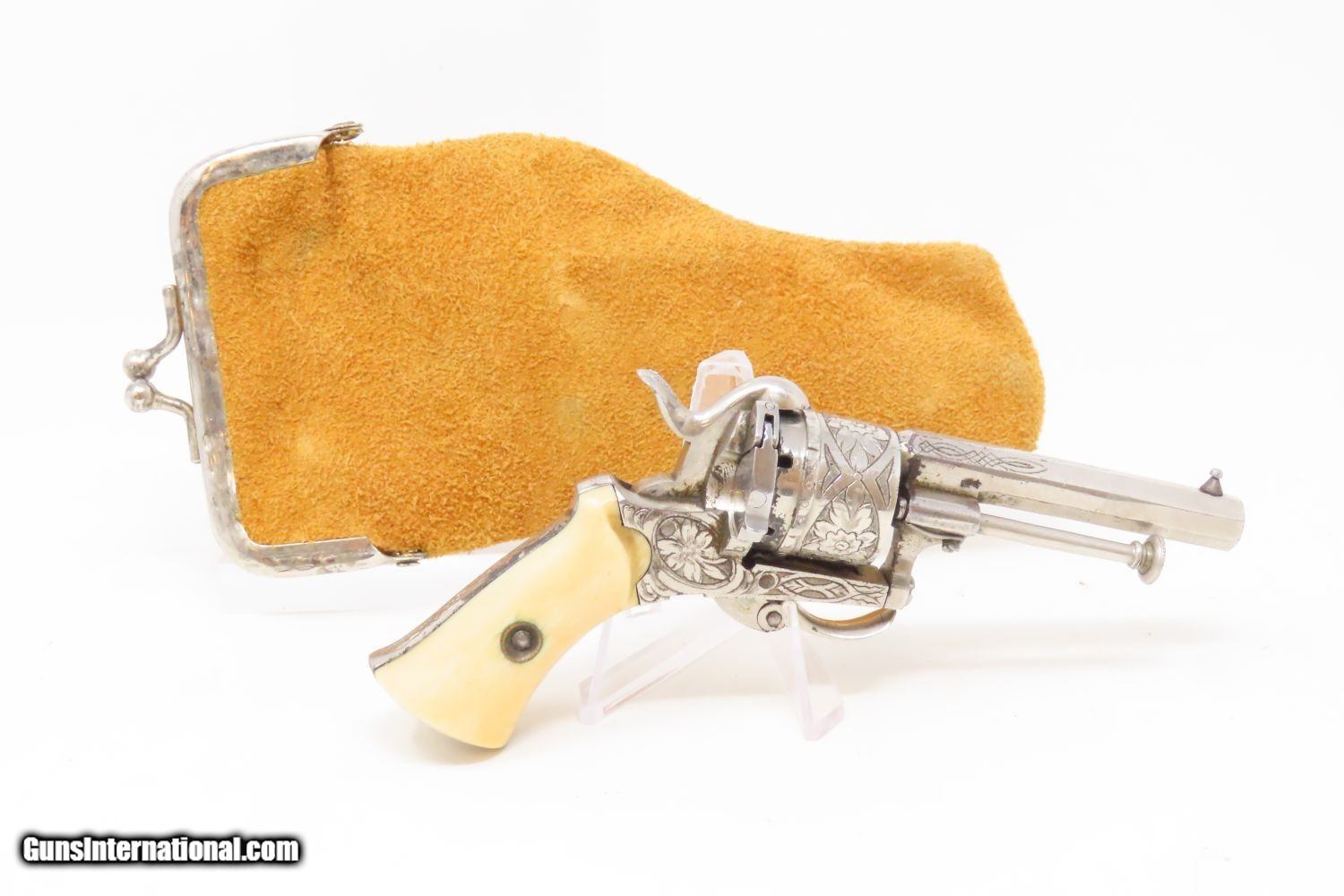 Description: Antique ENGRAVED, NICKEL, IVORY European PINFIRE REVOLVER 5.5mm “EL” With Period Purse Holster & Folding Trigger! Here we present an antique Belgian Pinfire Revolver, made circa the 1850s. In 1830, notable gun maker and inventor Casimir Lefaucheux invented the pinfire cartridge and patented it in 1835 to become one of the first self-contained firearms cartridges. This very early design included a case with ball, powder and primer, but what made it different from what was to come later in cartridge development was the “firing pin” that projected out of the side of the case. It was this pin that was struck and detonated the primer inside. His son, Eugene, would build on Casimir’s invention, designing a pistol to take advantage of it. The hammer would be flat and smash down on the side of the cylinder, from which the pin of the cartridge would project. This revolver and pistol design would become prolific, especially in Europe throughout the 19th Century, being adopted by militaries, used by civilians and police, and even being sold for use during the American Civil War. Many makers made both licensed and unlicensed copies. The overall condition is near fine. The action is strong, although the trigger return spring is a little weak. The bore is semi-bright in good shape. Both grips are firm and the initials “EL” are attractively carved on the bottom. “The leather purse is in good shape. A very attractive little revolver from the mid-19th Century! Own the original! This is a legitimate antique and not a reproduction. Barrel is 2-3/8 inches. Caliber: 5.5mm Pinfire Overall condition as seen in photos. Very Fast. Very Safe. FREE SHIPPING WORLDWIDE. Delivered directly to your door by express mail! Guaranteed AUTHENTIC & Includes CERTIFICATE OF AUTHENTICITY. ancestryguns $1085 #201047 SOLD Antique: Yes |
