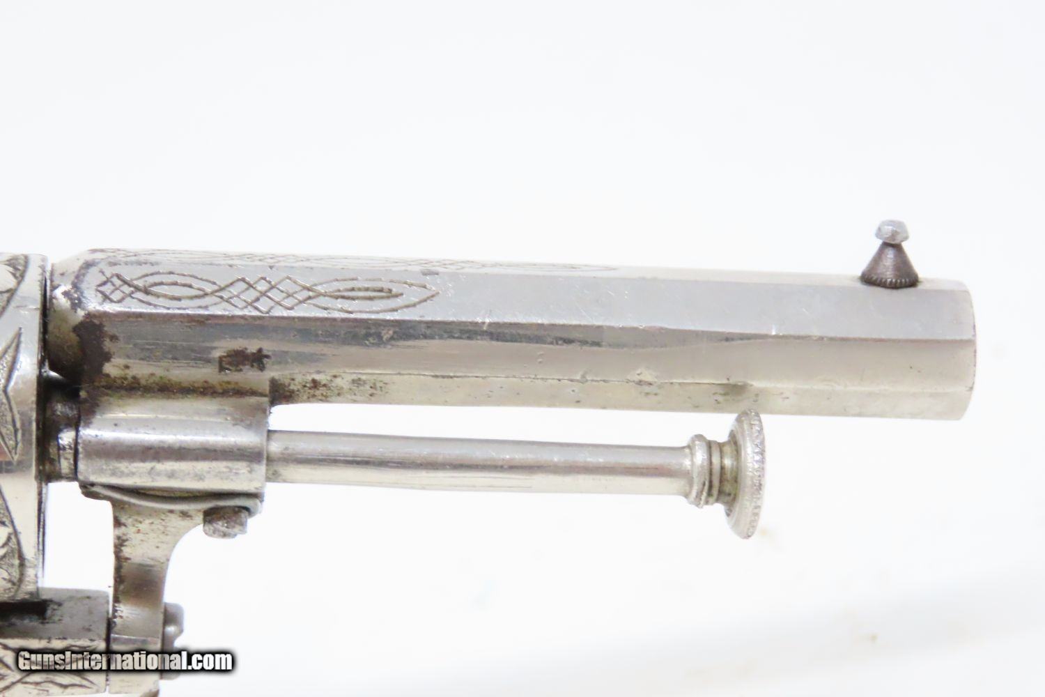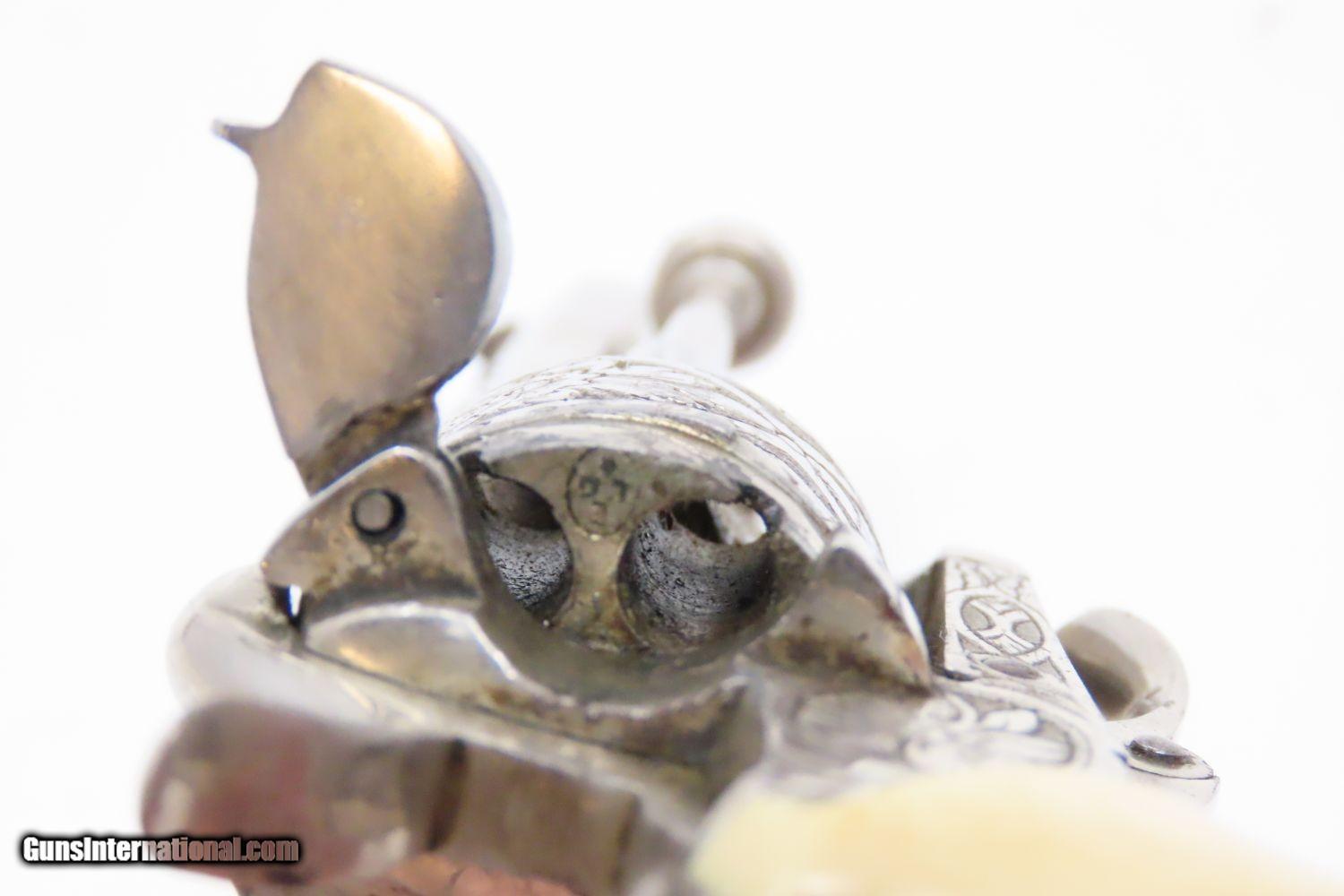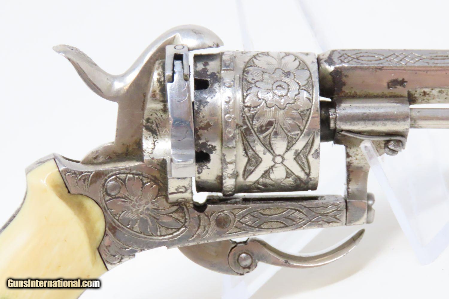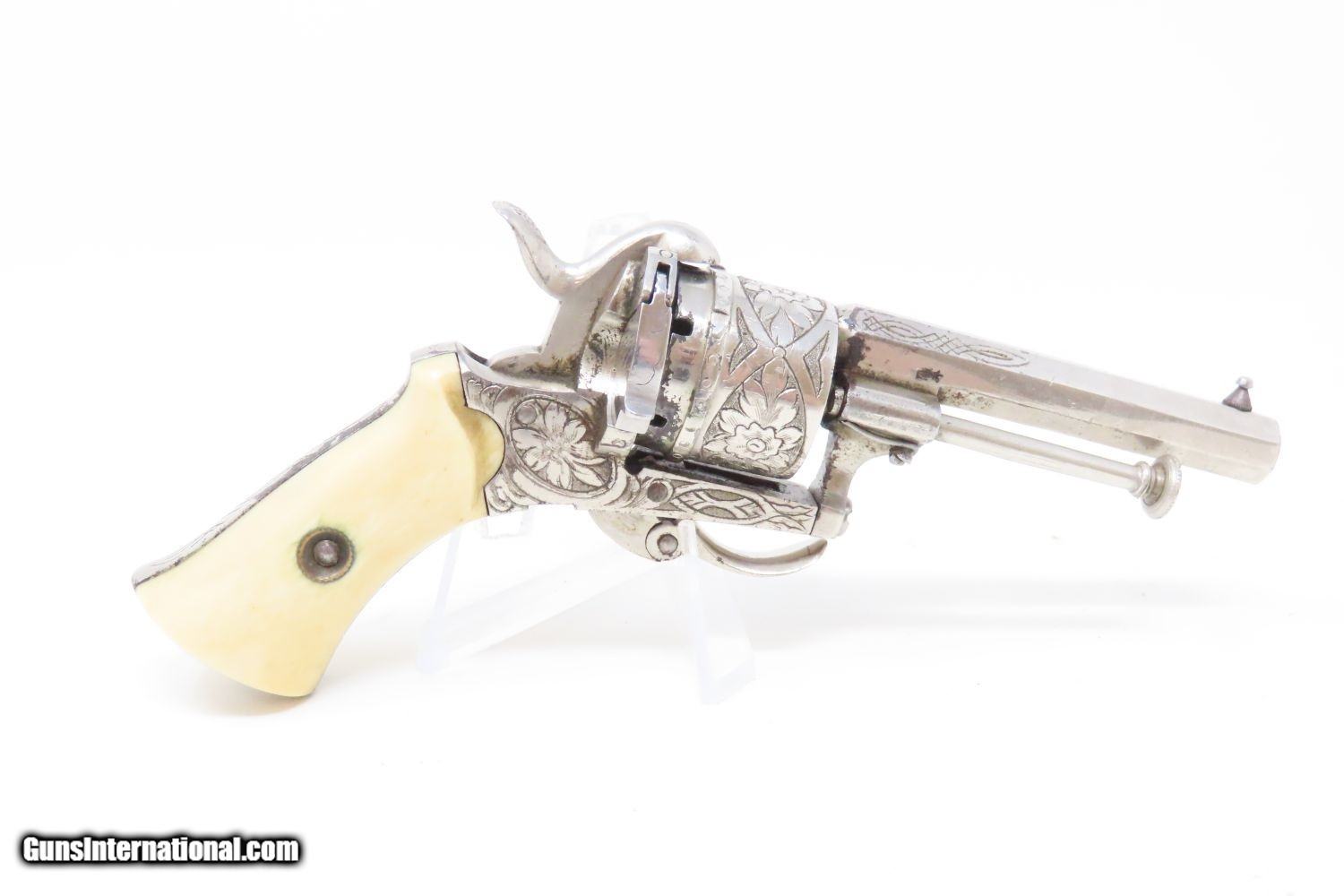 Description: Antique ENGRAVED, NICKEL, IVORY European PINFIRE REVOLVER 5.5mm “EL” With Period Purse Holster & Folding Trigger! Here we present an antique Belgian Pinfire Revolver, made circa the 1850s. In 1830, notable gun maker and inventor Casimir Lefaucheux invented the pinfire cartridge and patented it in 1835 to become one of the first self-contained firearms cartridges. This very early design included a case with ball, powder and primer, but what made it different from what was to come later in cartridge development was the “firing pin” that projected out of the side of the case. It was this pin that was struck and detonated the primer inside. His son, Eugene, would build on Casimir’s invention, designing a pistol to take advantage of it. The hammer would be flat and smash down on the side of the cylinder, from which the pin of the cartridge would project. This revolver and pistol design would become prolific, especially in Europe throughout the 19th Century, being adopted by militaries, used by civilians and police, and even being sold for use during the American Civil War. Many makers made both licensed and unlicensed copies. The overall condition is near fine. The action is strong, although the trigger return spring is a little weak. The bore is semi-bright in good shape. Both grips are firm and the initials “EL” are attractively carved on the bottom. “The leather purse is in good shape. A very attractive little revolver from the mid-19th Century! Own the original! This is a legitimate antique and not a reproduction. Barrel is 2-3/8 inches. Caliber: 5.5mm Pinfire Overall condition as seen in photos. Very Fast. Very Safe. FREE SHIPPING WORLDWIDE. Delivered directly to your door by express mail! Guaranteed AUTHENTIC & Includes CERTIFICATE OF AUTHENTICITY. ancestryguns $1085 #201047 SOLD Antique: Yes |