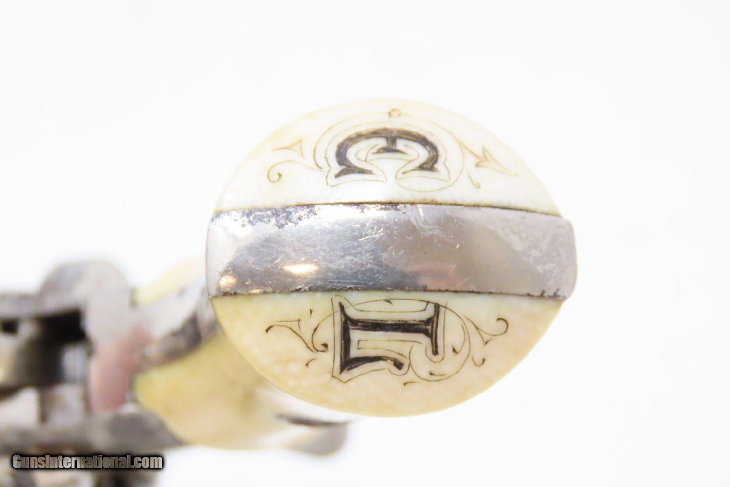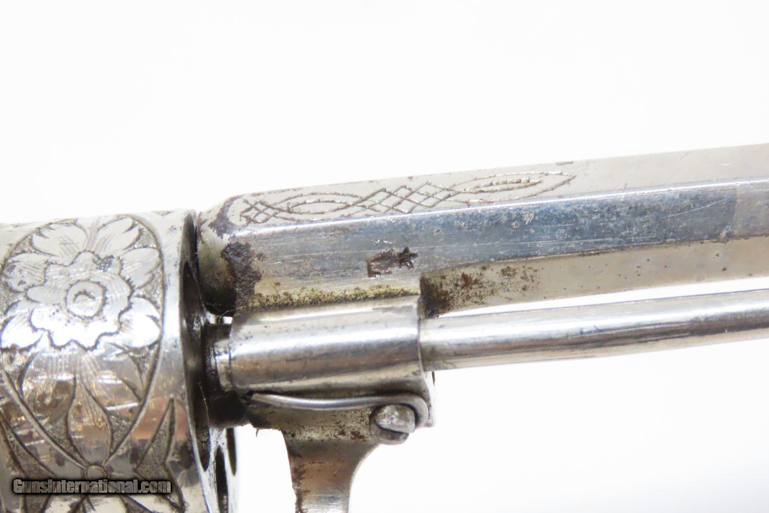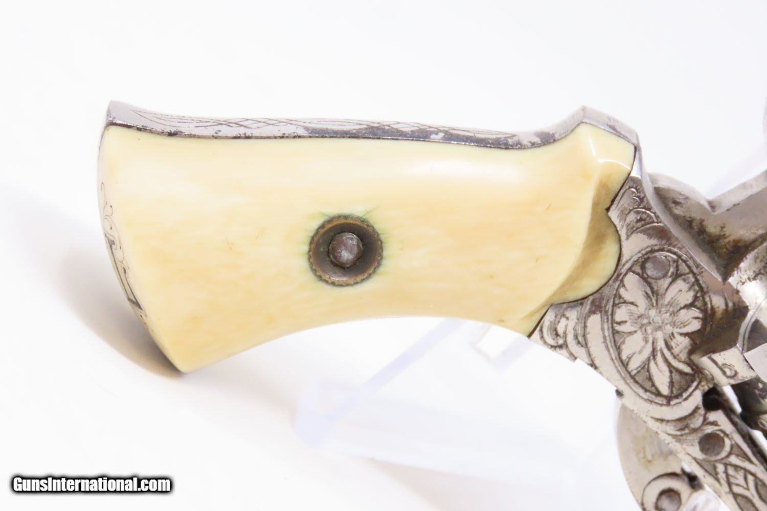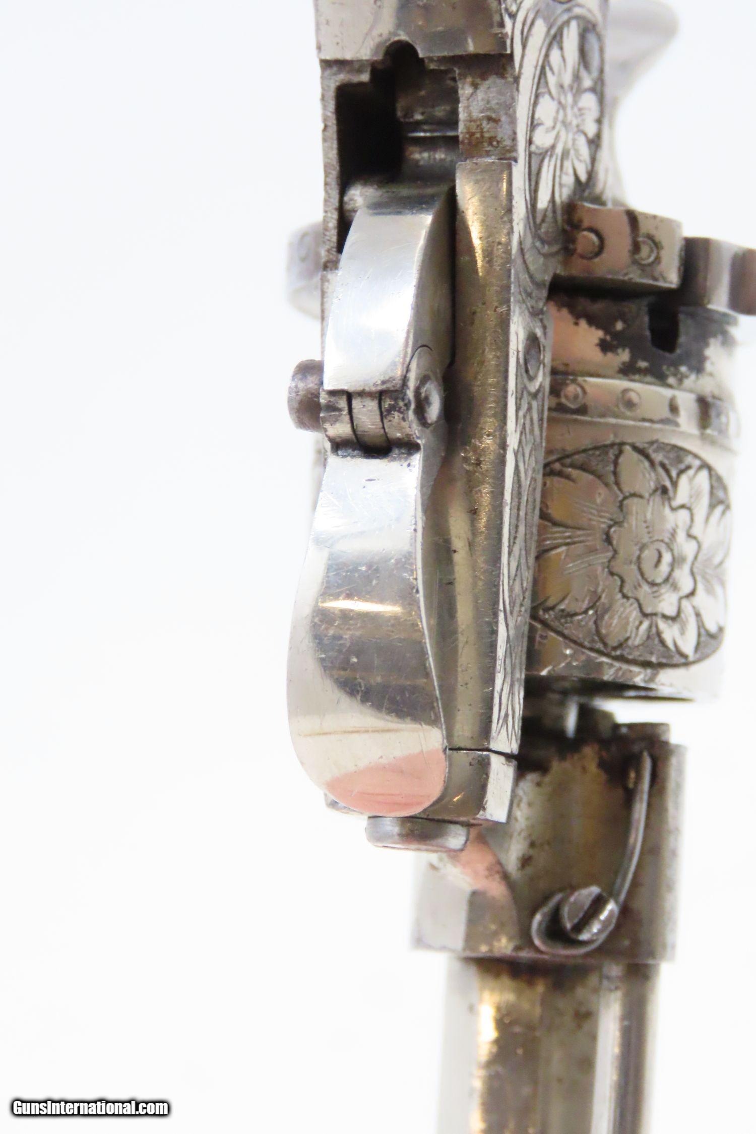 Description: Antique ENGRAVED, NICKEL, IVORY European PINFIRE REVOLVER 5.5mm “EL” With Period Purse Holster & Folding Trigger! Here we present an antique Belgian Pinfire Revolver, made circa the 1850s. In 1830, notable gun maker and inventor Casimir Lefaucheux invented the pinfire cartridge and patented it in 1835 to become one of the first self-contained firearms cartridges. This very early design included a case with ball, powder and primer, but what made it different from what was to come later in cartridge development was the “firing pin” that projected out of the side of the case. It was this pin that was struck and detonated the primer inside. His son, Eugene, would build on Casimir’s invention, designing a pistol to take advantage of it. The hammer would be flat and smash down on the side of the cylinder, from which the pin of the cartridge would project. This revolver and pistol design would become prolific, especially in Europe throughout the 19th Century, being adopted by militaries, used by civilians and police, and even being sold for use during the American Civil War. Many makers made both licensed and unlicensed copies. The overall condition is near fine. The action is strong, although the trigger return spring is a little weak. The bore is semi-bright in good shape. Both grips are firm and the initials “EL” are attractively carved on the bottom. “The leather purse is in good shape. A very attractive little revolver from the mid-19th Century! Own the original! This is a legitimate antique and not a reproduction. Barrel is 2-3/8 inches. Caliber: 5.5mm Pinfire Overall condition as seen in photos. Very Fast. Very Safe. FREE SHIPPING WORLDWIDE. Delivered directly to your door by express mail! Guaranteed AUTHENTIC & Includes CERTIFICATE OF AUTHENTICITY. ancestryguns $1085 #201047 SOLD Antique: Yes |