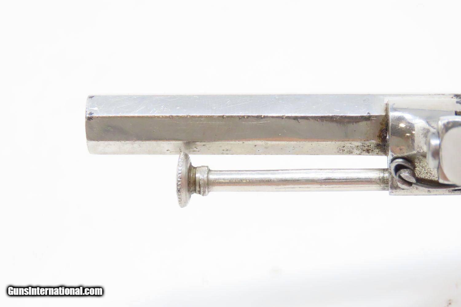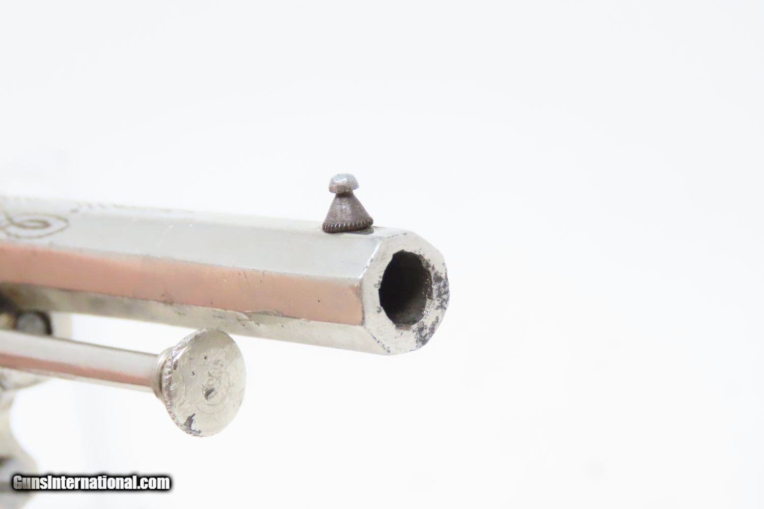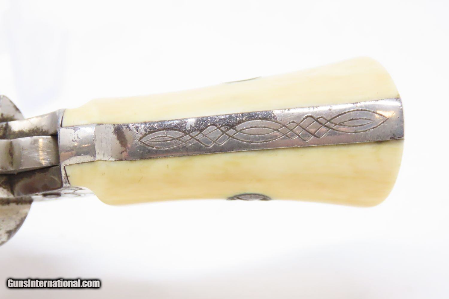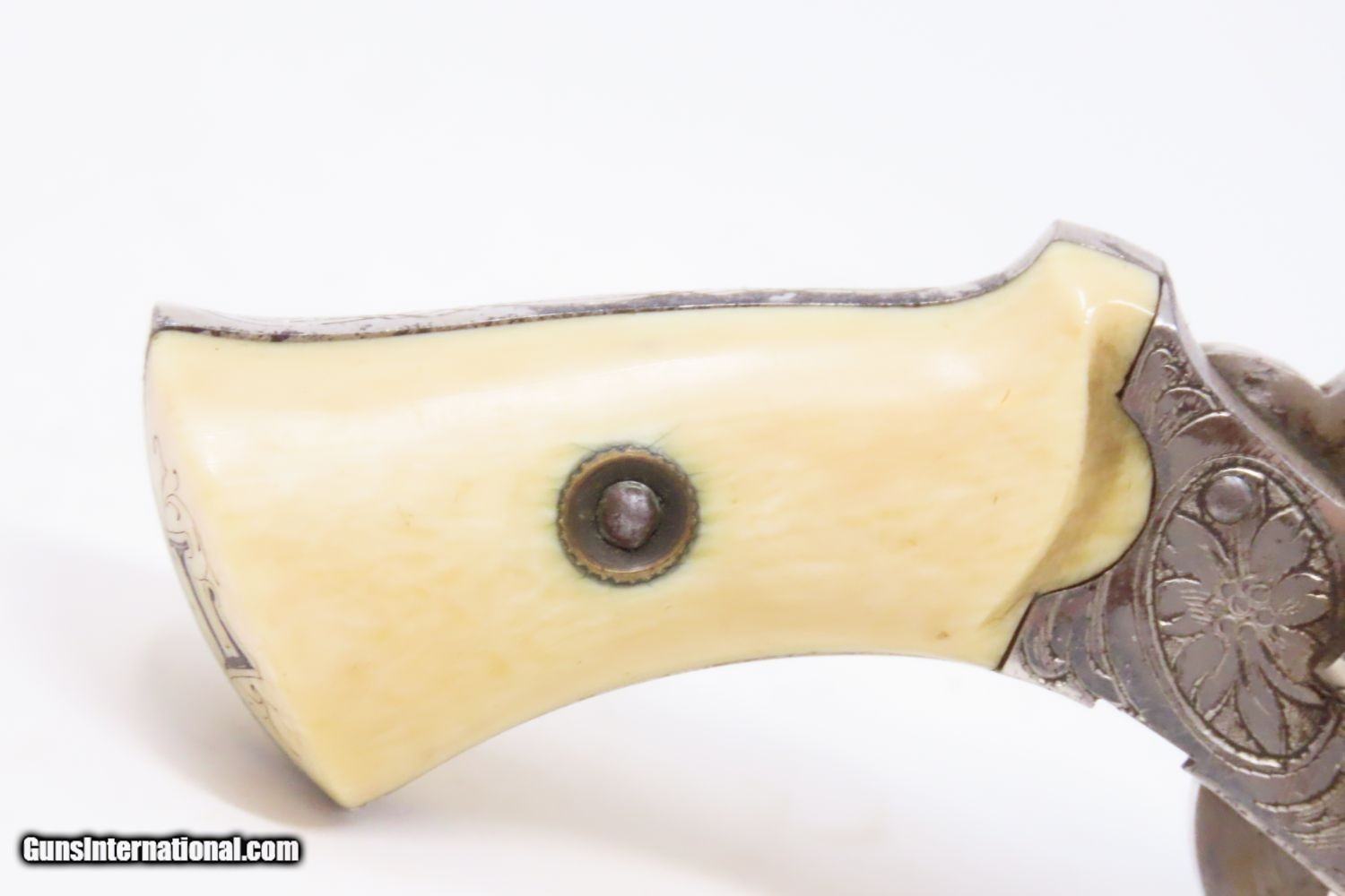 Description: Antique ENGRAVED, NICKEL, IVORY European PINFIRE REVOLVER 5.5mm “EL” With Period Purse Holster & Folding Trigger! Here we present an antique Belgian Pinfire Revolver, made circa the 1850s. In 1830, notable gun maker and inventor Casimir Lefaucheux invented the pinfire cartridge and patented it in 1835 to become one of the first self-contained firearms cartridges. This very early design included a case with ball, powder and primer, but what made it different from what was to come later in cartridge development was the “firing pin” that projected out of the side of the case. It was this pin that was struck and detonated the primer inside. His son, Eugene, would build on Casimir’s invention, designing a pistol to take advantage of it. The hammer would be flat and smash down on the side of the cylinder, from which the pin of the cartridge would project. This revolver and pistol design would become prolific, especially in Europe throughout the 19th Century, being adopted by militaries, used by civilians and police, and even being sold for use during the American Civil War. Many makers made both licensed and unlicensed copies. The overall condition is near fine. The action is strong, although the trigger return spring is a little weak. The bore is semi-bright in good shape. Both grips are firm and the initials “EL” are attractively carved on the bottom. “The leather purse is in good shape. A very attractive little revolver from the mid-19th Century! Own the original! This is a legitimate antique and not a reproduction. Barrel is 2-3/8 inches. Caliber: 5.5mm Pinfire Overall condition as seen in photos. Very Fast. Very Safe. FREE SHIPPING WORLDWIDE. Delivered directly to your door by express mail! Guaranteed AUTHENTIC & Includes CERTIFICATE OF AUTHENTICITY. ancestryguns $1085 #201047 SOLD Antique: Yes |