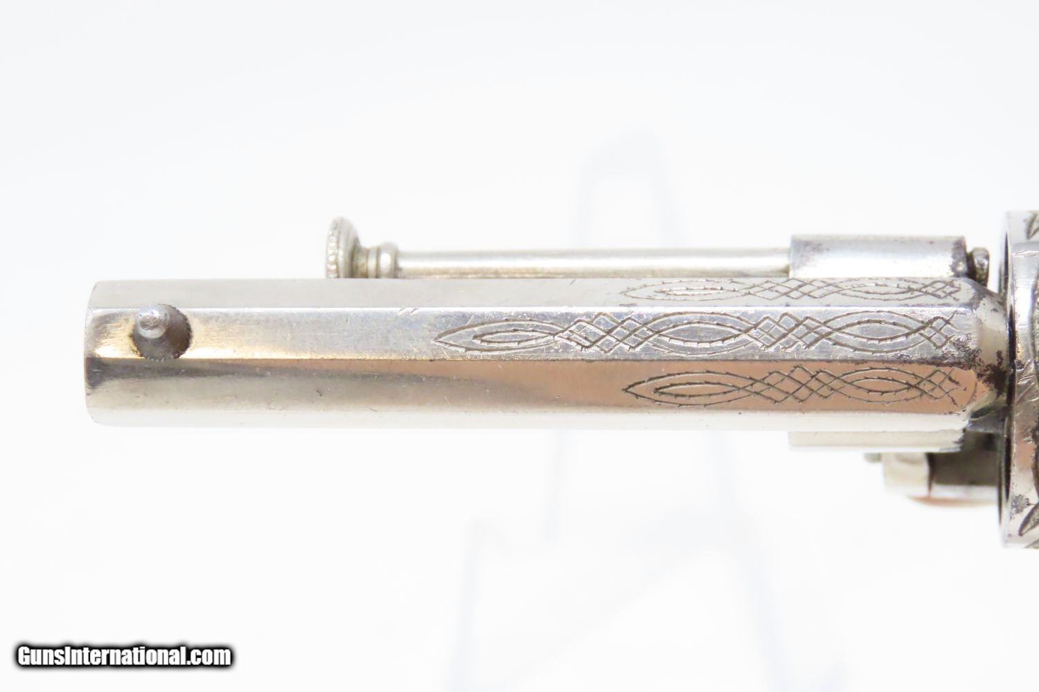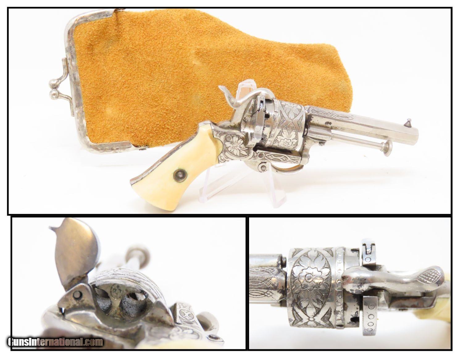 Antique ENGRAVED, NICKEL, IVORY European PINFIRE REVOLVER 5.5mm “EL” With Period Purse Holster & Folding Trigger!
