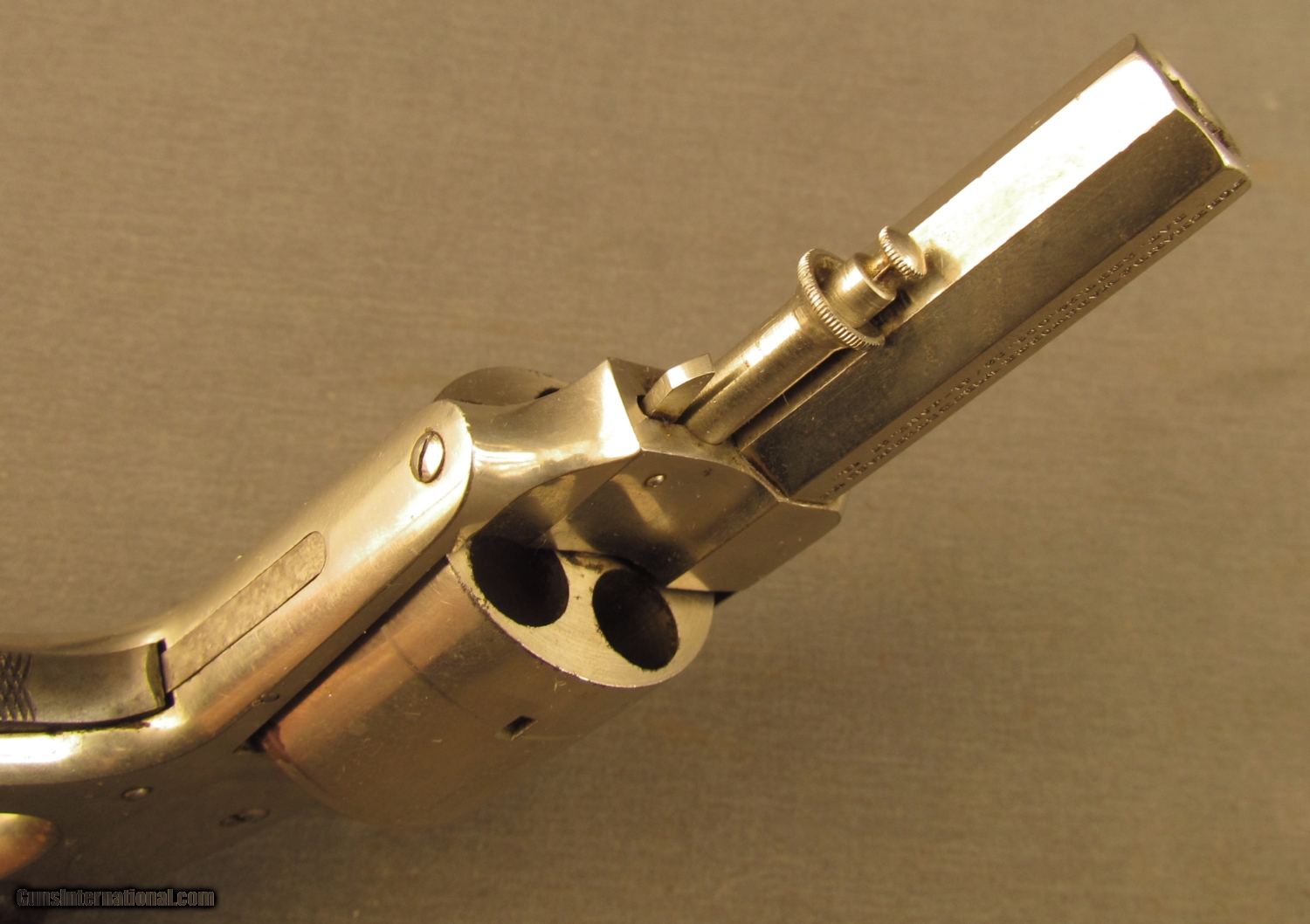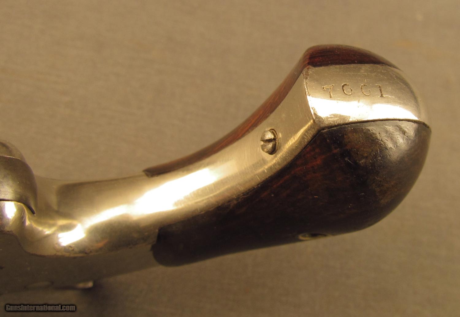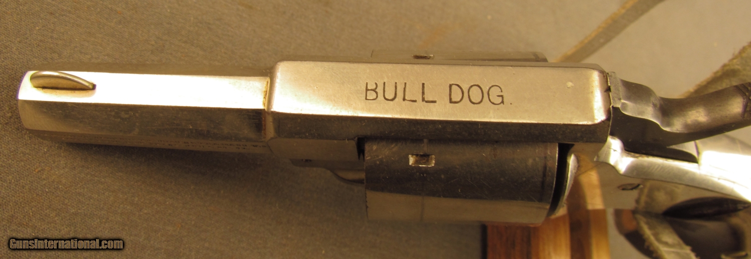 Description: Serial #7001, .38 RF, 2 3/8” octagon barrel with a very good, bright bore that has some mild pitting and freckling in spots along its length. This is a handsome little gun that has all matching numbers (including the small ejector pin) and retains 95-97% of the original nickel finish that has a slightly frosted appearance and some very mild flaking along few of the edges and projections. The cylinder shows drag lines and some finish lose on the edge and 3 small lines that stretch across from front to back. The hammer has some bright original color case-hardening remaining and the rosewood grips (numbered to the gun on the interior) are likewise in fine shape with some flaking of the original varnish and some scattered handling marks and blemishes. This is a great looking little F&W “Bull Dog” that has lots of original finish left and is in excellent condition overall. The action works quite well. Antique SOLD Antique: Yes Manufacturer: F&W Model: Bulldog Serial Number: 7001 Caliber Info: .38RF Gauge Info: .38RF |