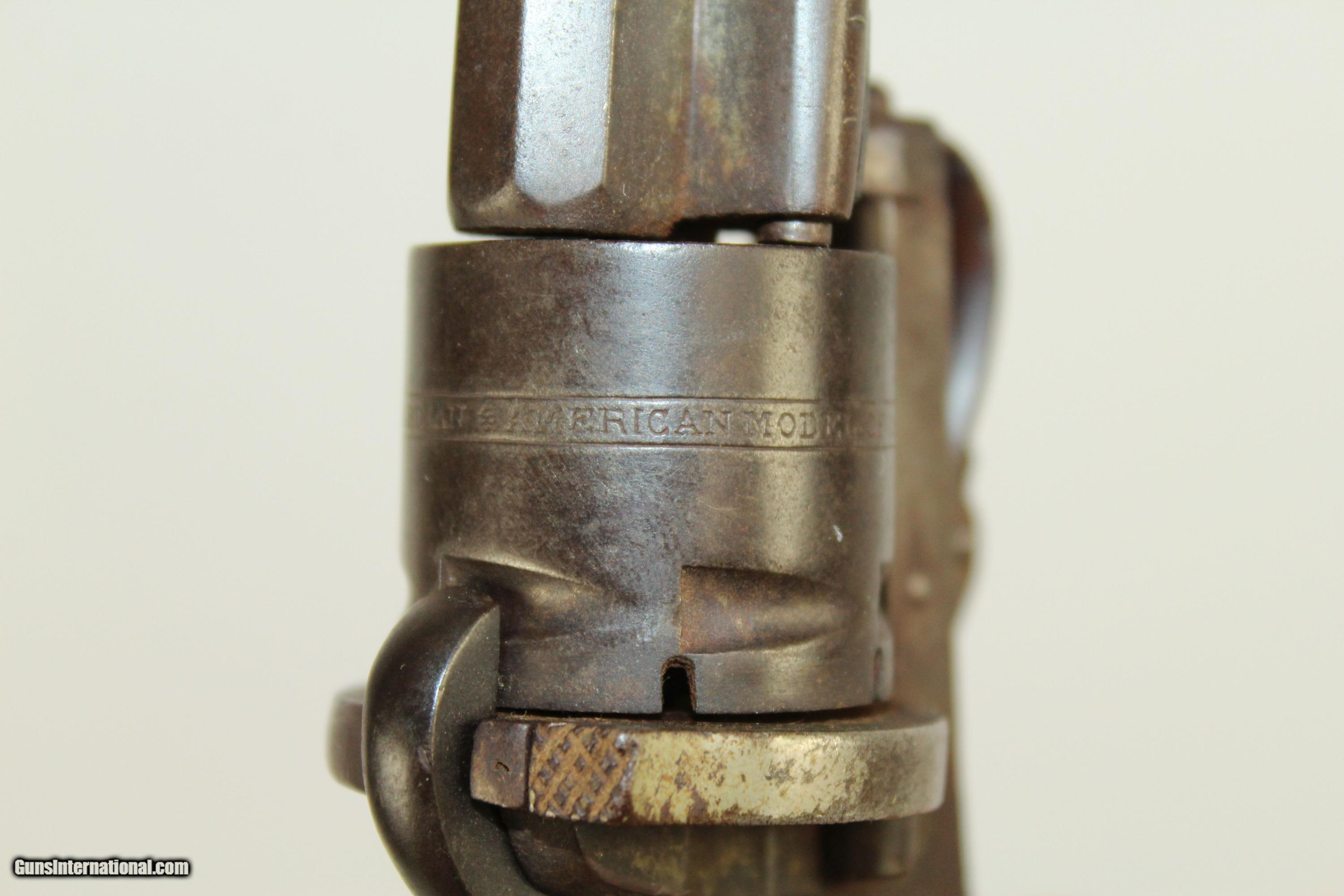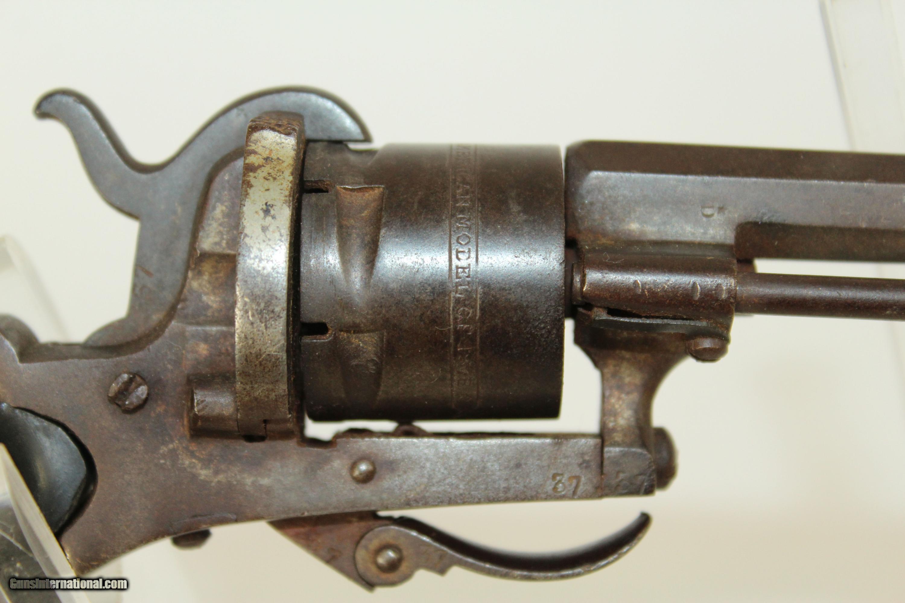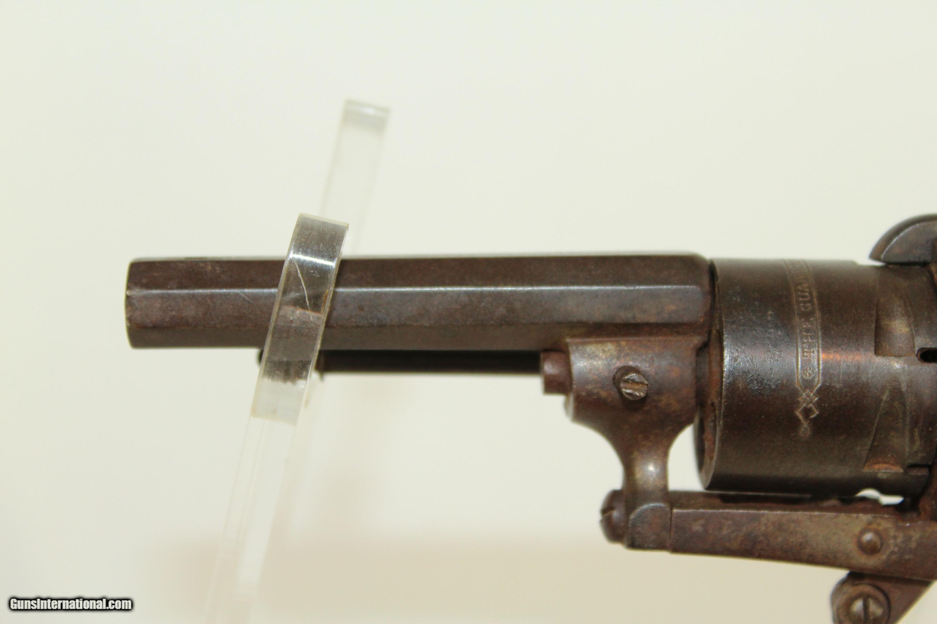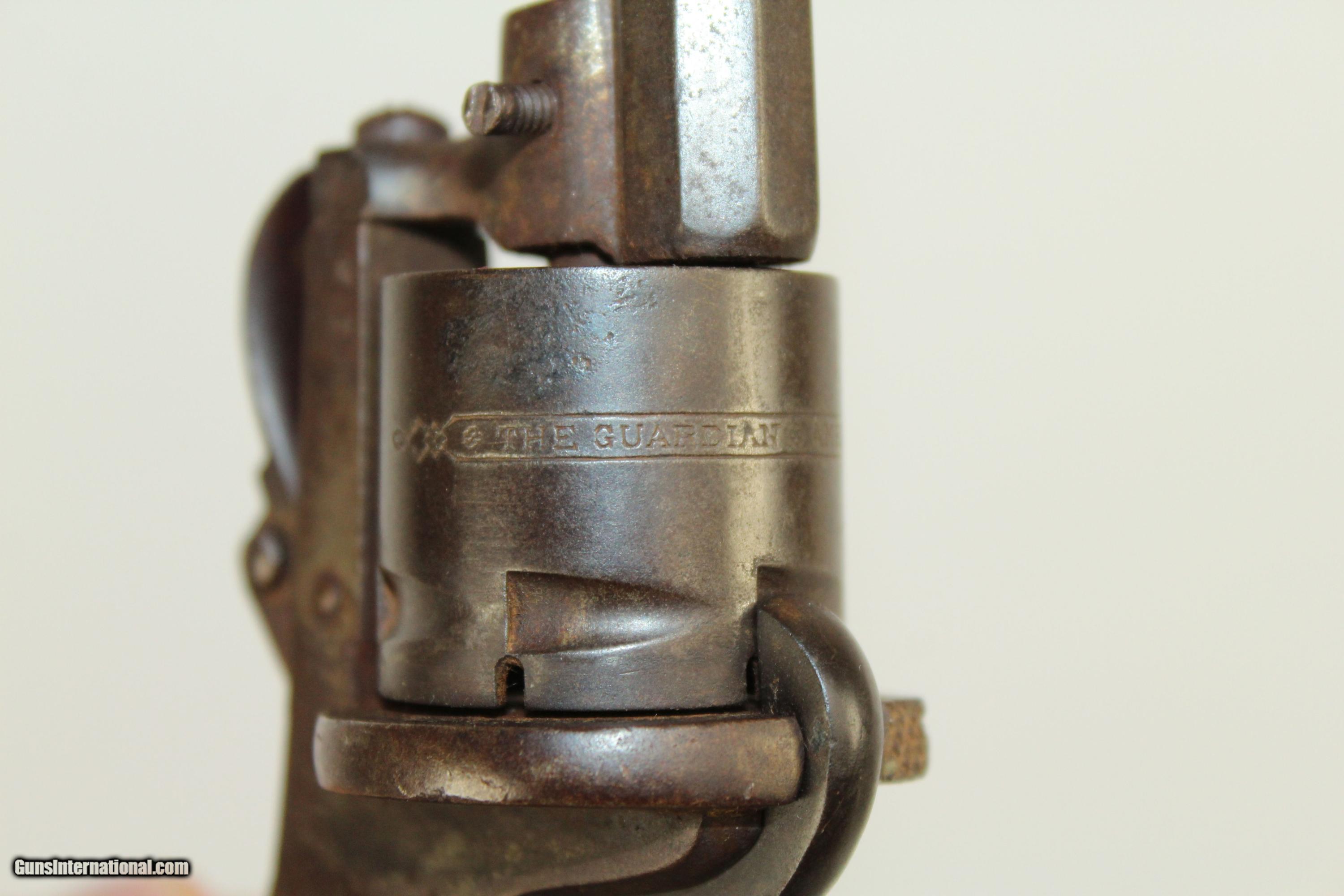 Description: Antique “Guardian American Model of 1878” Revolver Belgian Lefaucheux Pinfire Revolver Here we present an antique “The Guardian American Model of 1878” Pinfire Revolver, made in Belgium circa 1880 by Fagnus & Clément. Casimir Lefaucheux patented the pinfire cartridge in 1835 and son Eugene designed the pistol. The pinfire cartridge was one of the first successful self-contained cartridges in history, and the pistol saw prolific use in Europe during the 19th century, even being adopted by some militaries. This example is a concealed carry version with a small stature and a foldable trigger. The cylinder is marked “The Guardian American Model of 1878”. The overall condition is that of a relic. The hammer/trigger is functional in single action, but not double action. The cylinder does not revolve. Own the original! This is a legitimate antique and not a reproduction. Barrel is 2-7/8 inches in length. Caliber: 8mm pinfire Overall condition as seen in photos. Very Fast. Very Safe. FREE SHIPPING WORLDWIDE. Delivered directly to your door by express mail! Guaranteed AUTHENTIC & Includes CERTIFICATE OF AUTHENTICITY. ancestryguns $350 #22055 SOLD Antique: Yes |