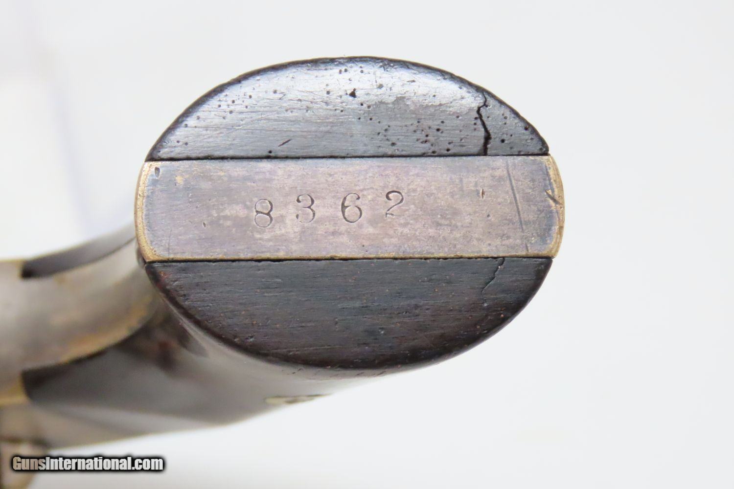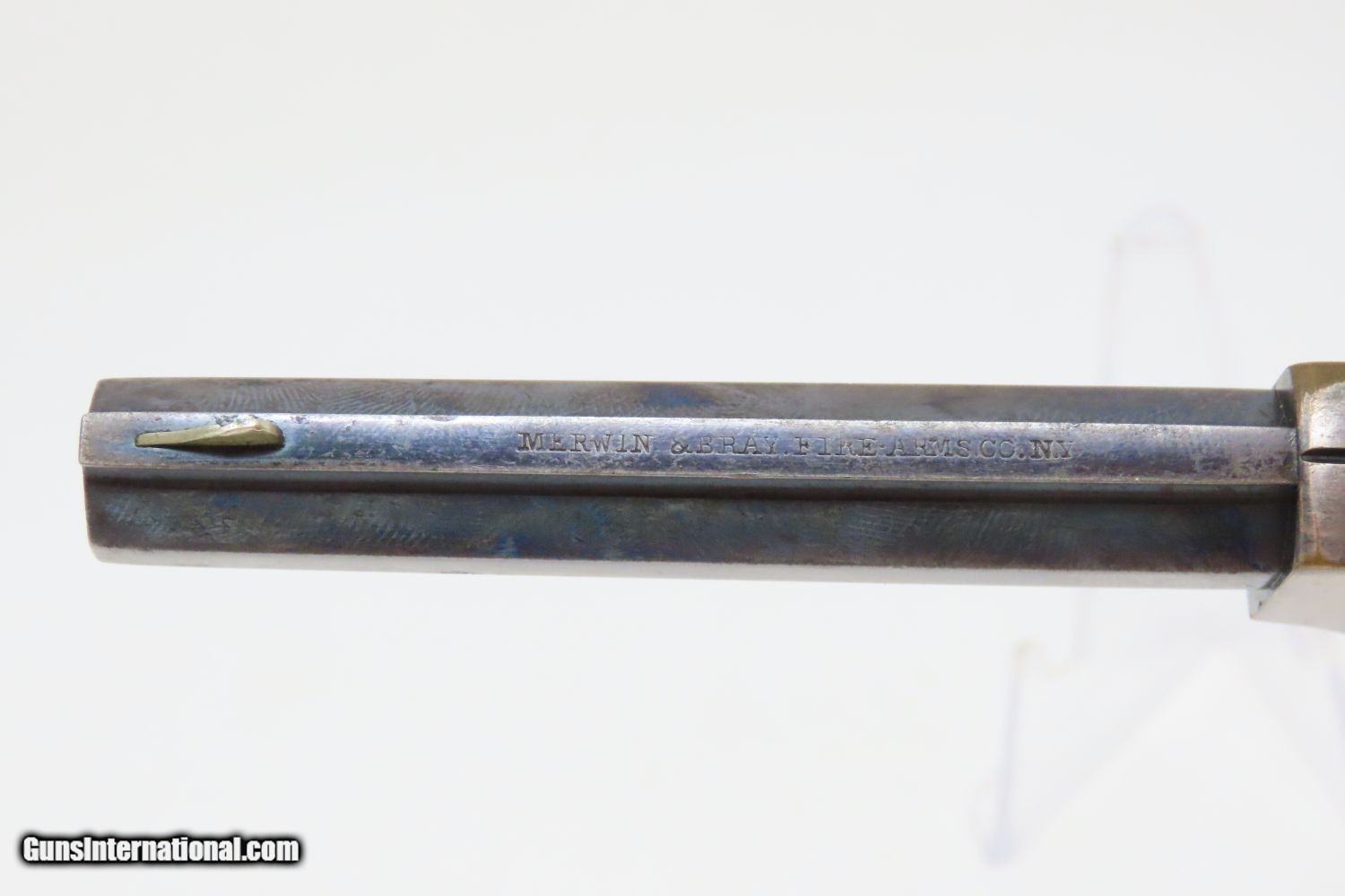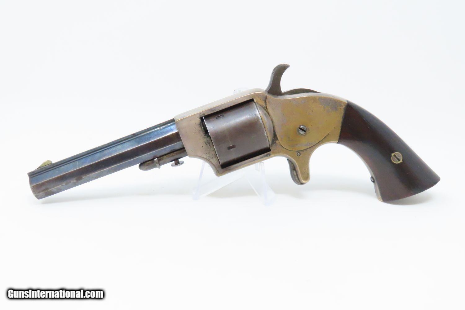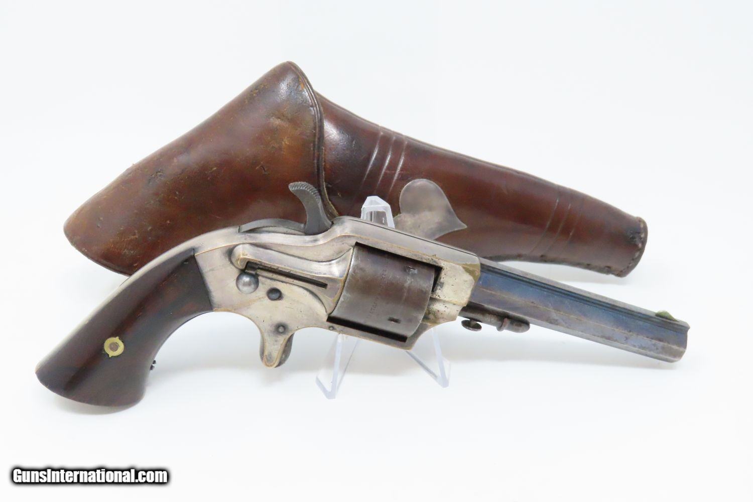 Description: Antique MERWIN & BRAY Front Loading CUP PRIMED Single Action POCKET Revolver Small Scale Version of Plant’s Army Model with HOLSTER! Here we present an antique Merwin & Bray Front Loading Plant Manufacturing Company Pocket Model Revolver, made circa 1865 in New York. Makers of revolvers during the American Civil War had three choices: 1) they could take their chances violating the Smith & Wesson owned Rollin White Patent for the concept of a “bored through cylinder” to accept metallic cartridges, 2) they could continue to make percussion guns with all of their disadvantages, or 3) they could invent their own concept that was both an improvement over percussion guns and circumvented the Rollin White Patent. The latter option is what Plant’s chose. Around 20,000 of these were manufactured in mid-1860s. Atop the barrel rib "MERWIN & BRAY FIRE-ARMS CO" can be read. "PATENTED. JULY 12. 1859. & JULY 21. 1863" can be seen on the cylinder. The serial number is on the barrel, the butt, the left side of the grip, and the inside the right grip. This example also comes with a leather holster with silver heart ornament. Plant’s Mfg. Co. was financed and represented by the famed firearms agents Merwin & Bray, hence their name on the top of the barrel. Their revolver featured a “cup-primed” and front-loading concept, which was among the best attempts to get around S&W’s 12-1/2 year stronghold on cartridge revolvers. They found relative success with the public rather than with the military. The overall condition is fine. Original blue finish and silver plate on the brass frame. The action is strong. Glossy rosewood grips. The bore is in good shape with nice rifling. The leather holster is near fine. A truly handsome little rig from the 1860s! Own the original! This is a legitimate antique and not a reproduction. Barrel is 3-1/2 inches. Caliber: .30 Cup-Fire Overall condition as seen in photos. Very Fast. Very Safe. FREE SHIPPING WORLDWIDE. Delivered directly to your door by express mail! Guaranteed AUTHENTIC & Includes CERTIFICATE OF AUTHENTICITY. ancestryguns $1625 #200883 SOLD Antique: Yes |