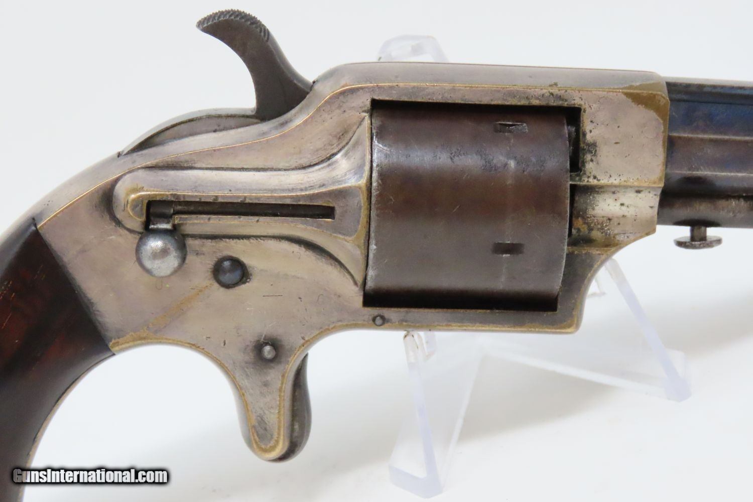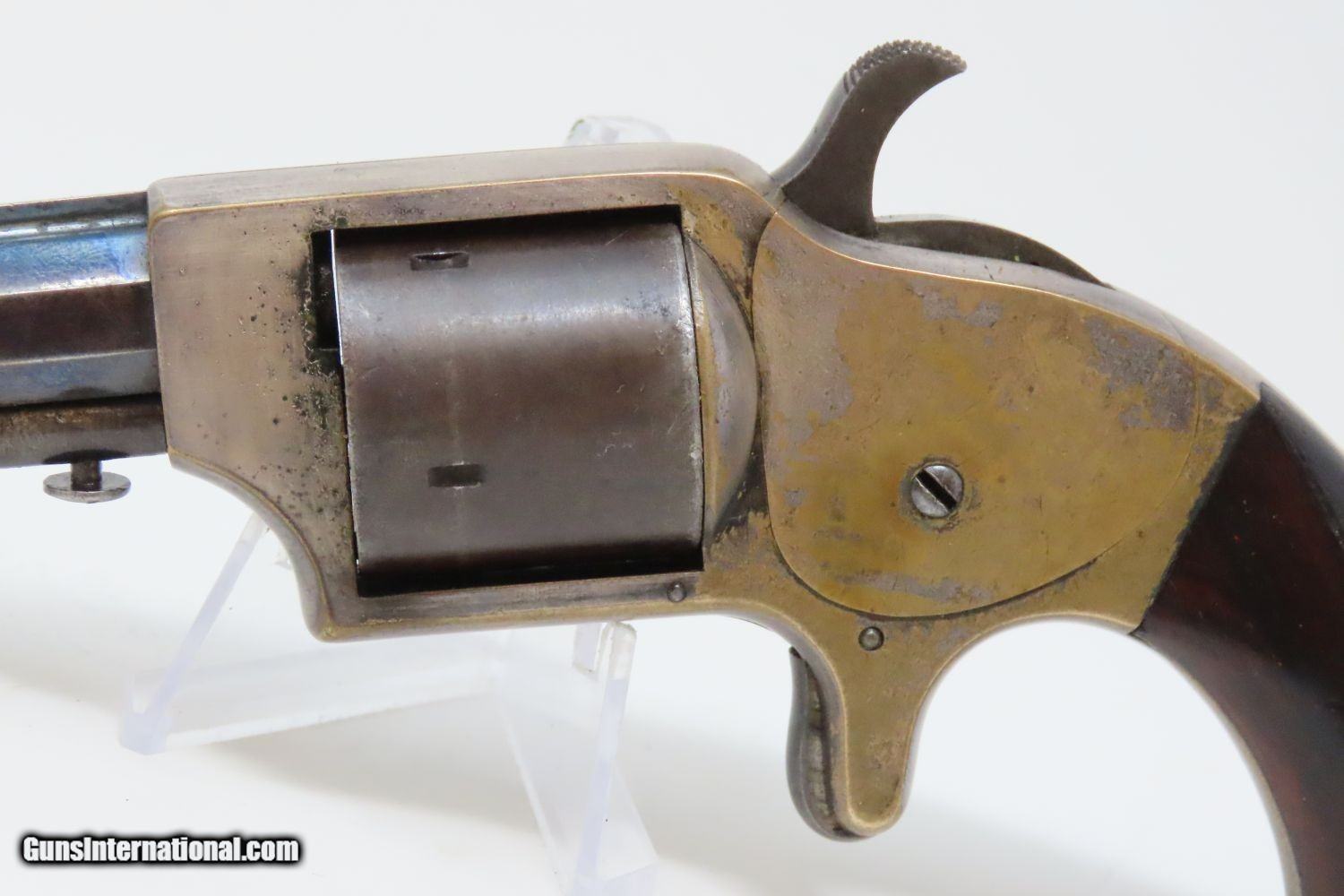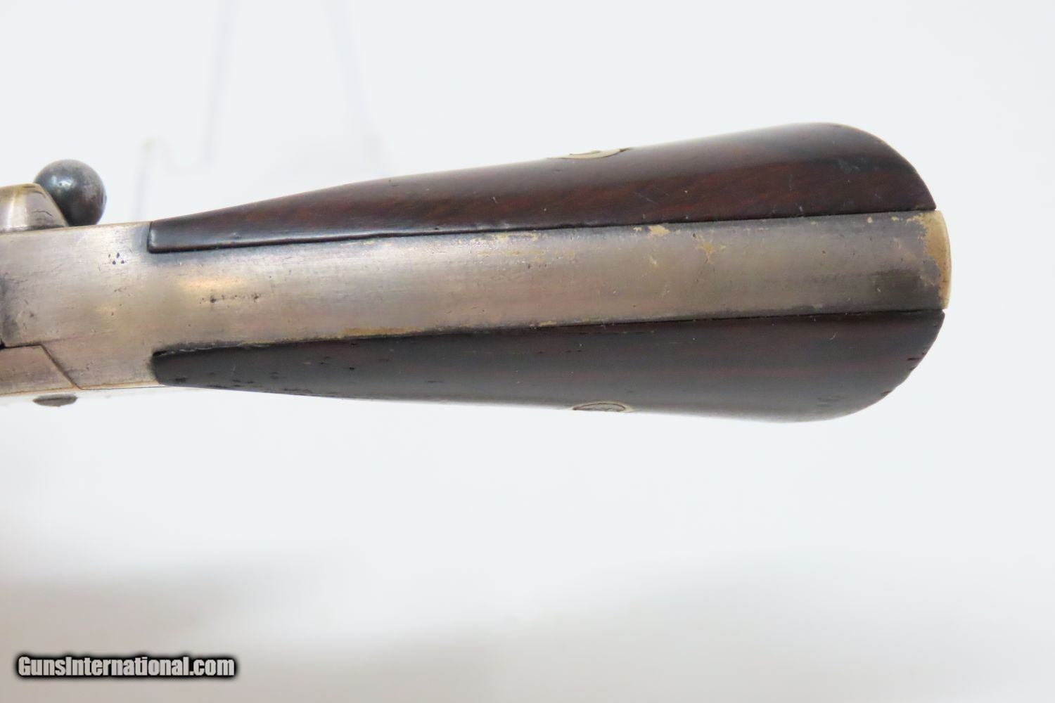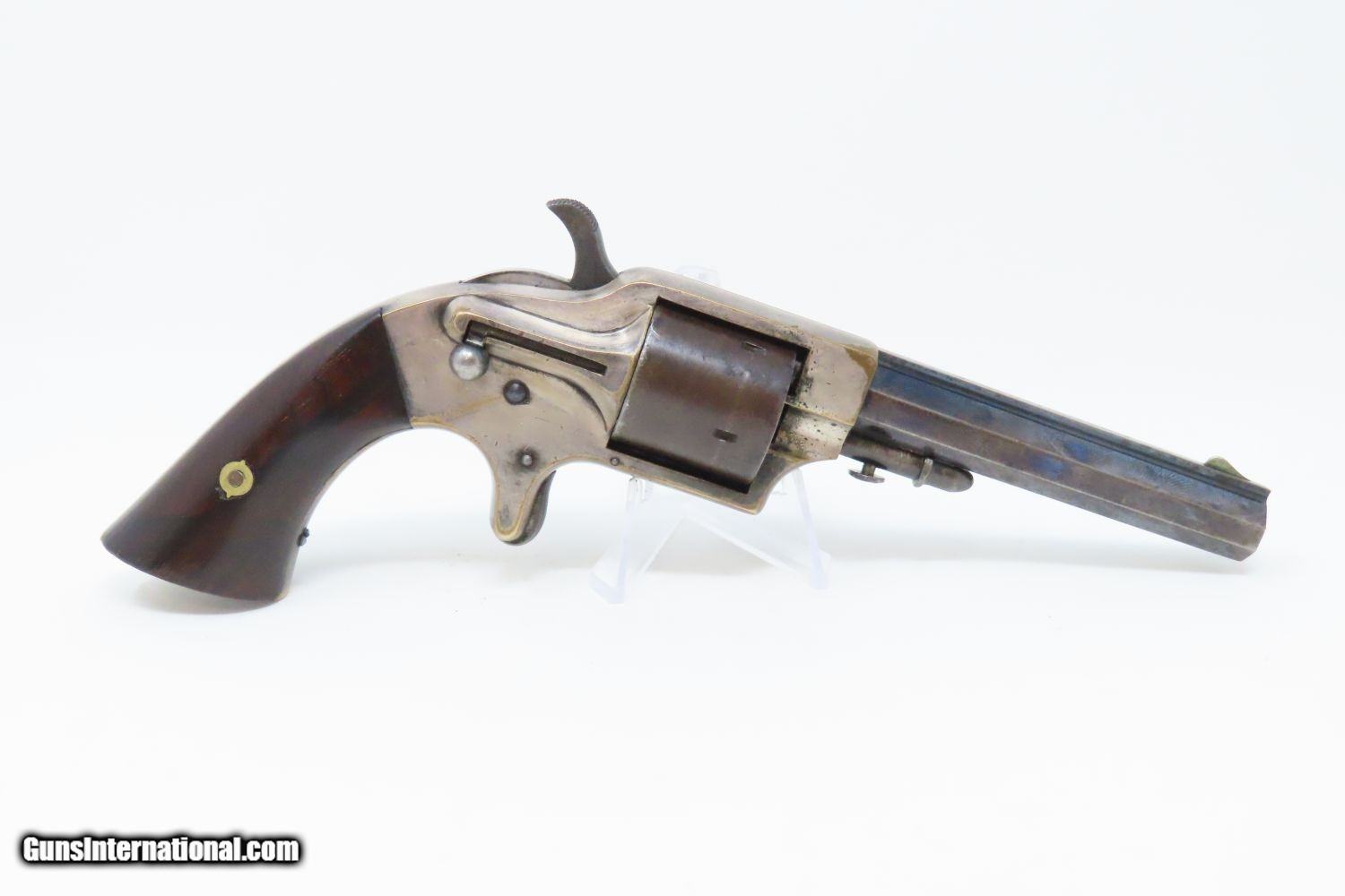 Description: Antique MERWIN & BRAY Front Loading CUP PRIMED Single Action POCKET Revolver Small Scale Version of Plant’s Army Model with HOLSTER! Here we present an antique Merwin & Bray Front Loading Plant Manufacturing Company Pocket Model Revolver, made circa 1865 in New York. Makers of revolvers during the American Civil War had three choices: 1) they could take their chances violating the Smith & Wesson owned Rollin White Patent for the concept of a “bored through cylinder” to accept metallic cartridges, 2) they could continue to make percussion guns with all of their disadvantages, or 3) they could invent their own concept that was both an improvement over percussion guns and circumvented the Rollin White Patent. The latter option is what Plant’s chose. Around 20,000 of these were manufactured in mid-1860s. Atop the barrel rib "MERWIN & BRAY FIRE-ARMS CO" can be read. "PATENTED. JULY 12. 1859. & JULY 21. 1863" can be seen on the cylinder. The serial number is on the barrel, the butt, the left side of the grip, and the inside the right grip. This example also comes with a leather holster with silver heart ornament. Plant’s Mfg. Co. was financed and represented by the famed firearms agents Merwin & Bray, hence their name on the top of the barrel. Their revolver featured a “cup-primed” and front-loading concept, which was among the best attempts to get around S&W’s 12-1/2 year stronghold on cartridge revolvers. They found relative success with the public rather than with the military. The overall condition is fine. Original blue finish and silver plate on the brass frame. The action is strong. Glossy rosewood grips. The bore is in good shape with nice rifling. The leather holster is near fine. A truly handsome little rig from the 1860s! Own the original! This is a legitimate antique and not a reproduction. Barrel is 3-1/2 inches. Caliber: .30 Cup-Fire Overall condition as seen in photos. Very Fast. Very Safe. FREE SHIPPING WORLDWIDE. Delivered directly to your door by express mail! Guaranteed AUTHENTIC & Includes CERTIFICATE OF AUTHENTICITY. ancestryguns $1625 #200883 SOLD Antique: Yes |