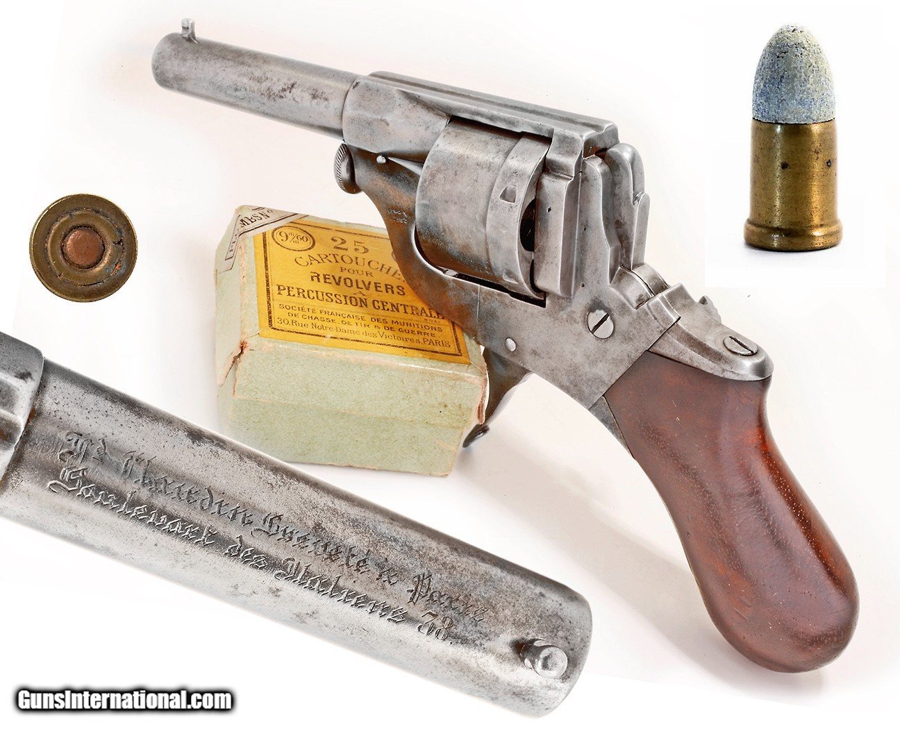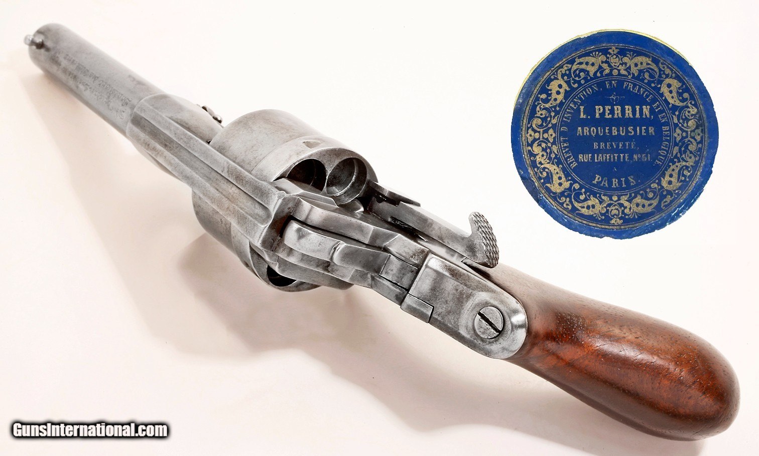 Description: I'm selling my collection. Here is an Exceedingly Scarce Antique Baby Perrin Double Action 6 round folding trigger Revolver with a 3.3/8" round barrel with an excellent bore and 6 clean chamber, chamber for the 9mm center fire Perrin cartridge (ammunitions showed on pictures are not for sale). FFL is not required. Small Production circa 1880. Marked on the top of barrel "J.Chaudin Brevèté (patented) à Paris Boulevard des Italiens". Action & timing function very well. The finish was and is in the white rates 85-90% with very light tiny traces of erosion here and there. The original precious walnut polished smooth grips look great, an attempt to add a lanyard ring left a small hole on the butt. Well built, very small production & an excellent condition make this Petit Perrin very collectible. I described it to the best of my knowledge. Please don't ask for extra pictures. Buyer is responsible for knowing all laws pertaining to this transaction. All what I didn't described is visible on the pictures. Please don't ask for extra pictures. $735 + $45 insured shipping to your door, payable by cashier check, P.M.O or credit card with the usual charging fee. Please check out my other antique guns which are already set at a low price. Thank you. SOLD Antique: Yes Handgun Caliber: 9mm Mars |