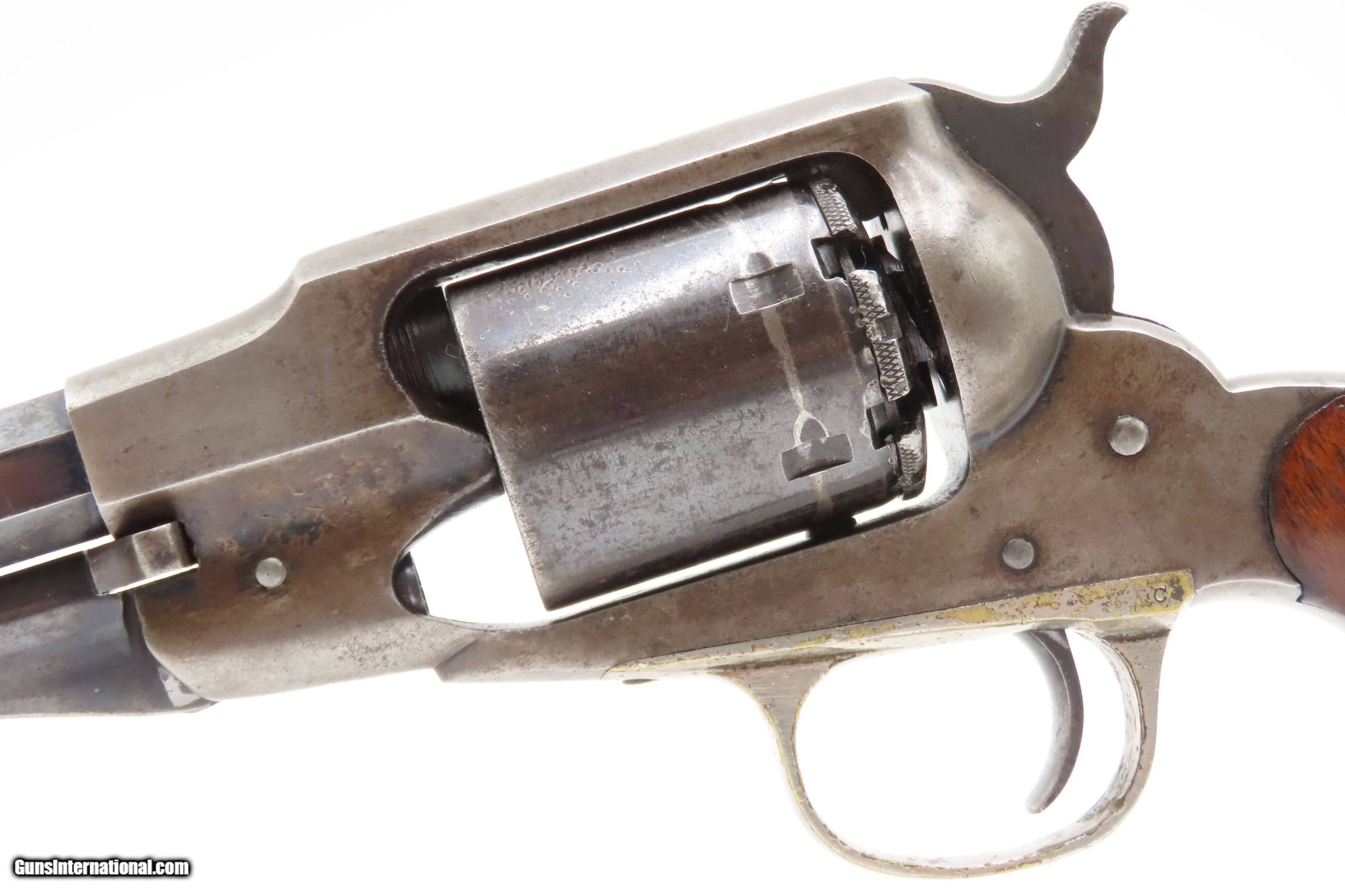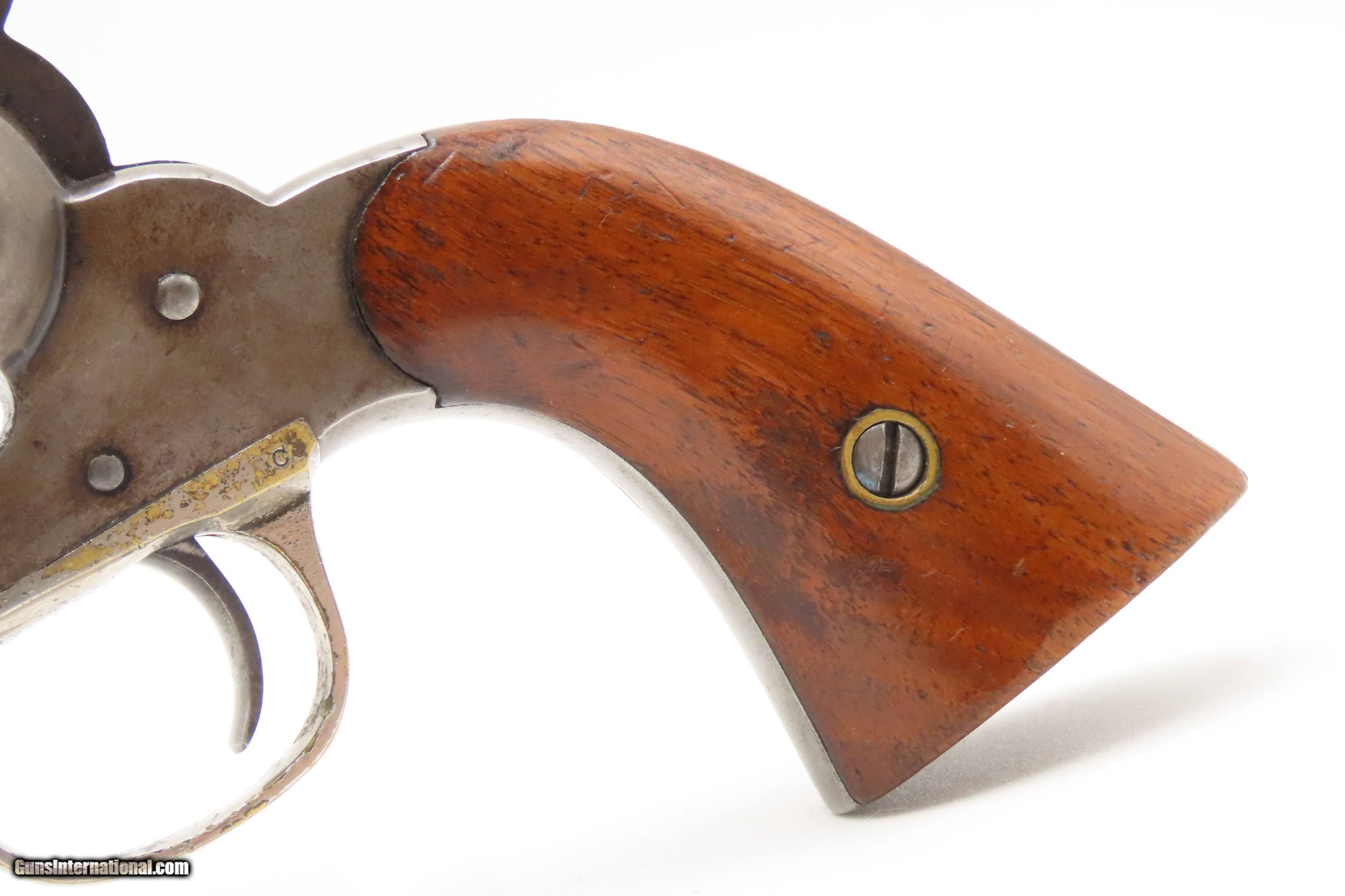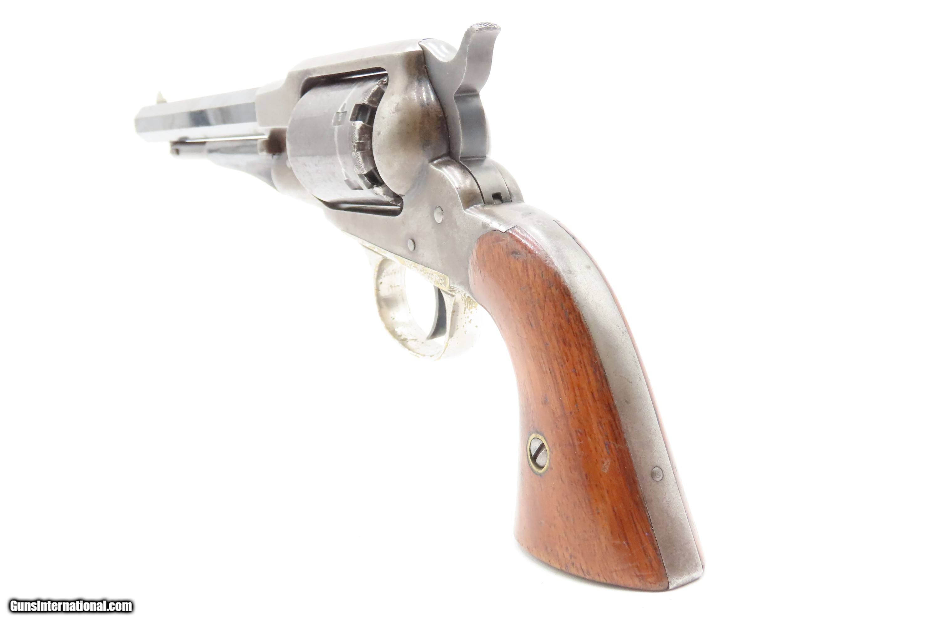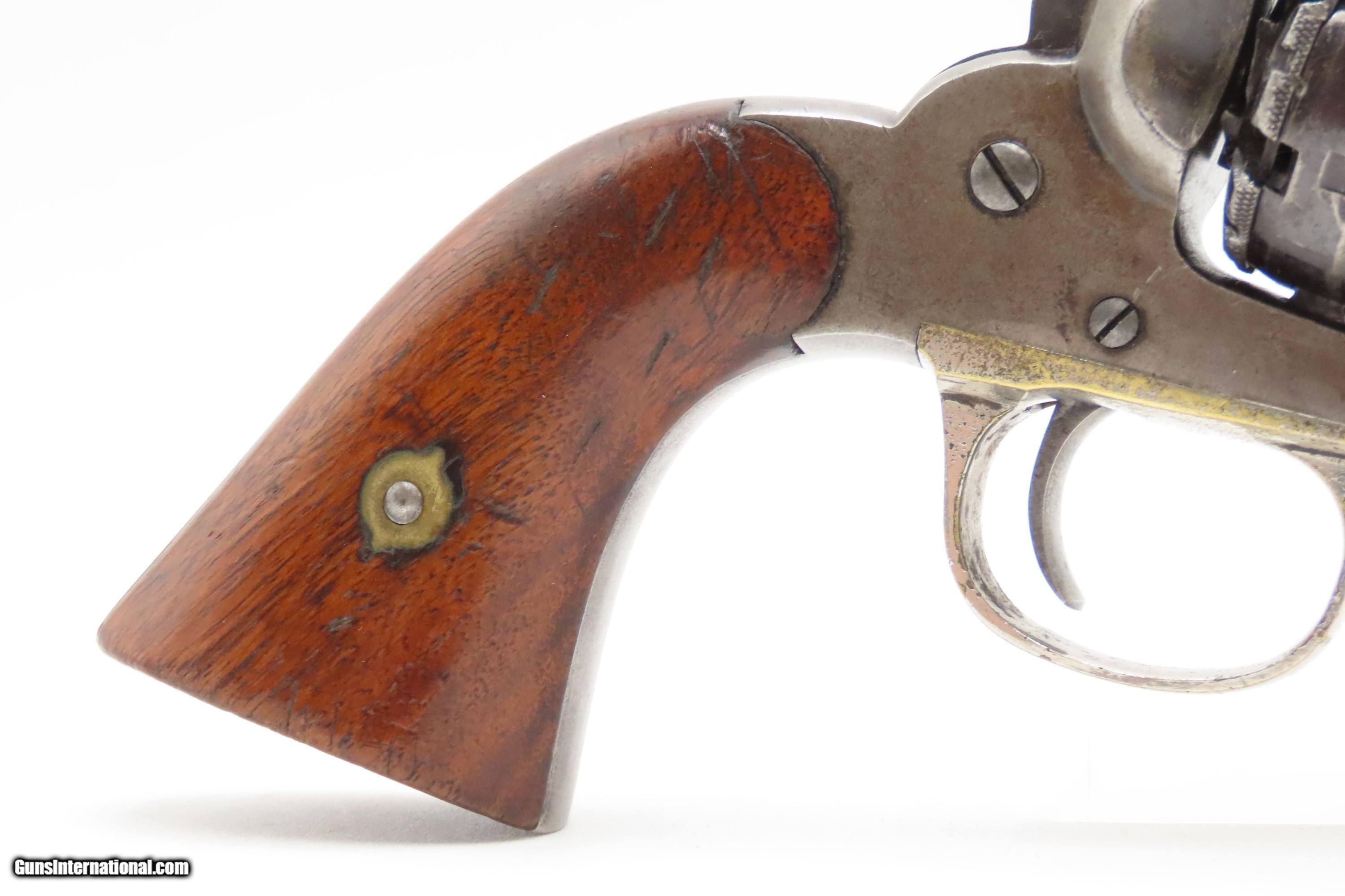 Description: Antique REMINGTON-RIDER Percussion New Model BELT Single Action Revolver SCARCE .38 CF Caliber SELF DEFENSE Revolver Here Ancestry Guns presents an antique Remington-Rider New Model Belt Percussion Revolver, made circa 1865 to 1873 in Ilion, New York. Production of this revolver started out as a single-action, percussion revolver that was produced from 1863 to 1873. These revolvers were made during a period when Smith & Wesson owned the Rollin White Patent. Companies like Remington and Colt were relegated to continue production of revolvers with the percussion firing system until the patent expired in 1869. Once this happened, companies lost no time fitting their percussion models with various cartridge conversions or incorporating this new technology at the factory. The later manufactured revolvers in this series had the ability to fire either cartridge or percussion cylinders from the same gun. It was a smaller version of the New Model Army and Navy revolver, but larger than the New Police. The revolver was a result of a collaboration between Remington Arms and Joseph Rider of Newark, Ohio. The new gun was introduced in 1863 and would remain in production for a decade, with total production between 2,500 and 3,000 revolvers per “Flayderman's Guide”. As the guns were serial numbered in the same range as the Remington New Model Single Action Revolvers, it is difficult to know for sure how many were produced, and a lack of surviving factory records make investigation into the matter difficult. The New Model Belt series of revolvers appear to be a concerted effort by Remington to produce a handy, personal, self-defense type revolver that would be at home in a belt holster or even a large overcoat pocket. This revolver features a six-shot cylinder chambered in .38 centerfire caliber and was designed for defensive carry. The overall condition is fine. Original blue barrel and cylinder finish is preserved. Original silver on the trigger guard. The bore is mostly bright with strong rifling. The action is strong, although when the muzzle is pointed up the cylinder does not index. Very good grips contain average wear. Markings are legible. Matching serial numbers on the barrel, trigger guard tang, grip frame, and both grips. Own the original! This is a legitimate antique and not a reproduction. Barrel is 6-1/2 inches. Caliber: .38 Centerfire Overall condition as seen in photos. Very Fast. Very Safe. FREE SHIPPING WORLDWIDE. Delivered directly to your door by express mail! Guaranteed AUTHENTIC & Includes CERTIFICATE OF AUTHENTICITY. $2995 #259336 Antique: Yes Price: $2,995.00 Buy Now Pay with