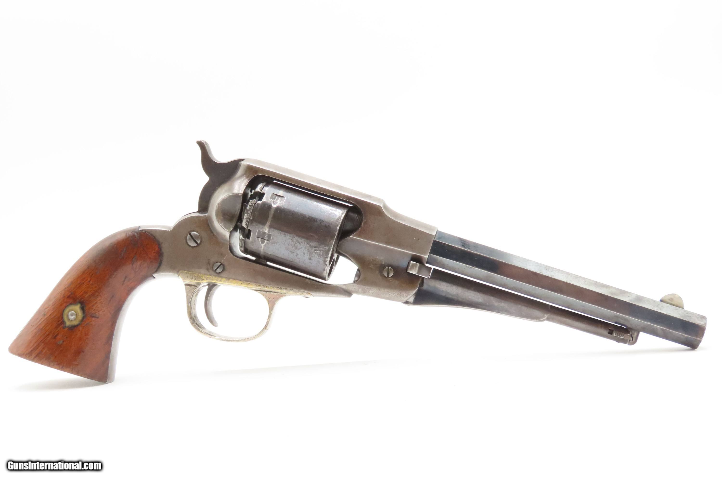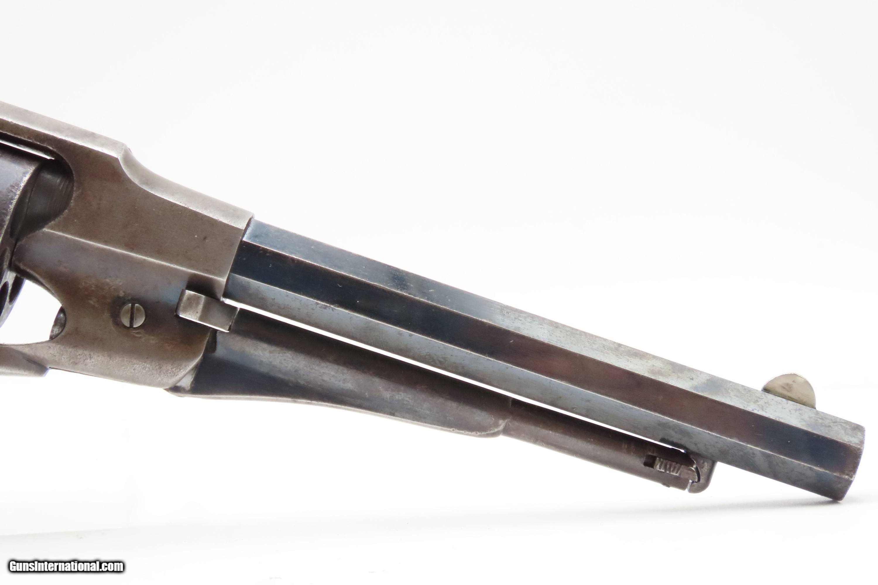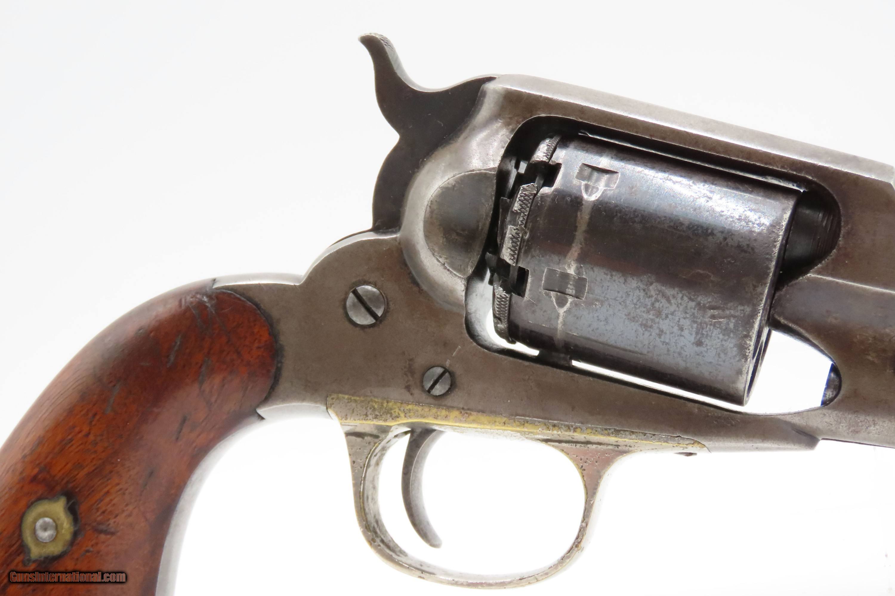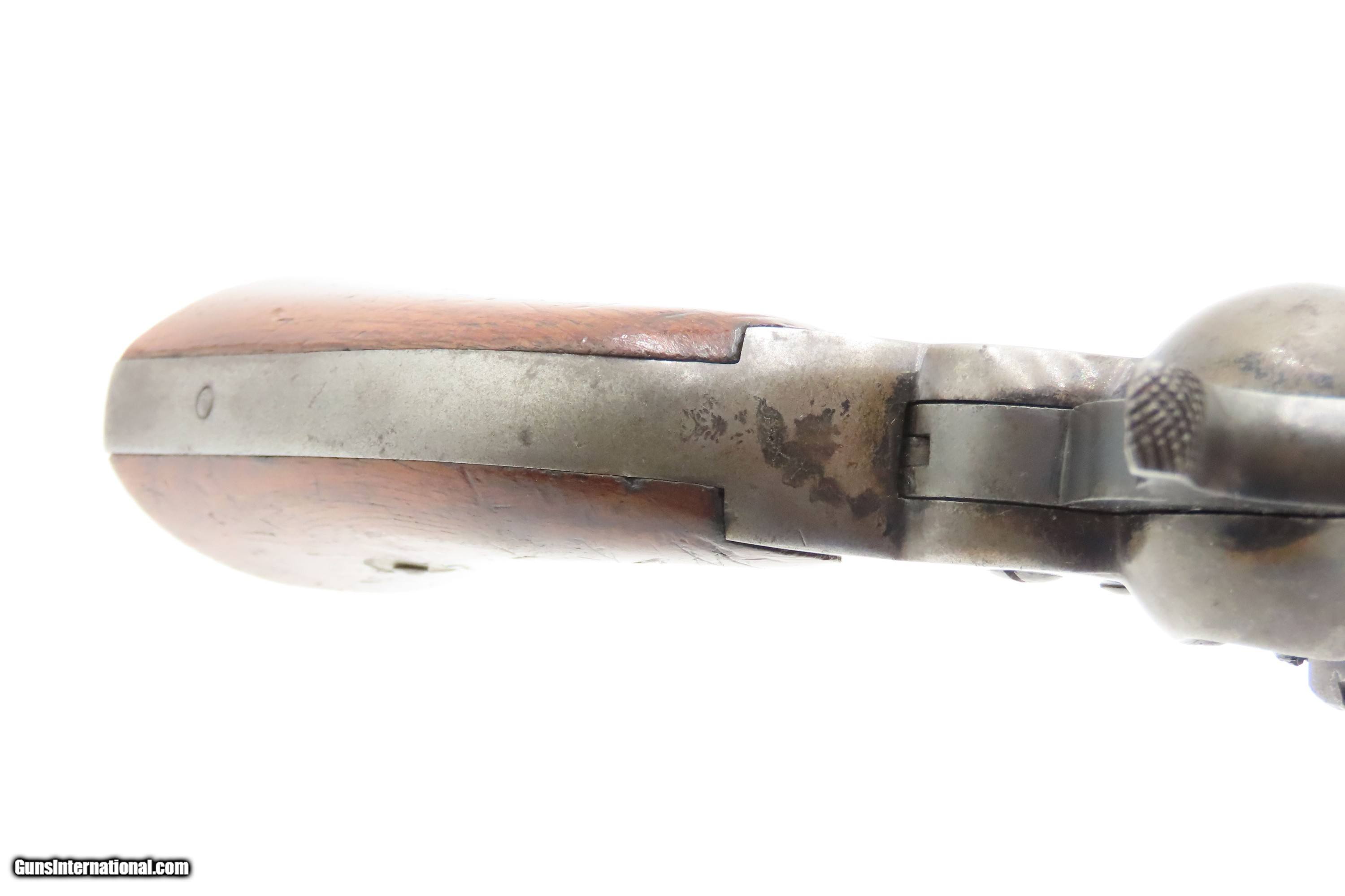 Description: Antique REMINGTON-RIDER Percussion New Model BELT Single Action Revolver SCARCE .38 CF Caliber SELF DEFENSE Revolver Here Ancestry Guns presents an antique Remington-Rider New Model Belt Percussion Revolver, made circa 1865 to 1873 in Ilion, New York. Production of this revolver started out as a single-action, percussion revolver that was produced from 1863 to 1873. These revolvers were made during a period when Smith & Wesson owned the Rollin White Patent. Companies like Remington and Colt were relegated to continue production of revolvers with the percussion firing system until the patent expired in 1869. Once this happened, companies lost no time fitting their percussion models with various cartridge conversions or incorporating this new technology at the factory. The later manufactured revolvers in this series had the ability to fire either cartridge or percussion cylinders from the same gun. It was a smaller version of the New Model Army and Navy revolver, but larger than the New Police. The revolver was a result of a collaboration between Remington Arms and Joseph Rider of Newark, Ohio. The new gun was introduced in 1863 and would remain in production for a decade, with total production between 2,500 and 3,000 revolvers per “Flayderman's Guide”. As the guns were serial numbered in the same range as the Remington New Model Single Action Revolvers, it is difficult to know for sure how many were produced, and a lack of surviving factory records make investigation into the matter difficult. The New Model Belt series of revolvers appear to be a concerted effort by Remington to produce a handy, personal, self-defense type revolver that would be at home in a belt holster or even a large overcoat pocket. This revolver features a six-shot cylinder chambered in .38 centerfire caliber and was designed for defensive carry. The overall condition is fine. Original blue barrel and cylinder finish is preserved. Original silver on the trigger guard. The bore is mostly bright with strong rifling. The action is strong, although when the muzzle is pointed up the cylinder does not index. Very good grips contain average wear. Markings are legible. Matching serial numbers on the barrel, trigger guard tang, grip frame, and both grips. Own the original! This is a legitimate antique and not a reproduction. Barrel is 6-1/2 inches. Caliber: .38 Centerfire Overall condition as seen in photos. Very Fast. Very Safe. FREE SHIPPING WORLDWIDE. Delivered directly to your door by express mail! Guaranteed AUTHENTIC & Includes CERTIFICATE OF AUTHENTICITY. $2995 #259336 Antique: Yes Price: $2,995.00 Buy Now Pay with