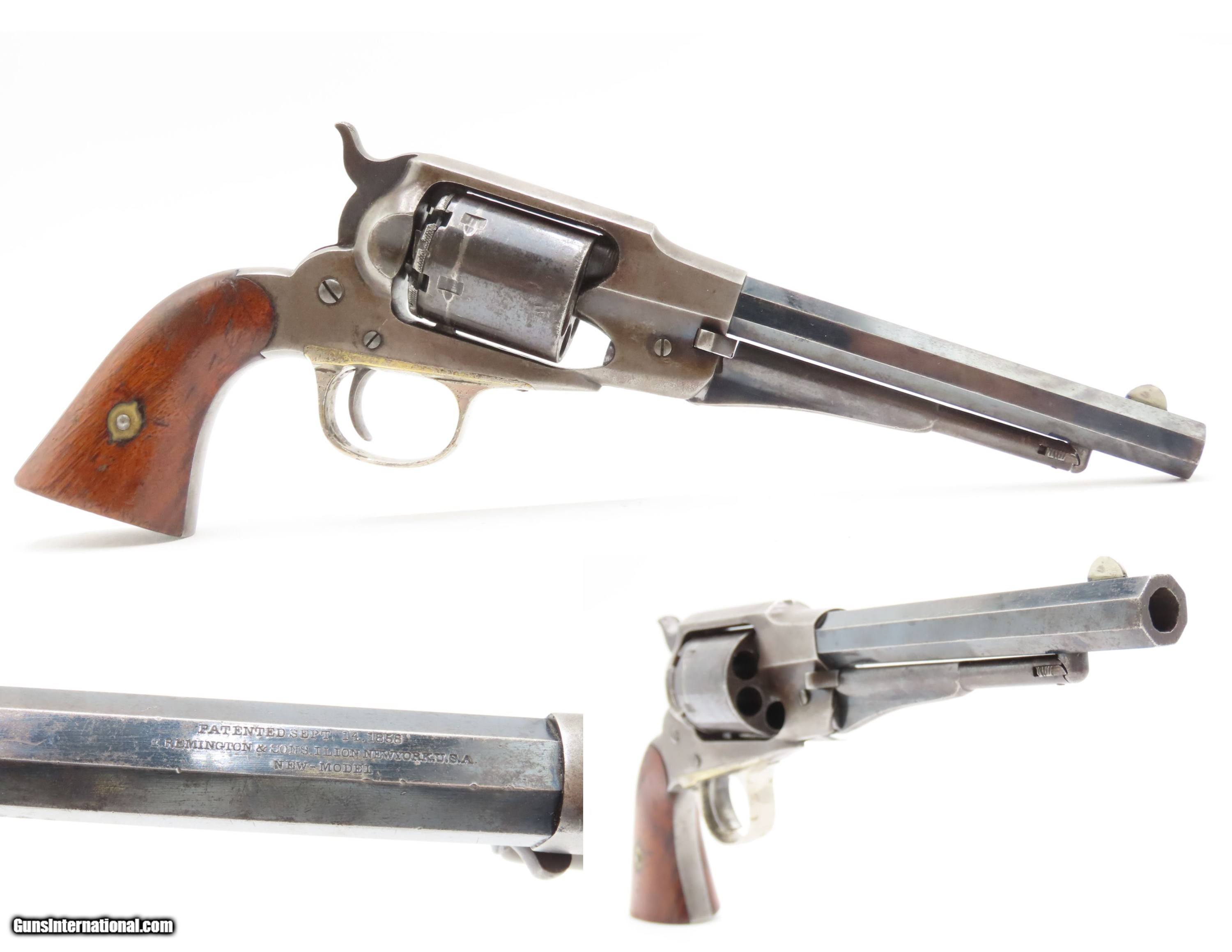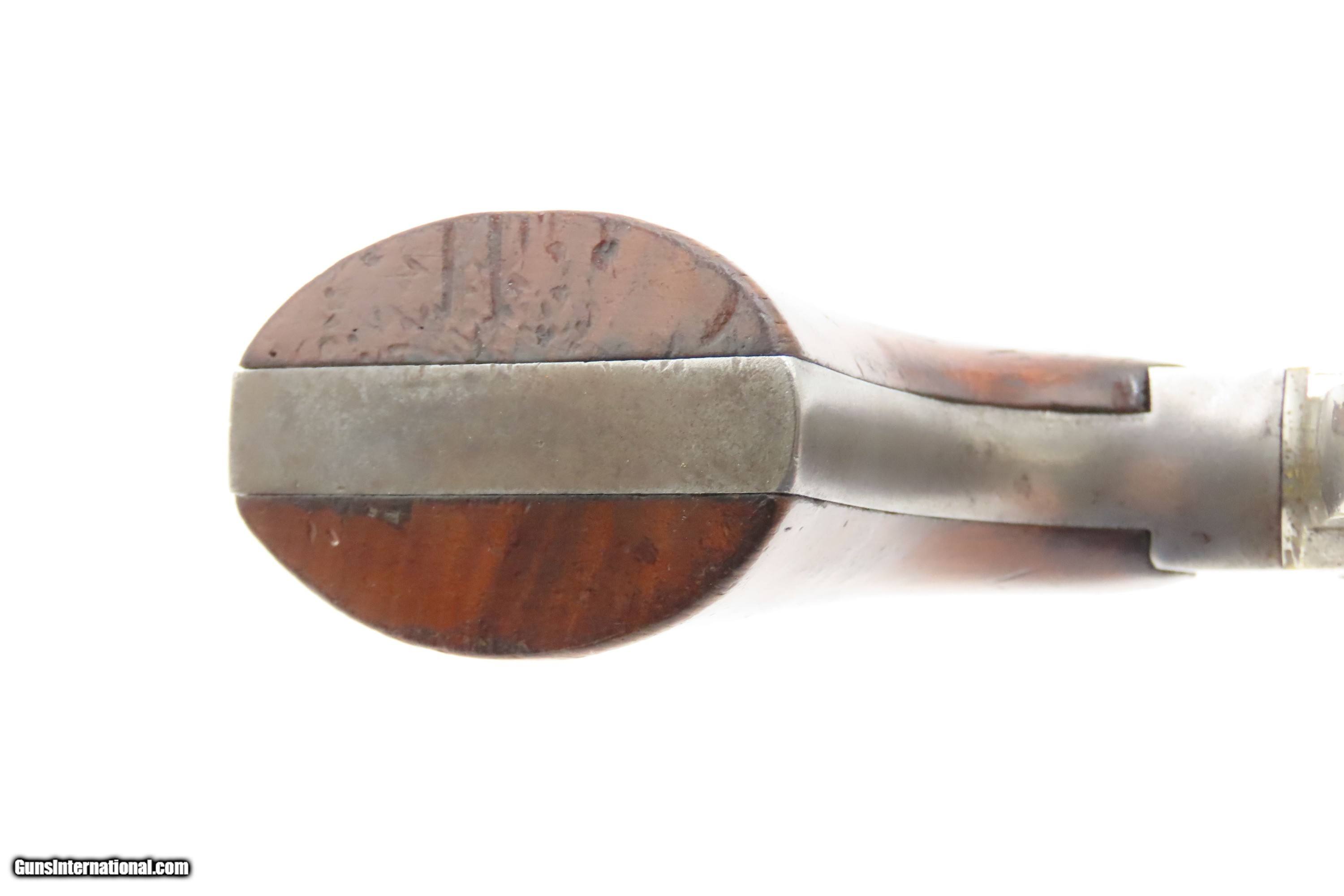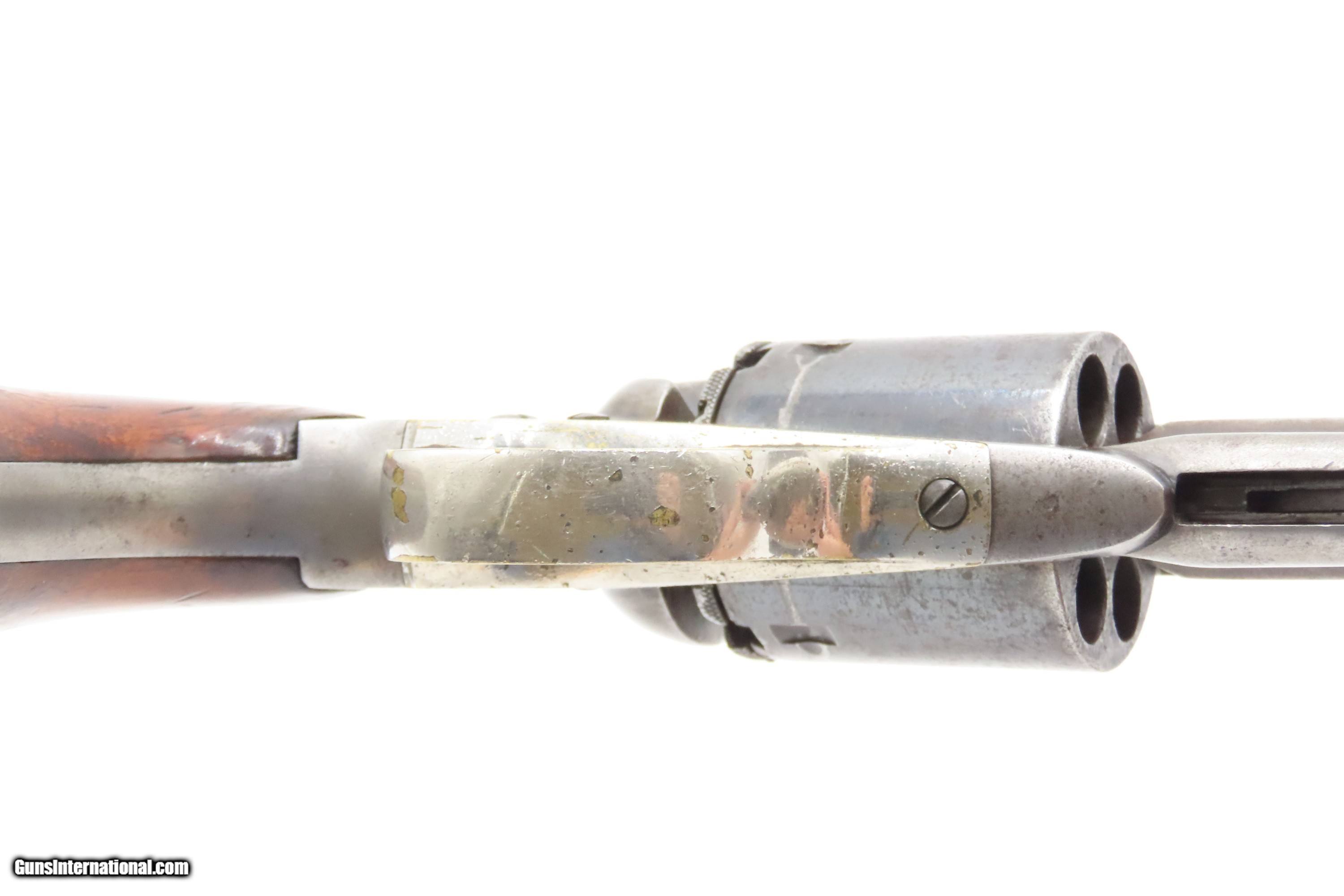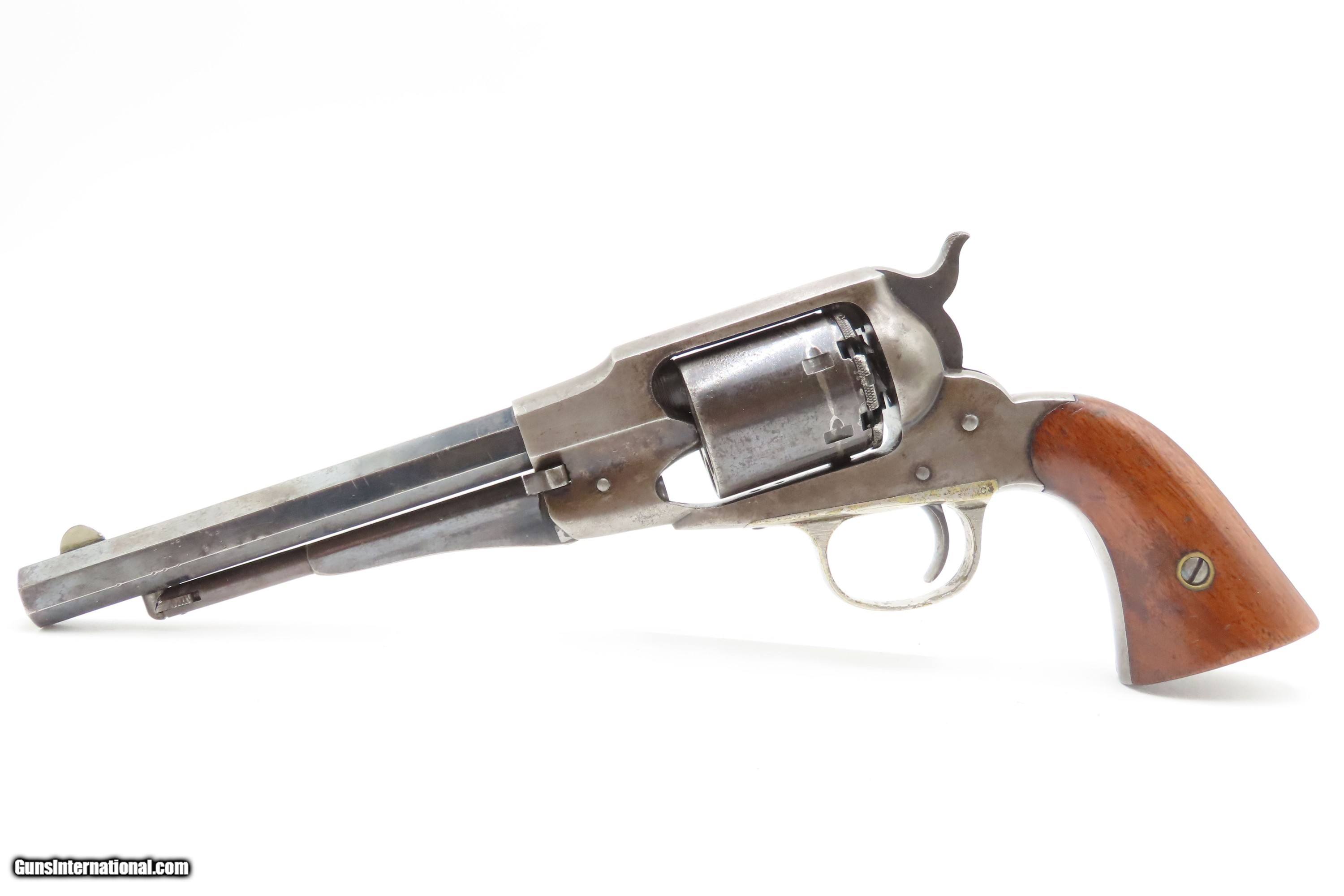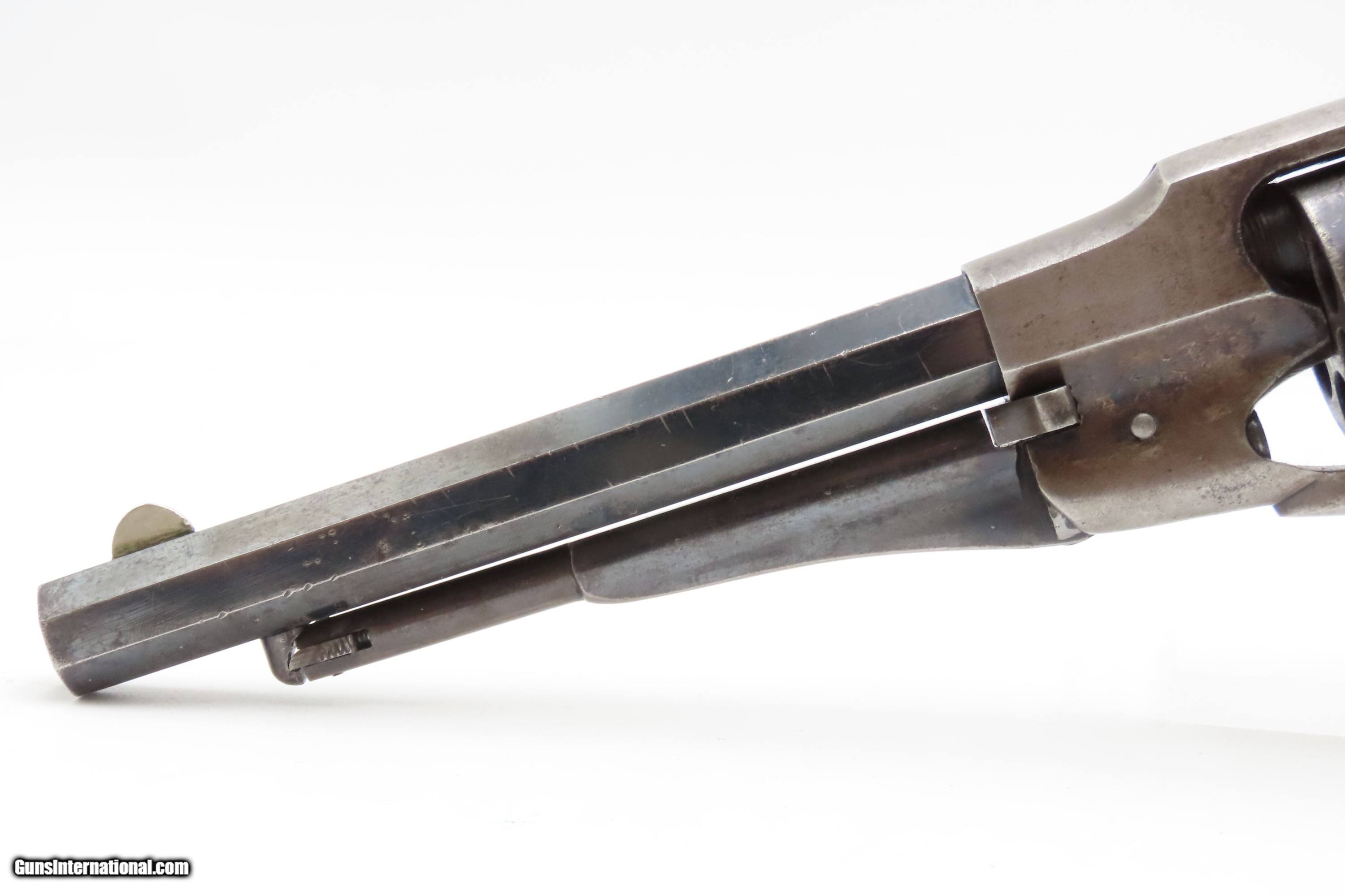 Description: Antique REMINGTON-RIDER Percussion New Model BELT Single Action Revolver SCARCE .38 CF Caliber SELF DEFENSE Revolver Here Ancestry Guns presents an antique Remington-Rider New Model Belt Percussion Revolver, made circa 1865 to 1873 in Ilion, New York. Production of this revolver started out as a single-action, percussion revolver that was produced from 1863 to 1873. These revolvers were made during a period when Smith & Wesson owned the Rollin White Patent. Companies like Remington and Colt were relegated to continue production of revolvers with the percussion firing system until the patent expired in 1869. Once this happened, companies lost no time fitting their percussion models with various cartridge conversions or incorporating this new technology at the factory. The later manufactured revolvers in this series had the ability to fire either cartridge or percussion cylinders from the same gun. It was a smaller version of the New Model Army and Navy revolver, but larger than the New Police. The revolver was a result of a collaboration between Remington Arms and Joseph Rider of Newark, Ohio. The new gun was introduced in 1863 and would remain in production for a decade, with total production between 2,500 and 3,000 revolvers per “Flayderman's Guide”. As the guns were serial numbered in the same range as the Remington New Model Single Action Revolvers, it is difficult to know for sure how many were produced, and a lack of surviving factory records make investigation into the matter difficult. The New Model Belt series of revolvers appear to be a concerted effort by Remington to produce a handy, personal, self-defense type revolver that would be at home in a belt holster or even a large overcoat pocket. This revolver features a six-shot cylinder chambered in .38 centerfire caliber and was designed for defensive carry. The overall condition is fine. Original blue barrel and cylinder finish is preserved. Original silver on the trigger guard. The bore is mostly bright with strong rifling. The action is strong, although when the muzzle is pointed up the cylinder does not index. Very good grips contain average wear. Markings are legible. Matching serial numbers on the barrel, trigger guard tang, grip frame, and both grips. Own the original! This is a legitimate antique and not a reproduction. Barrel is 6-1/2 inches. Caliber: .38 Centerfire Overall condition as seen in photos. Very Fast. Very Safe. FREE SHIPPING WORLDWIDE. Delivered directly to your door by express mail! Guaranteed AUTHENTIC & Includes CERTIFICATE OF AUTHENTICITY. $2995 #259336 Antique: Yes Price: $2,995.00 Buy Now Pay with