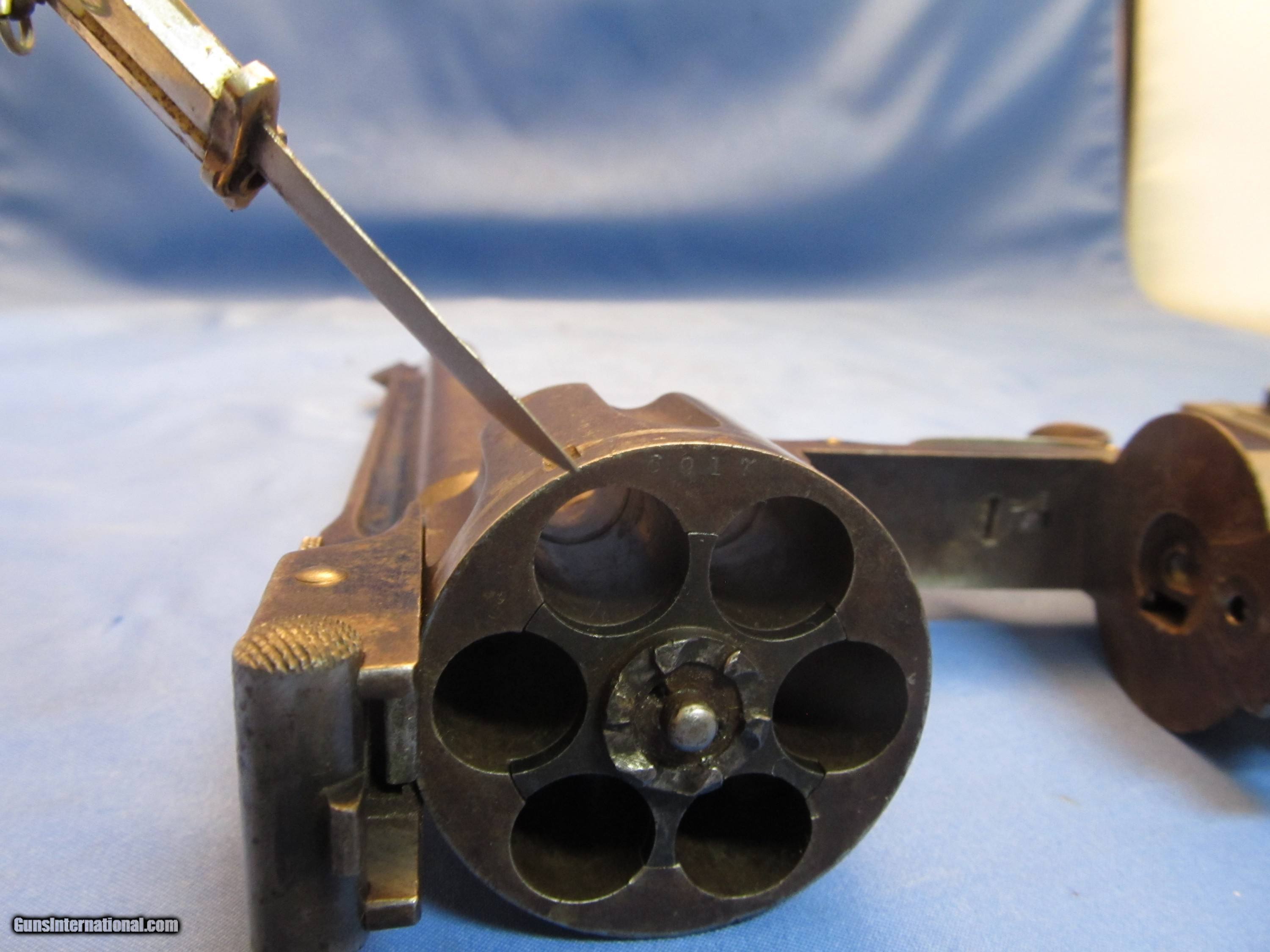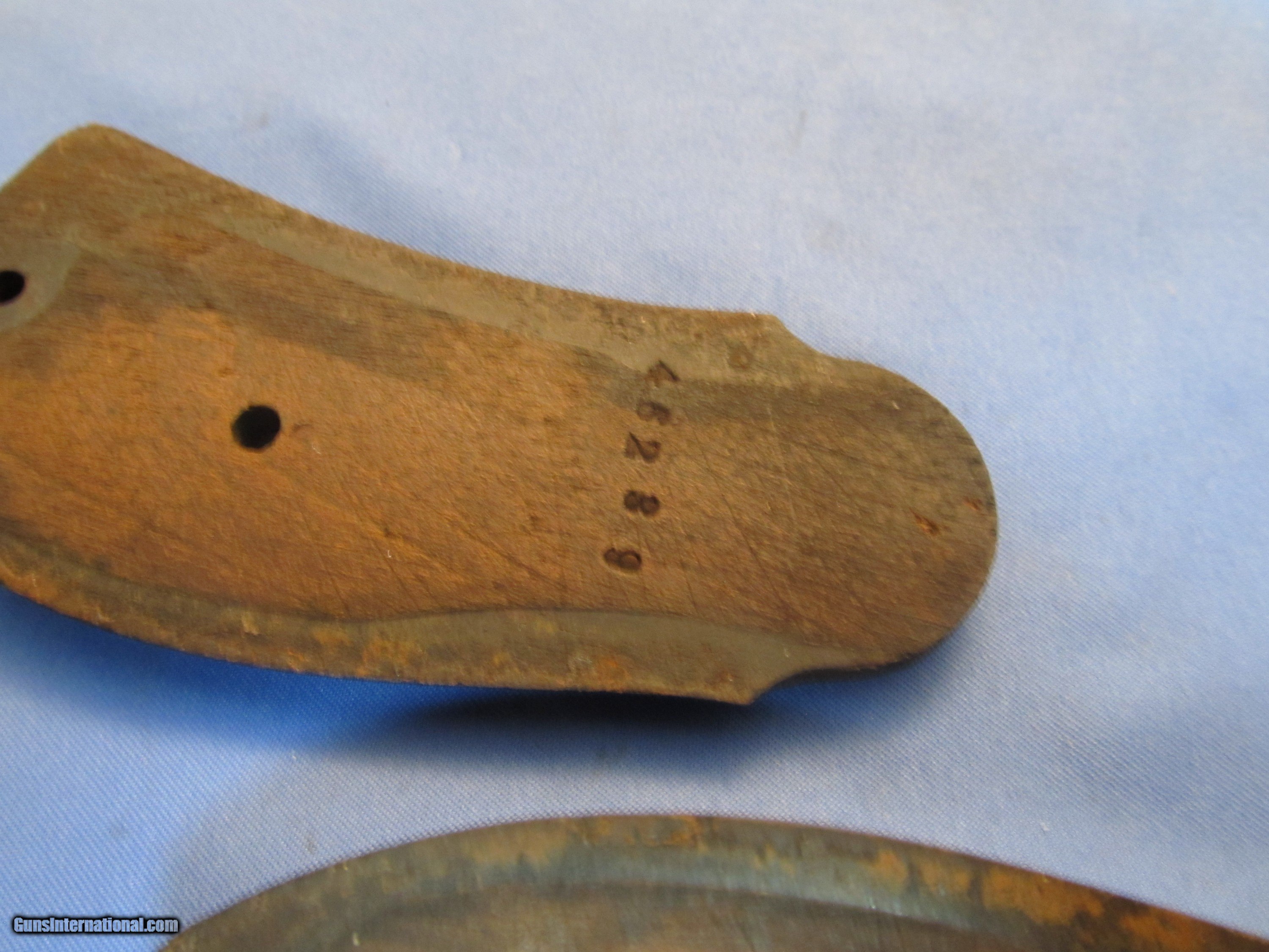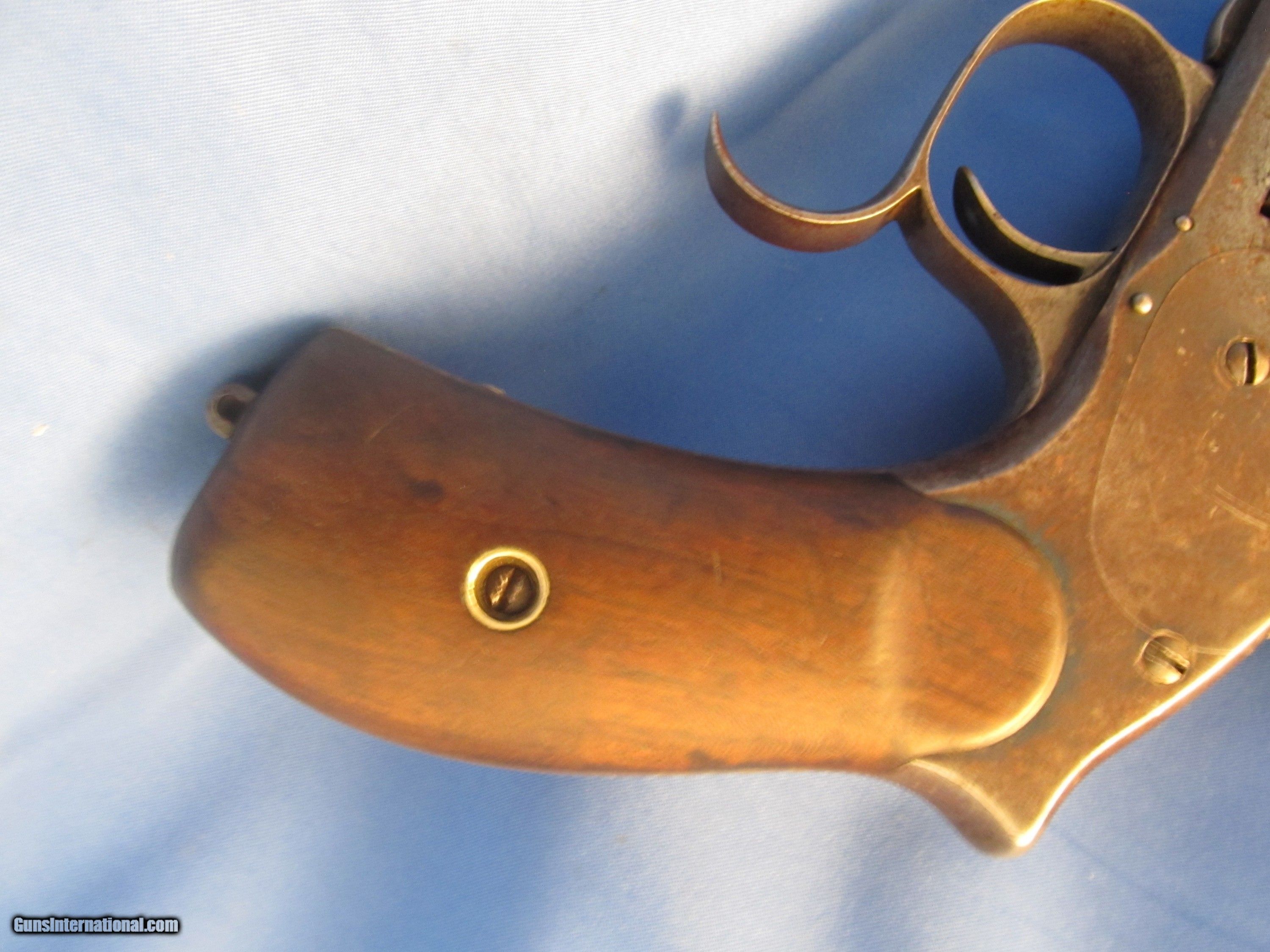 Description: THIS IS AN ANTIQUE SMITH & WESSON 3RD MODEL 3 44 RUSSIAN CAL REVOLVER WE BELIEVE SHE WAS PRODUCED BETWEEN 1874-1878 SHE HAS THE SLIGHTEST OF BARREL WOBBLE (COMMON) THE SERIAL NUMBERS "46239" OF THE FRAME AND GRIPS MATCH. THE NUMBERS CYLINDER, METAL STAMP (UNDER THE GRIP) AND LATCH ALL MATCH WITH A DIFFERENT NUMBER AS THEY SHOULD ON THIS MODEL THE BORE OF THE 6-1/2" BARREL RIFLING IS BETTER THAN 60% THE BLUE FINISH IS GONE REPLACED WITH A RUST PLUMB WITH PATCHES OF LIGHT PITTING THE WOOD GRIPS ARE INTACT WITH THE WOOD TO METAL MARRIAGE BEING PRICICE SHE COCKS, CLICKS AND SLAMS LIKE SHE SHOULD. IF YOU WOULD LIKE MORE PHOTOS ASK "BEFORE" YOU BUY AS SHOWN IN THESES MANY CLOSE UP PHOTOS WITH NOTHING ELSE UNDERSTAND THAT WE WILL PUT A SIGNATURE ON THE PACKAGE SO IT WON'T GET LEFT ON A PORCH BUYER PAYS A FIXED AMOUNT OF 35.00 INSURED SHIPPING TO THE LOWER MAINLAND STATES, ALASKA, HAWAII OR PUERTO NO SHIPMENTS OUTSIDE THE USA. MISSOURI RESIDENTS DO PAY A 8.575% SALES TAX. NO EXTRA CHARGE FOR CREDIT CARDS BRANDON'S GUN TRADING CO LLC 321 EAST 20TH ST JOPLIN MO. 64804 (417)-623-8787 FAX (417)-623-2326 9-5 TUESDAY-SATURDAY CENTRAL TIME WE ARE ALSO CLOSED THE 1'ST SATURDAY OF EVERY MONTH AND HOLIDAYS. OUR INVENTORY REFERENCE: CONSIGNMENT PLEASE NOTE, UPS SERVICE HAS GOTTEN SO BAD UNDER CURRENT MANAGEMENT THAT WE WON’T SHIP UPS UNLESS WE ABSOLUTELY HAVE TOO. WHEN WE DOUBLE PACK, INSURE, ADD SIGNATURE, USE GOOD BOXES AND UPS EVEN NOTES THEY DAMAGED THE ITEM AND THEY STILL WON'T PAY. ALSO, ANY INSURANCE WE DO PUT ON OUR PACKAGES IS VOID IF YOU OR YOUR DEALER THROWS AWAY THE BOX, ANY PACKING MATERIALS OR FAILS TO PICTURE AND NOTIFY US AND THE SHIPPING COMPANY IMMEDIATELY SOLD Antique: Yes Handgun Caliber: .44 S&W Russian Manufacturer: S&W Model: # 3 RUSSION 3RD MODEL Barrel Length: 6-1/2 Manufacture Date: 1874-1878? Item Location: Missouri |