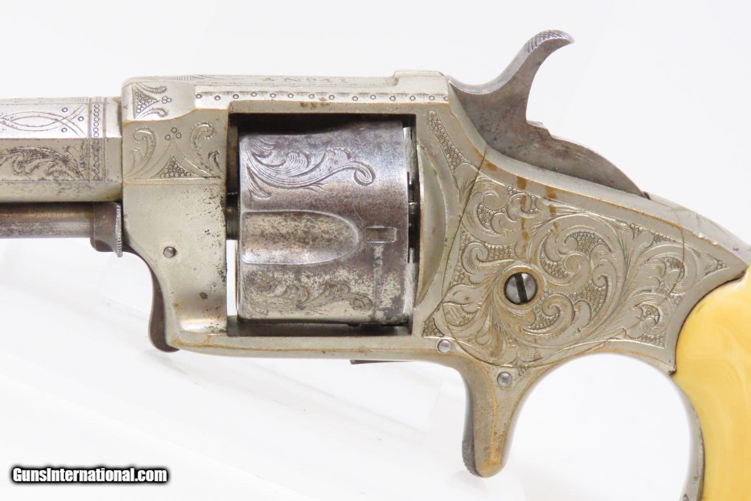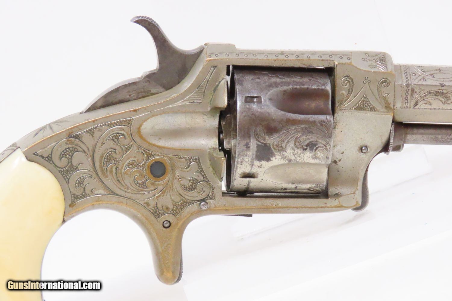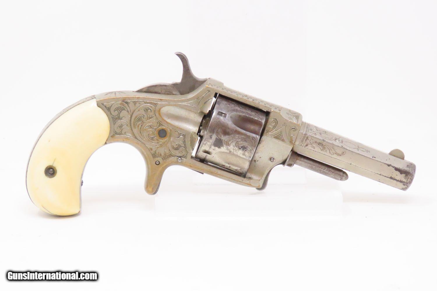 Description: Antique US ARMS Co. Spur Trigger No. 41 .41 Cal. RIMFIRE WILD WEST Revolver Hideout Revolver with IVORY GRIPS! Here we present an antique U.S. Arms Company “No. 41” Spur Trigger Pocket Revolver, made circa 1880. These pocket-sized revolvers and many like them were made by various companies such that the price easily undercut better known and established companies like Colt. As a result, many of Colt’s similar lines were shut down for their inability to compete. During a time when many, if not most people carried a firearm, these affordable little revolvers were small enough to conceal and carry, yet provide some level of protection or peace of mind, even when the town did not allow firearms within its limits. The overall condition is very fine. Original nickel finish. The action is strong and tight all around. The bore is in good shape. The floral scrollwork and line motifs are sharp throughout. Nice ivory grips. A handsome little revolver! This is a legitimate antique and not a reproduction. Barrel is 3 inches. Caliber: .41 rimfire Overall condition as seen in photos. Very Fast. Very Safe. FREE SHIPPING WORLDWIDE. Delivered directly to your door by express mail! Guaranteed AUTHENTIC & Includes CERTIFICATE OF AUTHENTICITY. ancestryguns $1145 #201500 SOLD Antique: Yes |