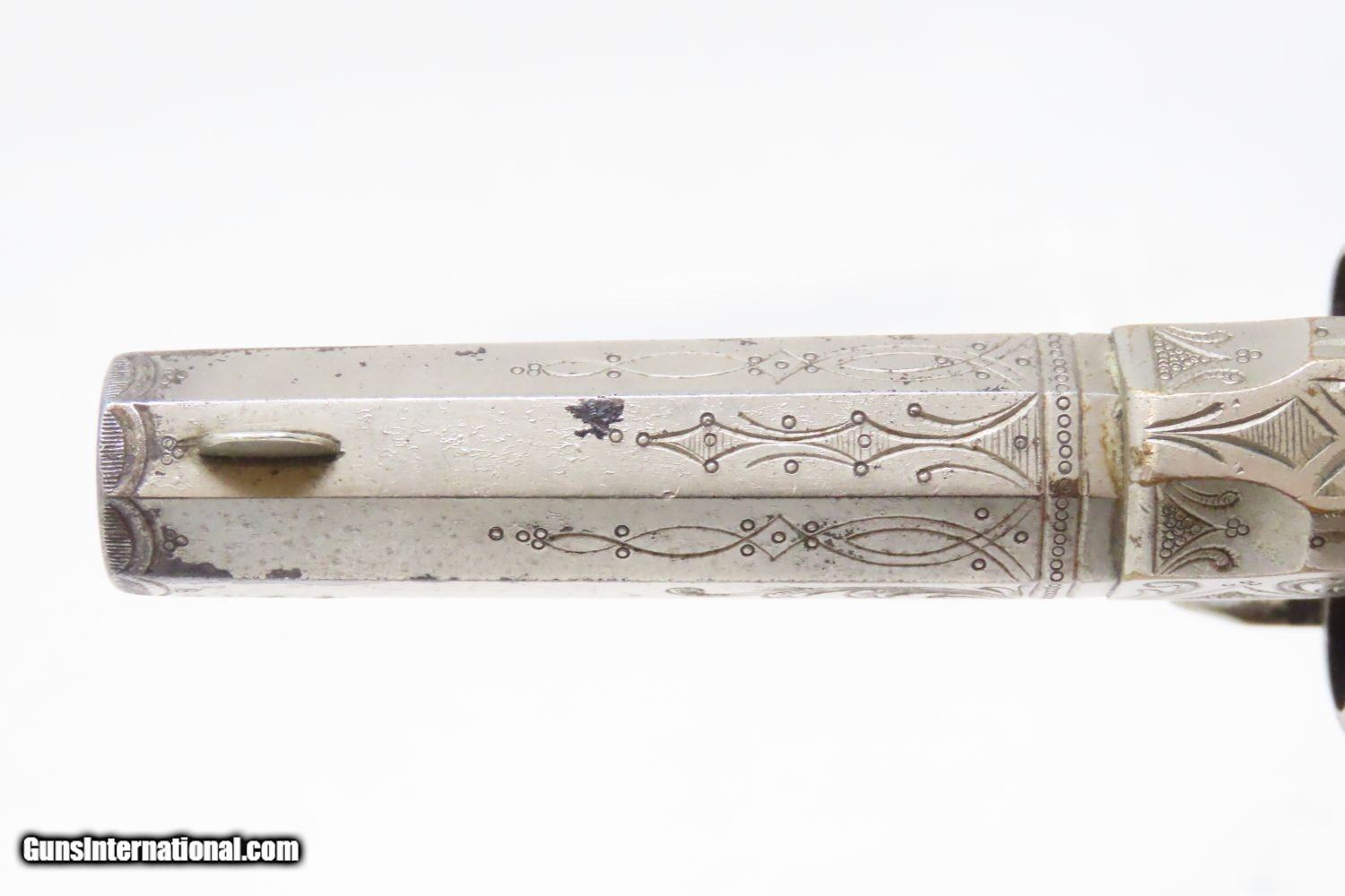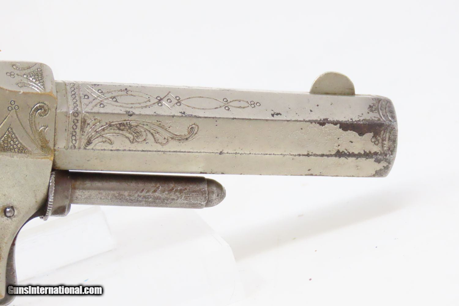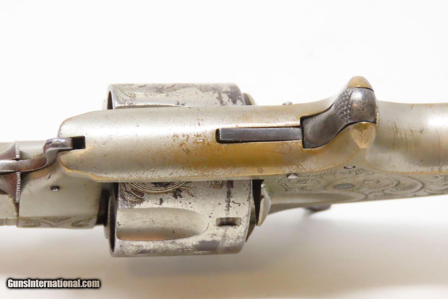 Description: Antique US ARMS Co. Spur Trigger No. 41 .41 Cal. RIMFIRE WILD WEST Revolver Hideout Revolver with IVORY GRIPS! Here we present an antique U.S. Arms Company “No. 41” Spur Trigger Pocket Revolver, made circa 1880. These pocket-sized revolvers and many like them were made by various companies such that the price easily undercut better known and established companies like Colt. As a result, many of Colt’s similar lines were shut down for their inability to compete. During a time when many, if not most people carried a firearm, these affordable little revolvers were small enough to conceal and carry, yet provide some level of protection or peace of mind, even when the town did not allow firearms within its limits. The overall condition is very fine. Original nickel finish. The action is strong and tight all around. The bore is in good shape. The floral scrollwork and line motifs are sharp throughout. Nice ivory grips. A handsome little revolver! This is a legitimate antique and not a reproduction. Barrel is 3 inches. Caliber: .41 rimfire Overall condition as seen in photos. Very Fast. Very Safe. FREE SHIPPING WORLDWIDE. Delivered directly to your door by express mail! Guaranteed AUTHENTIC & Includes CERTIFICATE OF AUTHENTICITY. ancestryguns $1145 #201500 SOLD Antique: Yes |
