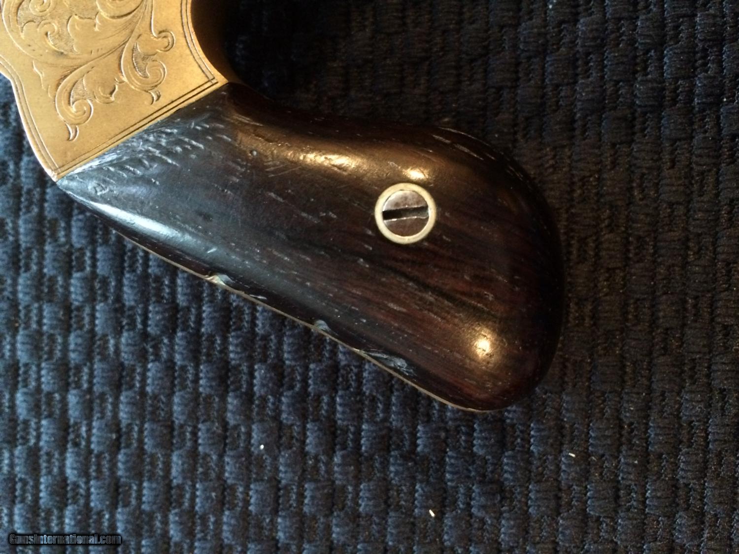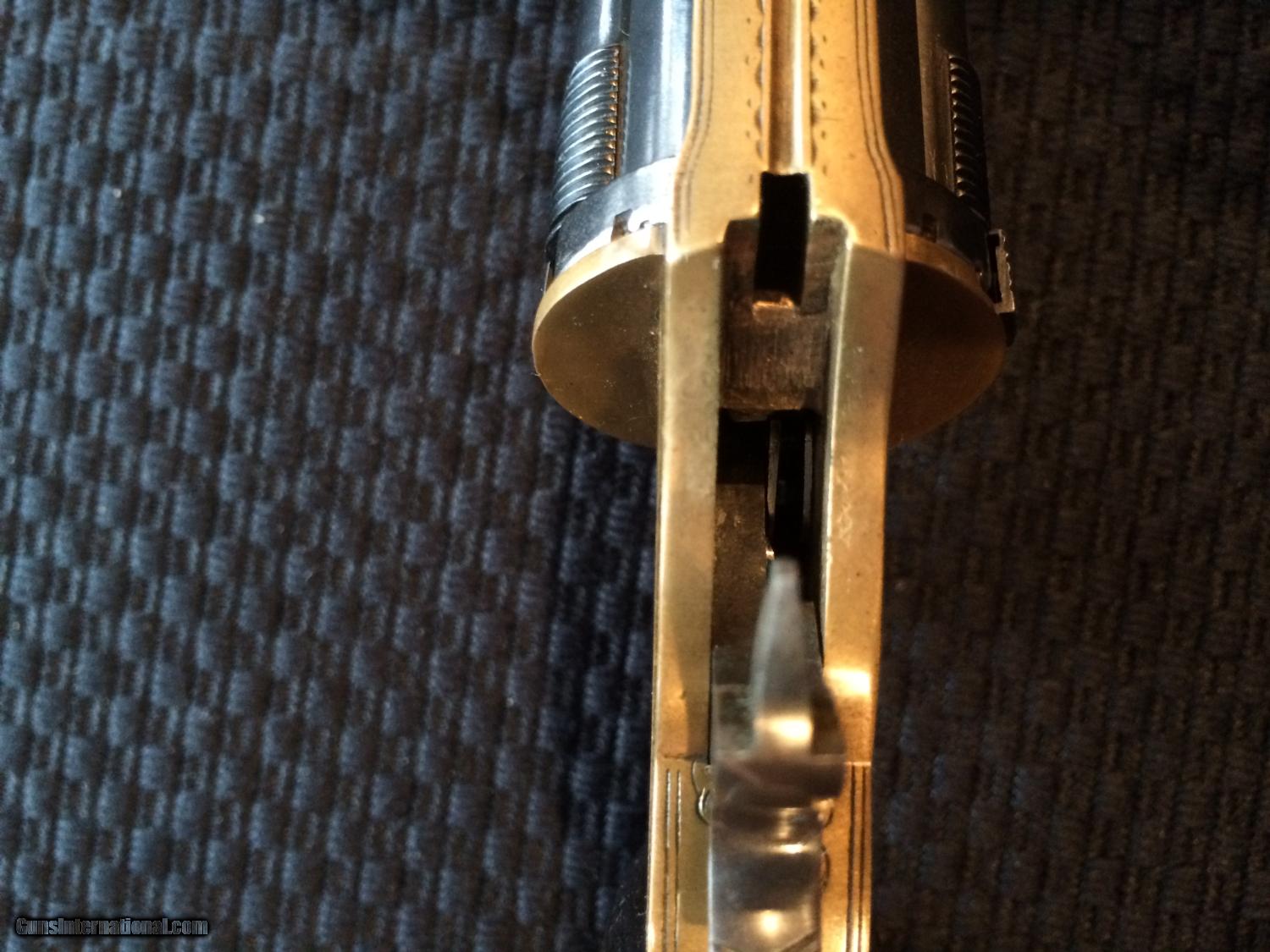 Description: This revolver has bein in the family for over 75 years. It is a civil war item from 1863 to 1864. Serial number 5075. This gun is in very good shape and apers to be hardly shot. The gun was never shot during our ownership there might be an issue with the firing mechanism.This is a collectible should be check out by a gunsmith if to be shot. The date on the barrel is April 14Th. 1883. The gun is pretty clean all blueing is in very good condition, a little ware on cylinder. Great part of history to have. SOLD Antique: Yes Manufacturer: B.A Co. Brooklyn Arms Co. Model: Slokum Revolver Caliber Info: .32 Condition: Excellent Metal Condition: Excellent Wood Condition: Excellent Barrels: One round Action: Revolver Triggers: one- suicide Finish: Brass/ Blue Engraving: Yes Item Location: New Jersey |