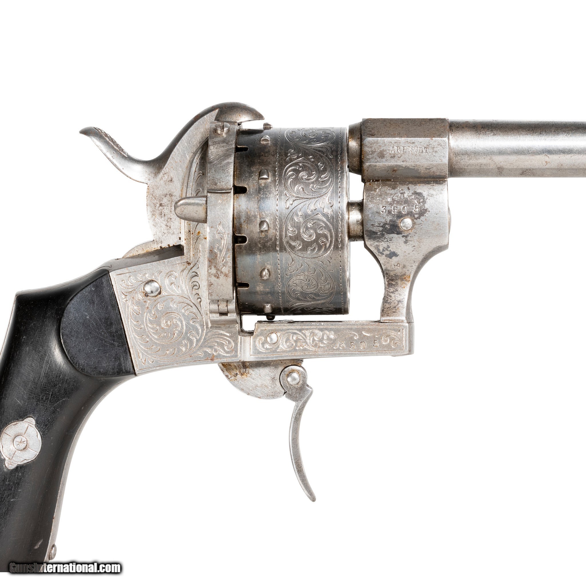 Description: Belgian 12-shot pinfire revolver marked "Arendt. 4 3/4" barrel with engraved cylinder and receiver." Spangled "ELG" in an oval proof marked on cylinder. Serial Number 3505. 1857-1889. SOLD Antique: Yes Manufacturer: Belgian Arendt Serial Number: 3505 |