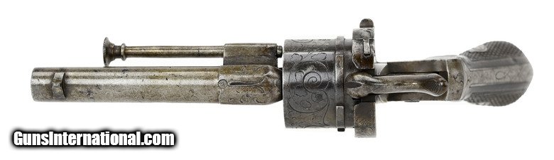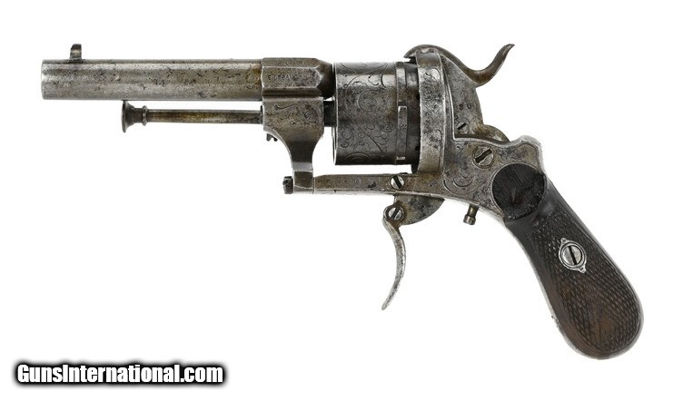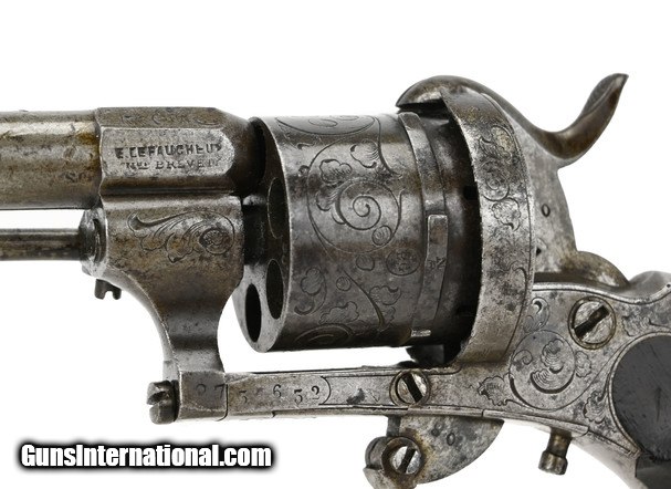 Description: Belgian LeFaucheux Pinfire Revolver. Bore is approximately .30 caliber. Barrel is 3 3/8”. Side of cylinder has Belgian proofs. Left side of barrel is marked “E. LeFaucheux Brevett”. Frame and cylinder have floral engraving. Metal has a brown and gray patina. Action works. SOLD Antique: Yes |