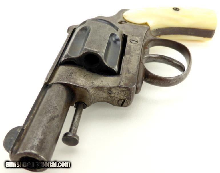 Description: Belgian revolver, 9mm caliber. Very unusual design. Cylinder opens to the left and removes by opening the loading gate and pushing down on the open gate which moves a small block and allows the cylinder swing out. The gun is hammerless double action. Gun has fine factory pearl grips. Gun is unmarked except for proof marks. Neat revolver! SOLD |