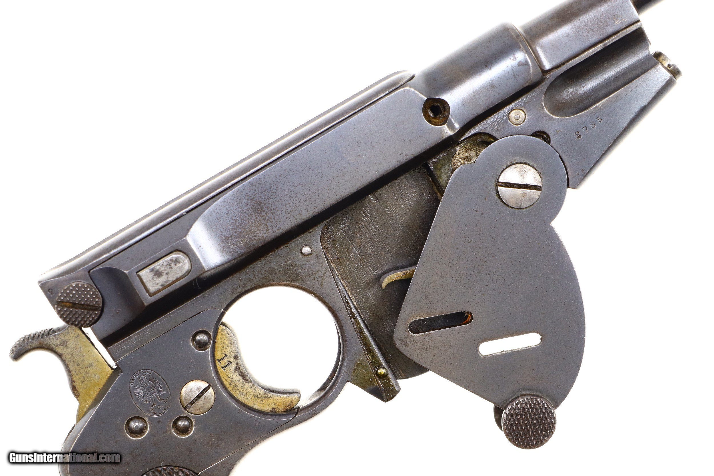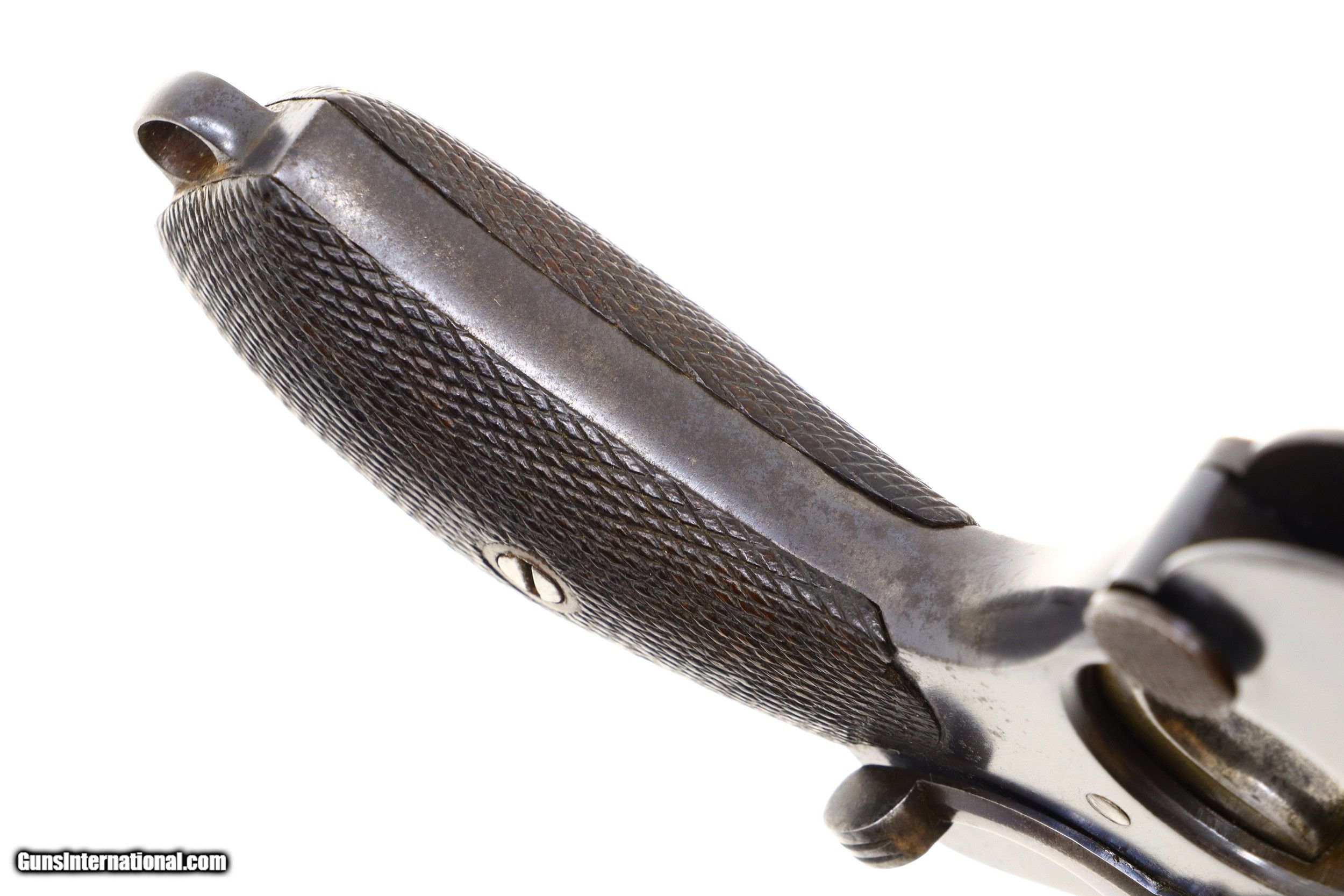 Description: The Bergmann M1896, No.4, in 8mm, reflected Bergmann's earliest effort to make a large caliber pistol, based on the standard M1896 frame and blowback mechanism. These pistols, only 200-300 made, can be easily distinguished by their larger diameter barrel and the bore/gauge marking of "156/14" on the left side. The pistol is otherwise as per the later M1896, No. 3 with a drift adjustable front sight, notched rear sight, bolt with extractor and broad grip. Crown/C/U marking on the left side of the barrel and barrel extension. The left side of the frame with patent reference. The right side of the pistol has the Gagenau/Miner/VCS/ Suhl marking on the sideplate and the serial number on the forward frame. Small parts numbered to facilitate disassembly. Checkered walnut grips. Fixed lanyard loop. Major components rust blued. Small parts strawed or fire blued. Synopsis: Bergmann M1896, No. 4, cal. 8mm, #2785, PCA-143, ANTIQUE Condition: VG+ original finish with fading and oxidative flecking as carefully pictured, front and back strap etched and toned. Comparable condition small parts and grips, darked, stained and with superficial handling marks, showing no suggestion of enhancment. Bright bore with sharp rifling. Perfect manual mechanics. An exceedling scarce Bergmann, rarely offered for sale, especially nice that it is an ANTIQUE! ~~Insured shipping fee of $155; most packages shipped using FedEx 2nd Day.~~ SOLD Handgun Caliber: 8mm French Ordnance (8mm Lebel Revolver) Manufacturer: Bergmann Serial Number: 2785 Caliber Info: 8mm |